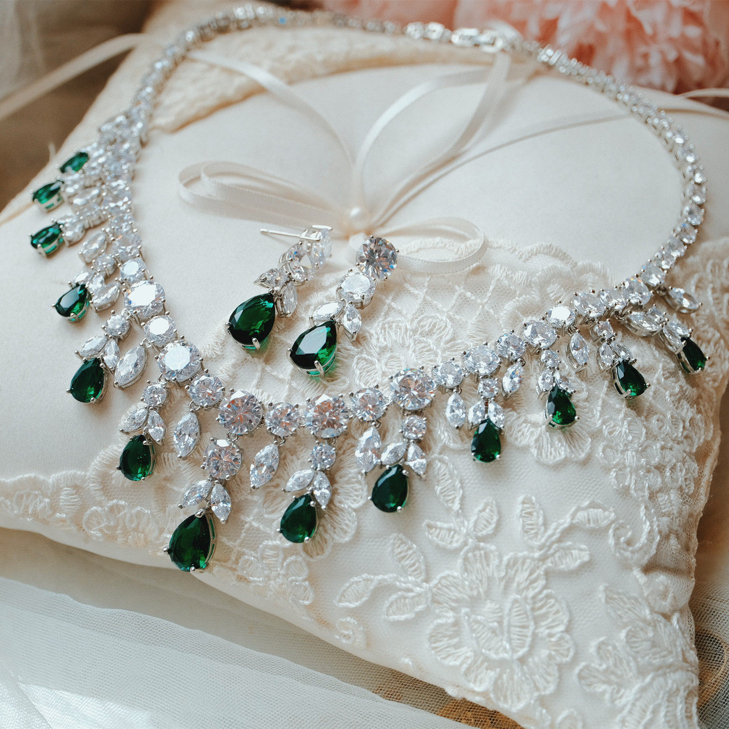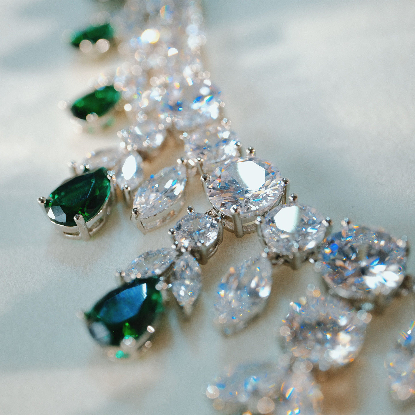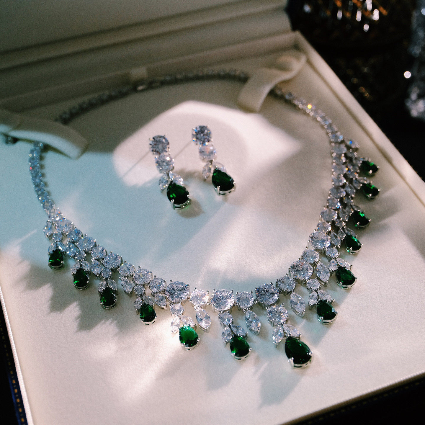 法式轻奢高级感晚宴礼服大气蓝色复古仙女小众新娘祖母绿色项链
