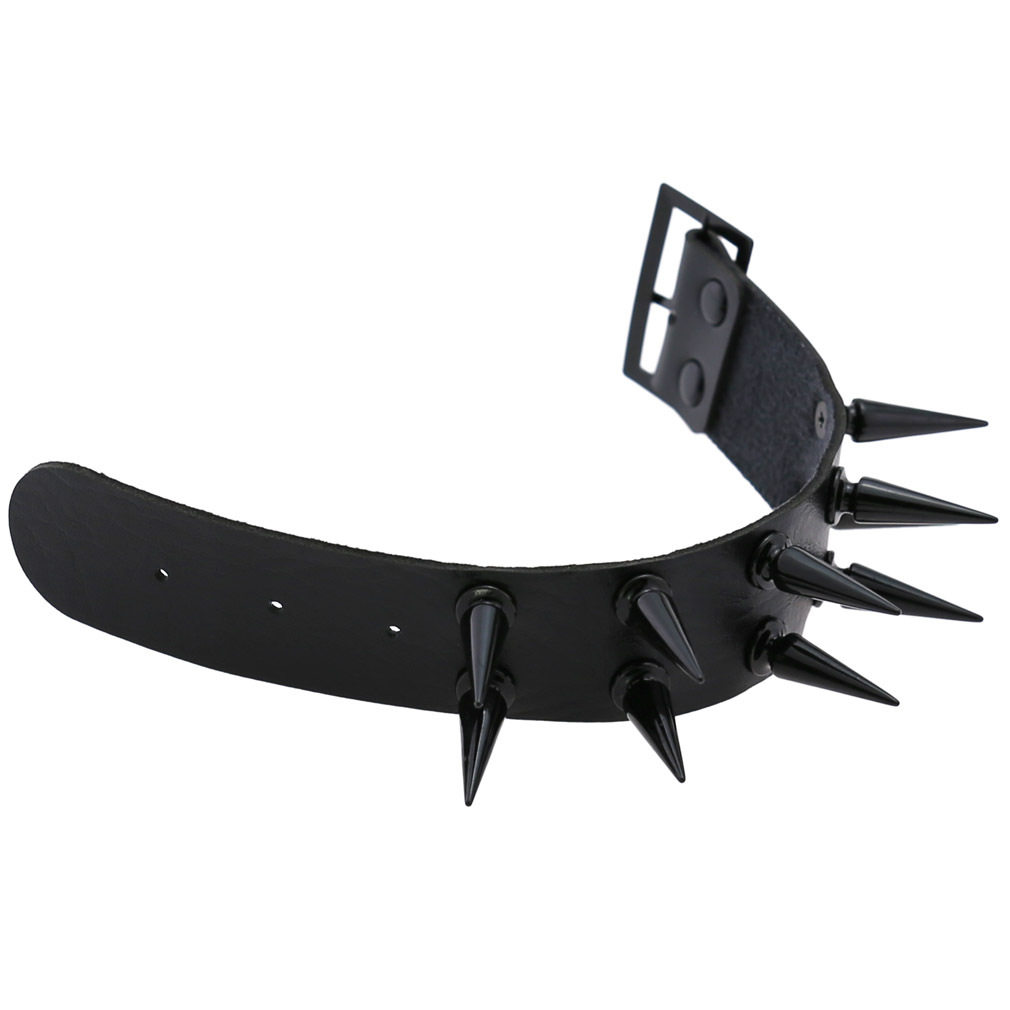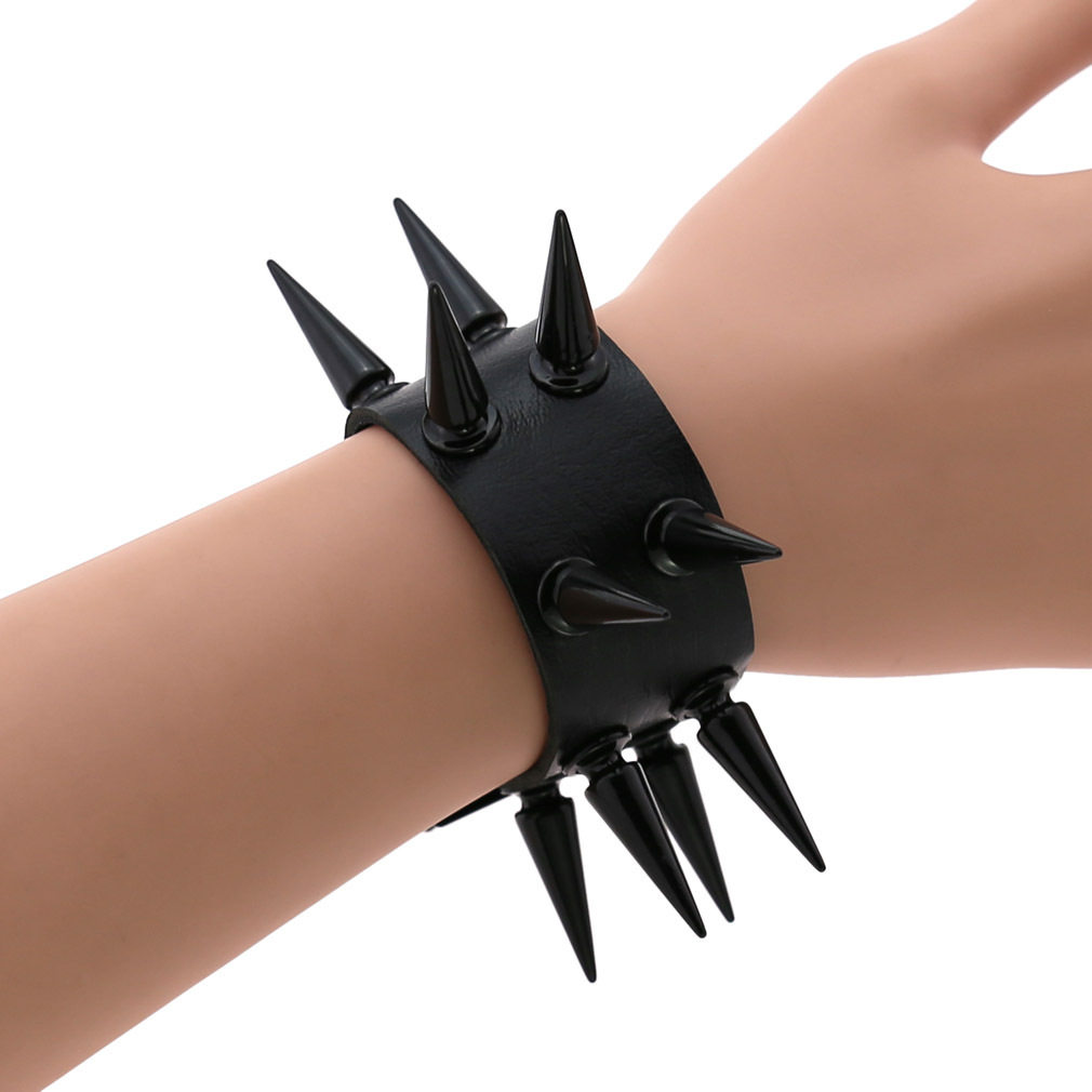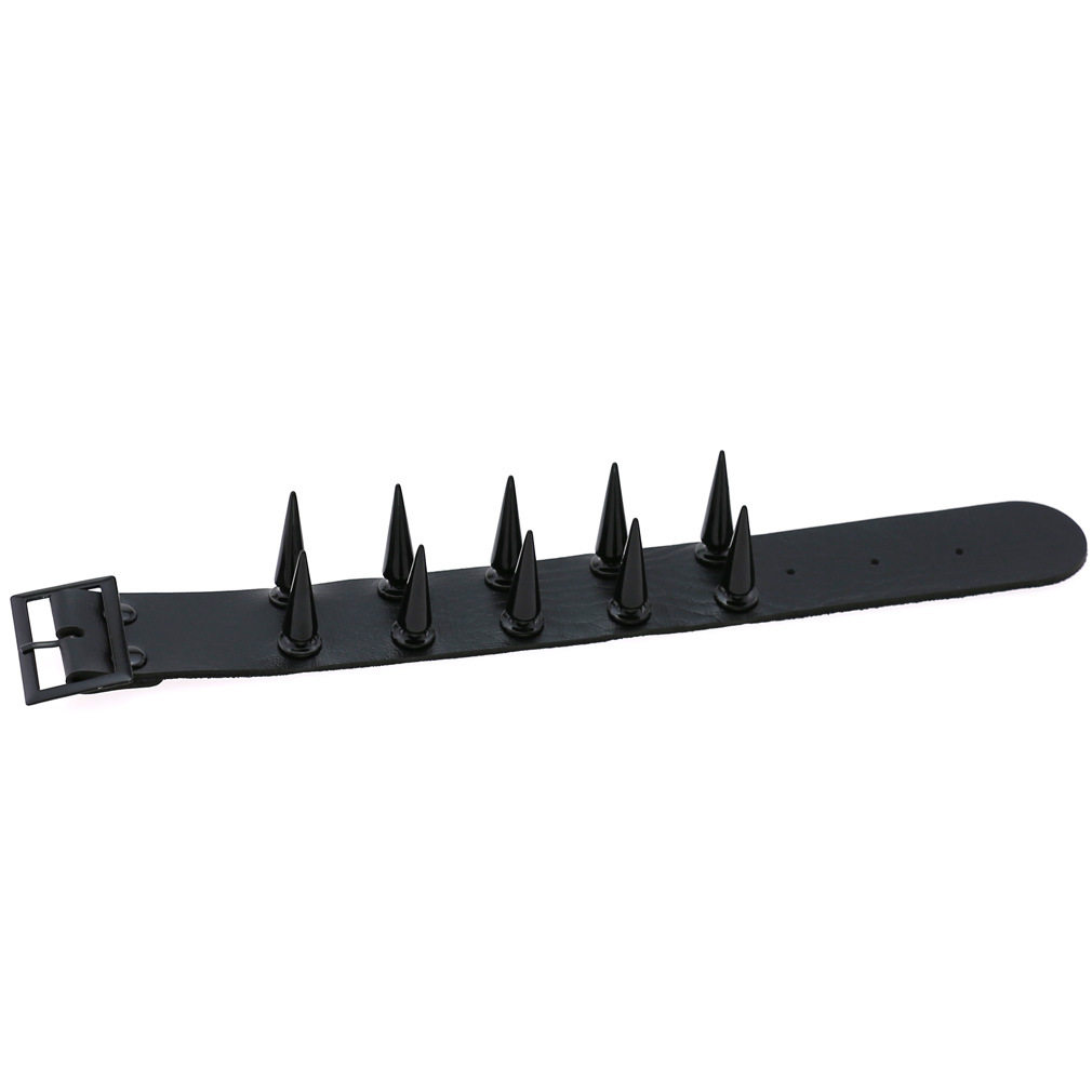 新款朋克非主流个性夸张黑色尖钉双排PU皮质宽手镯手环护腕手链男