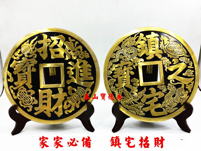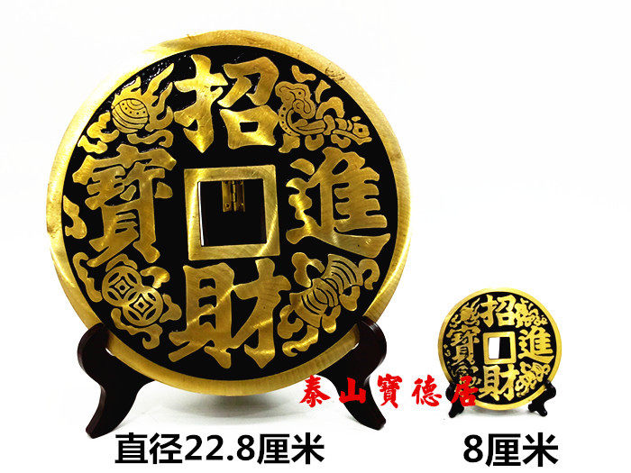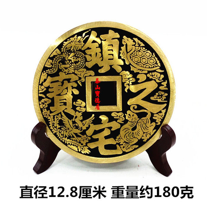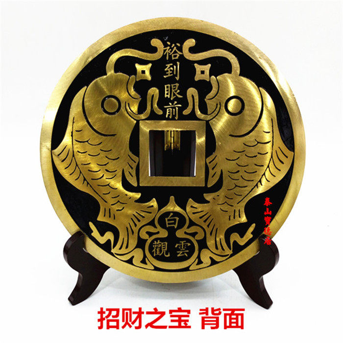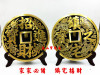 黄铜招财进宝大铜钱镇宅之宝摆件双剑双鱼黑色带支架底座客厅礼品