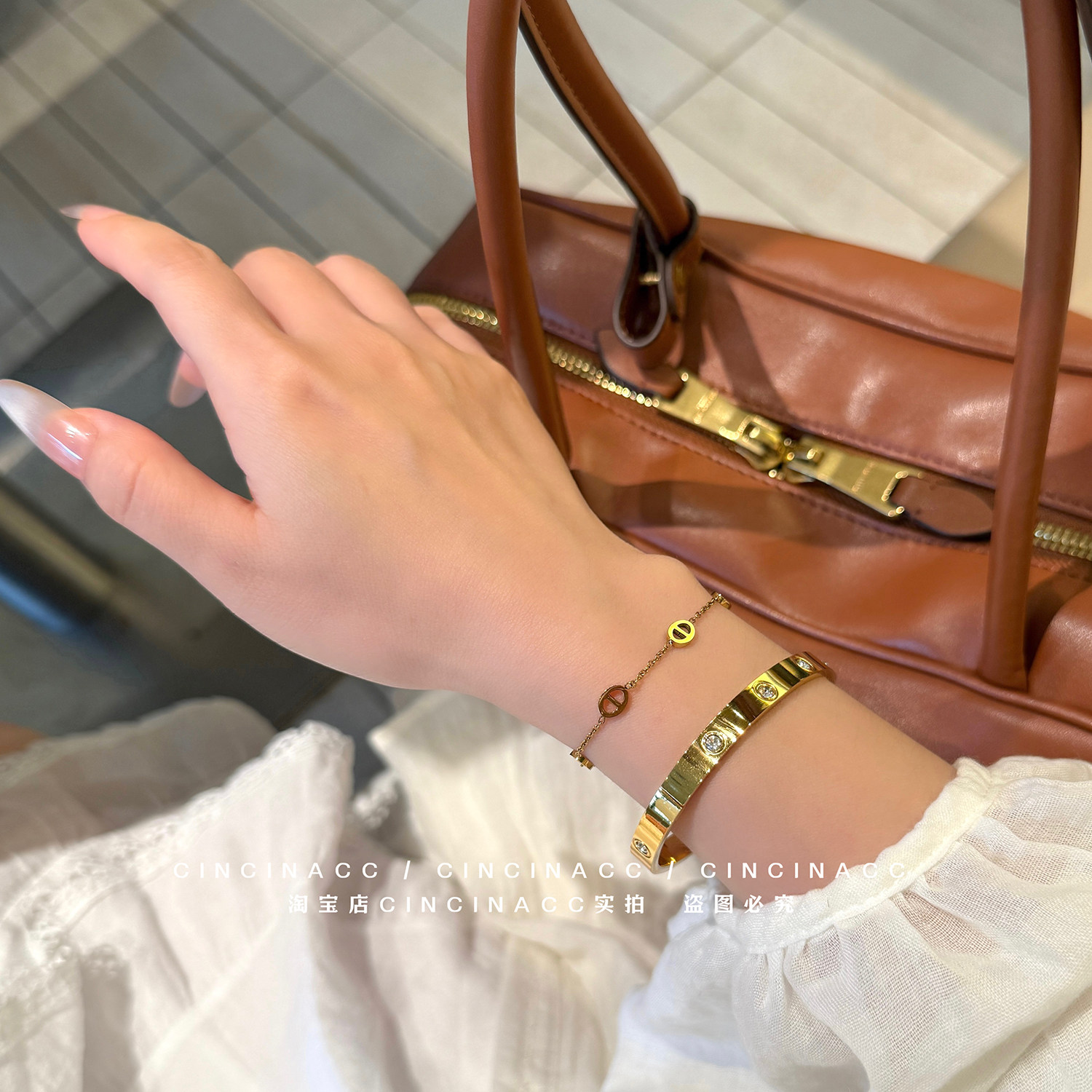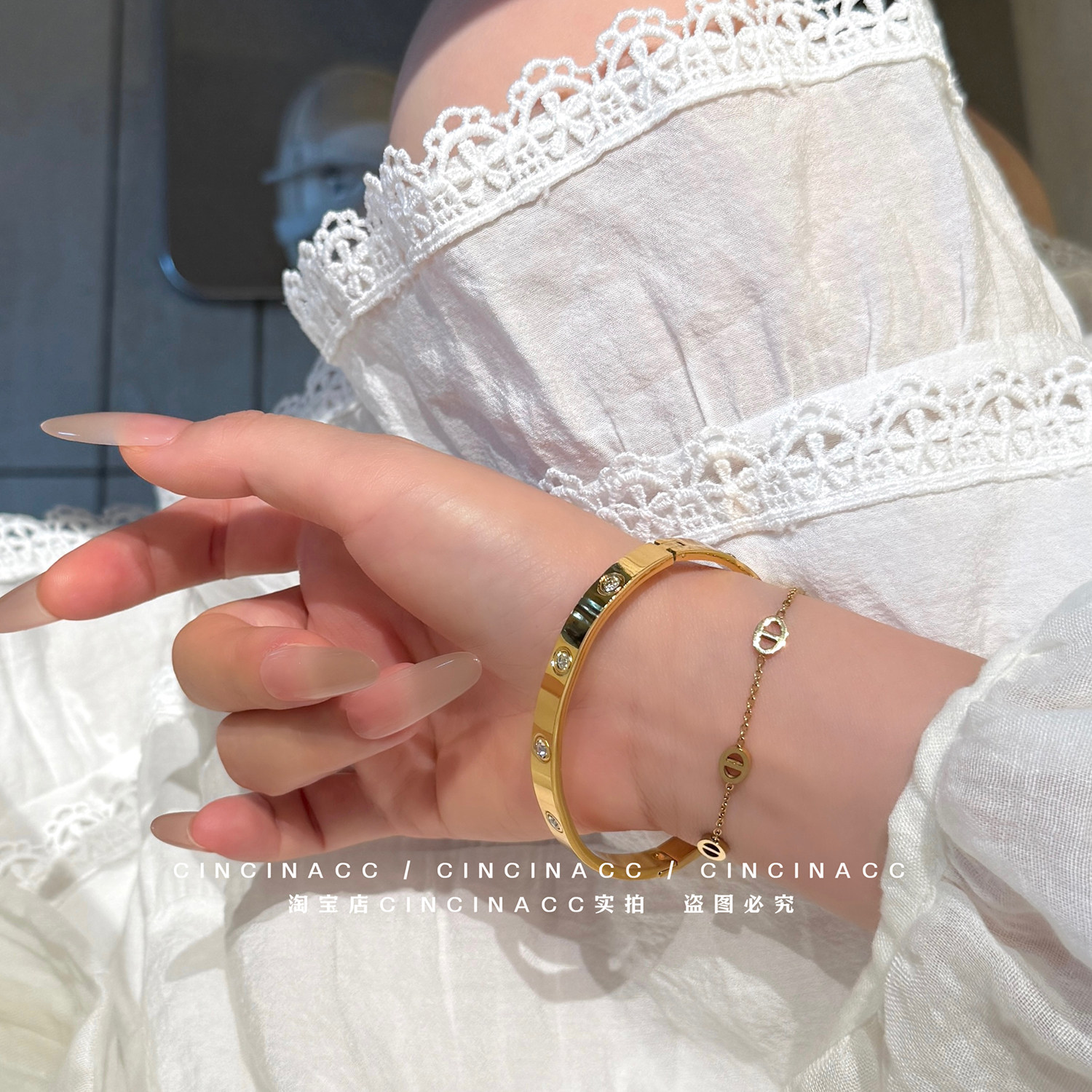 洗手不用摘!不掉色锆石叠戴手镯18k金时尚手环女高级感钛钢手链