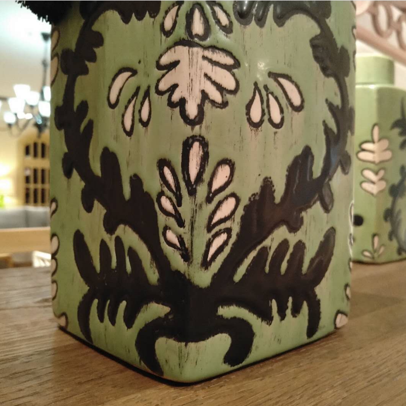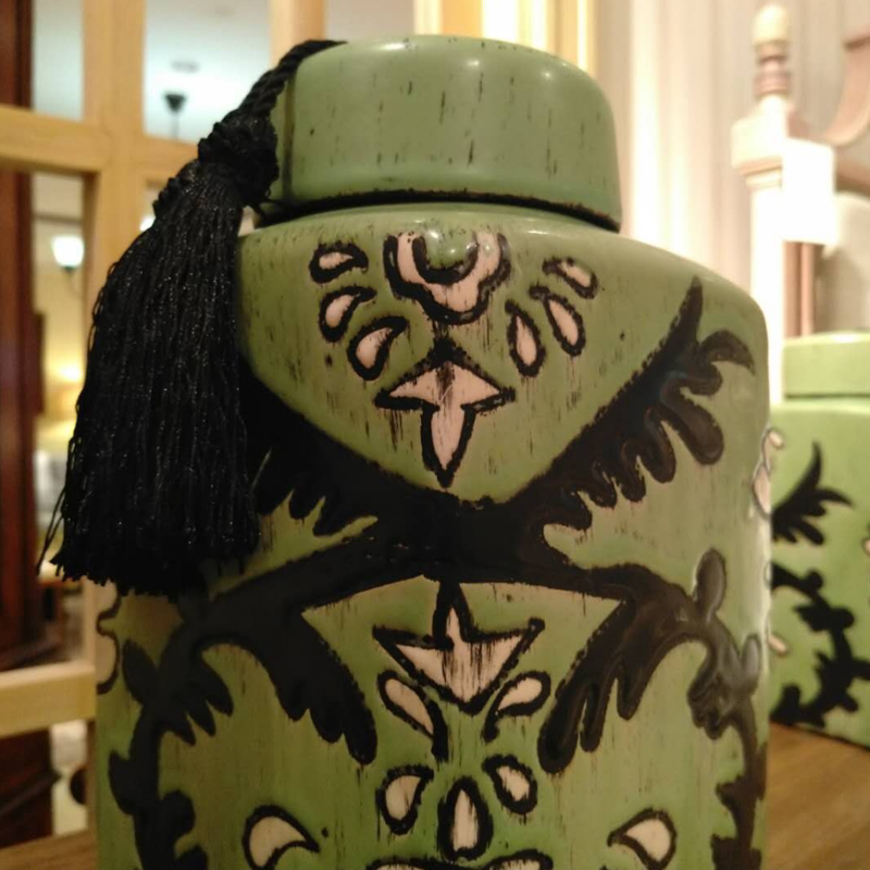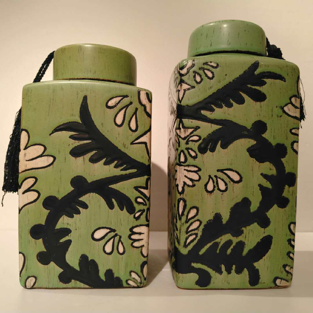 正版现货现代中式绿色复古陶瓷做旧花纹茶叶罐装饰瓷罐摆件