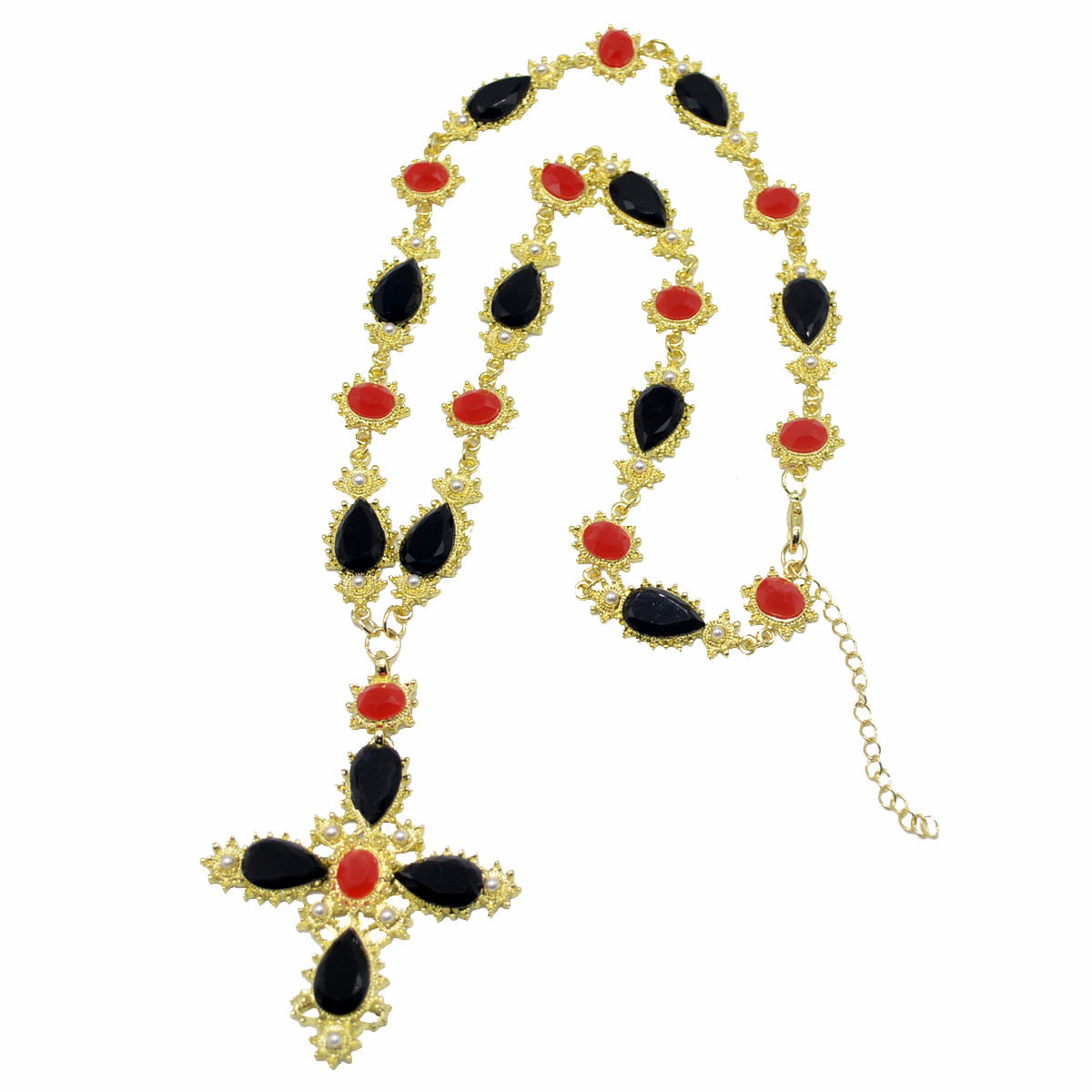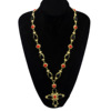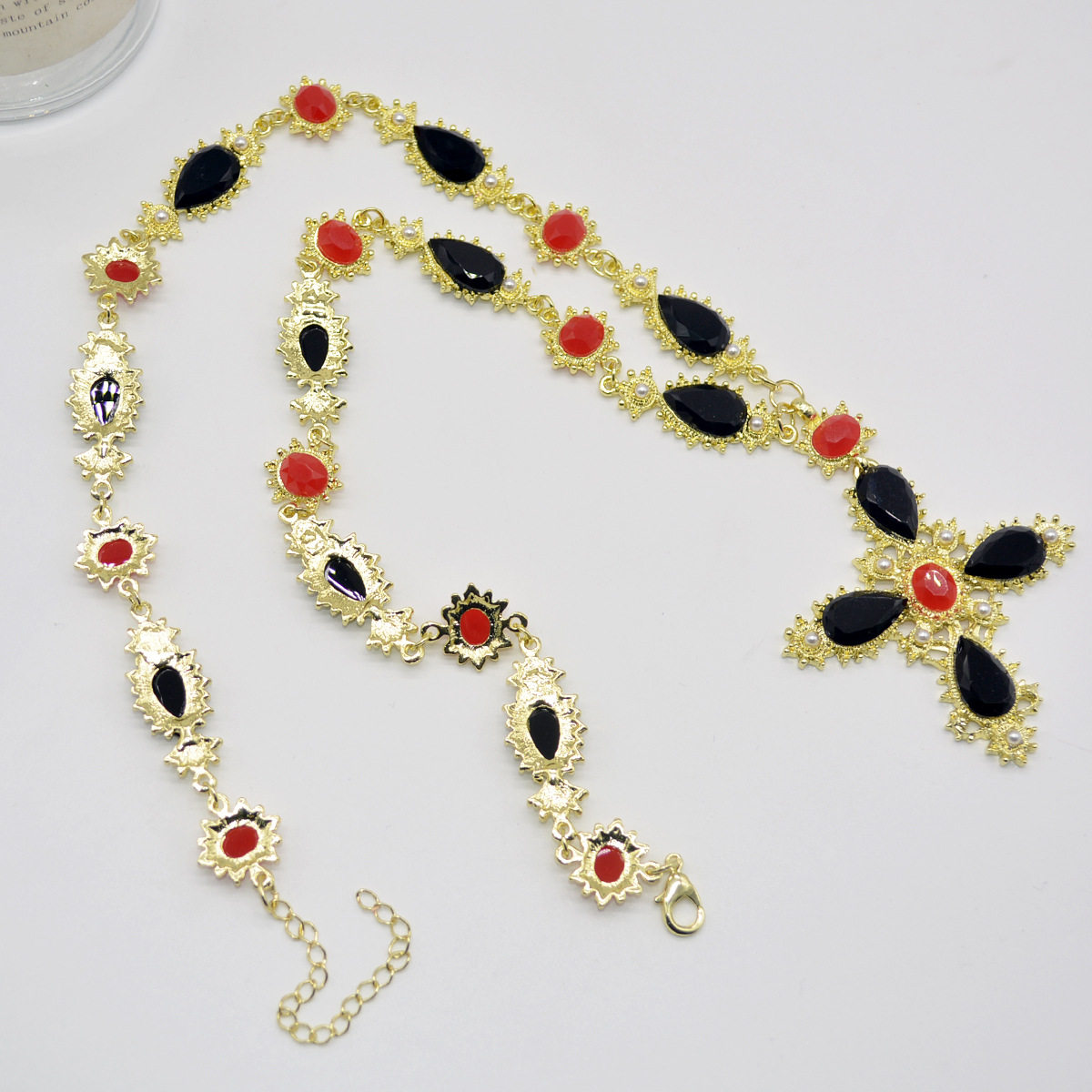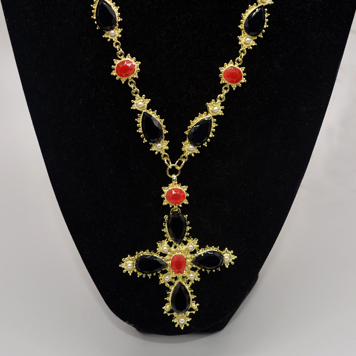 复古设计感黑色红色宝石拼接项链夸张十字架吊坠毛衣链欧美风颈链
