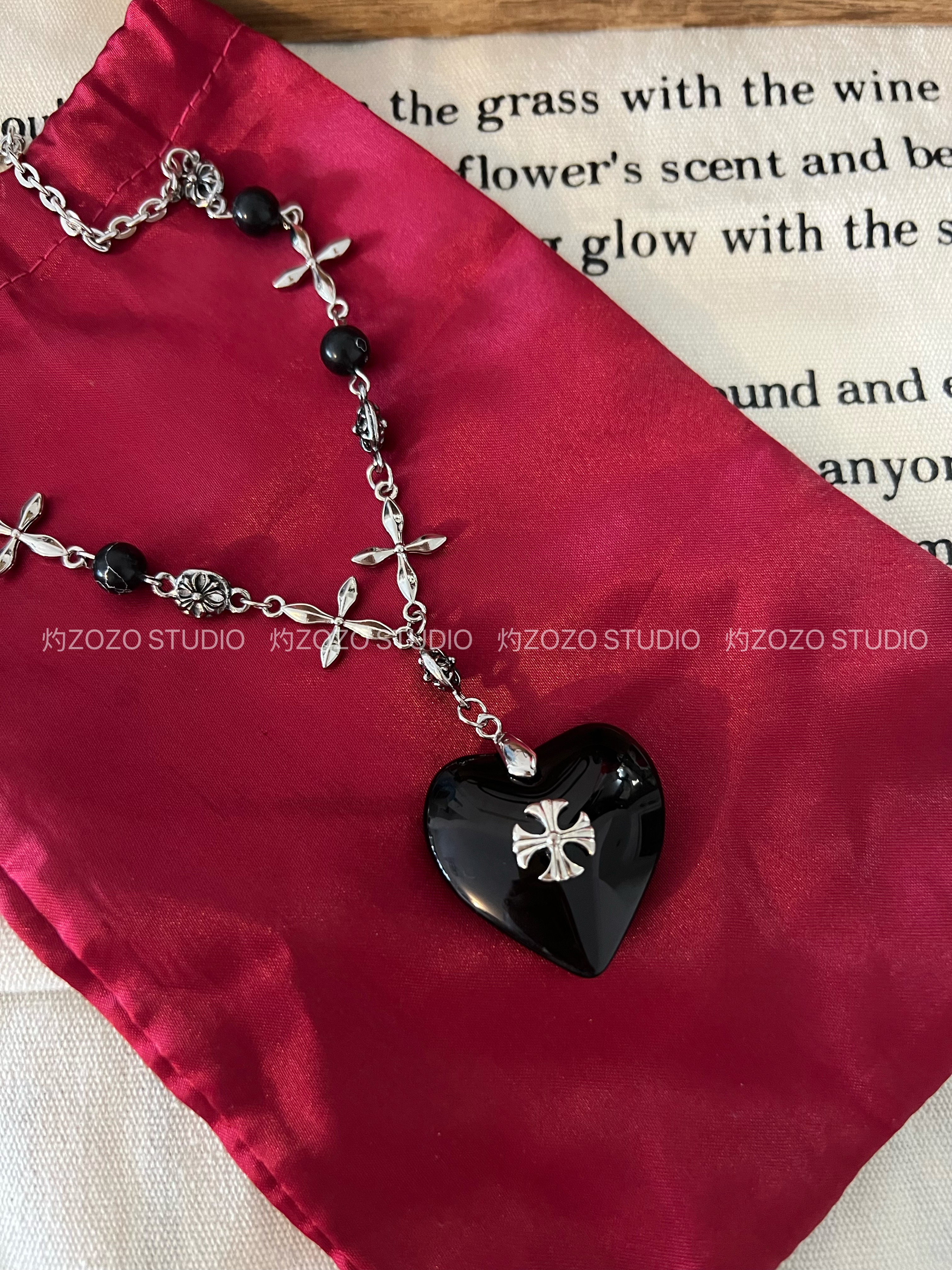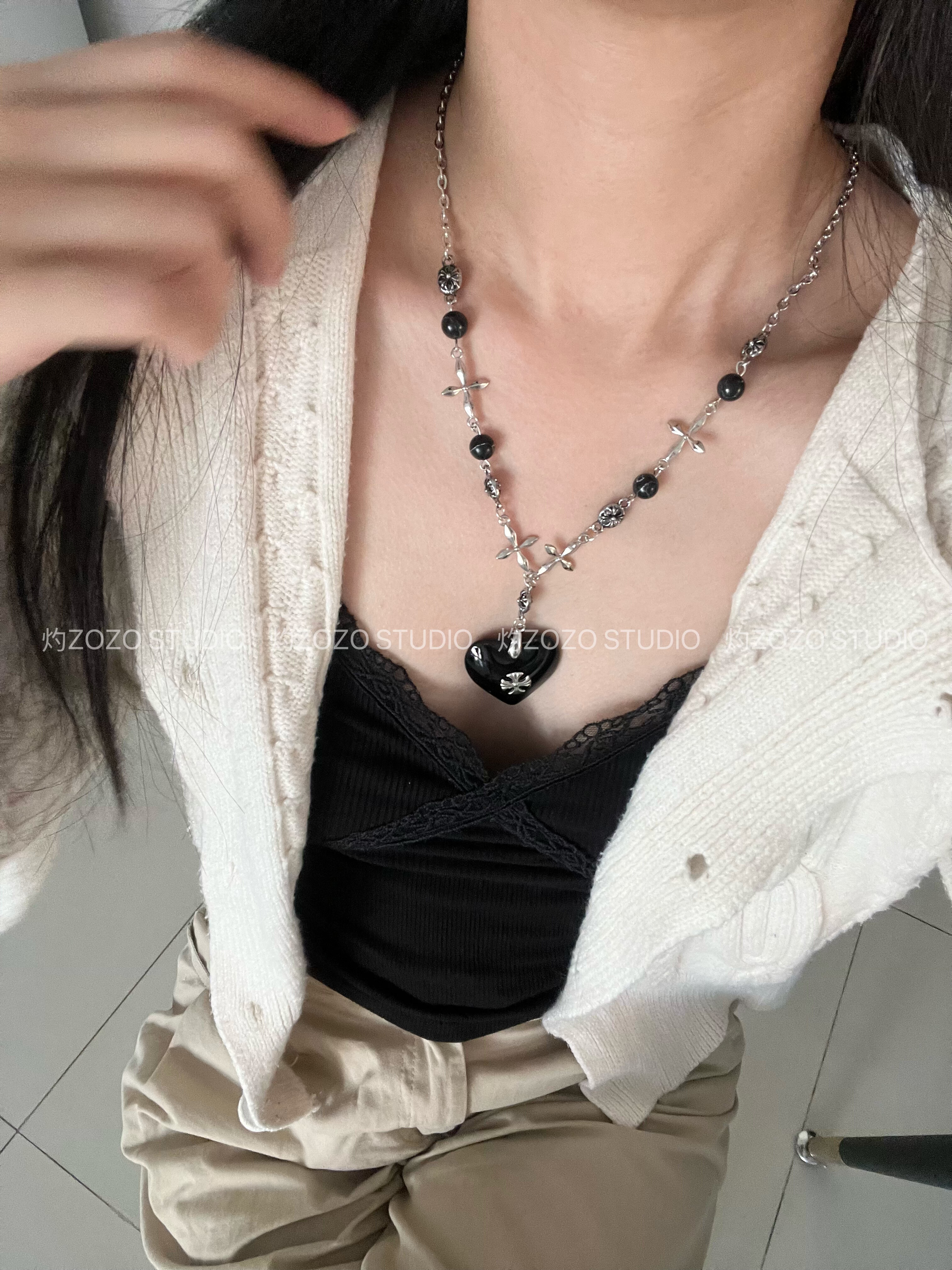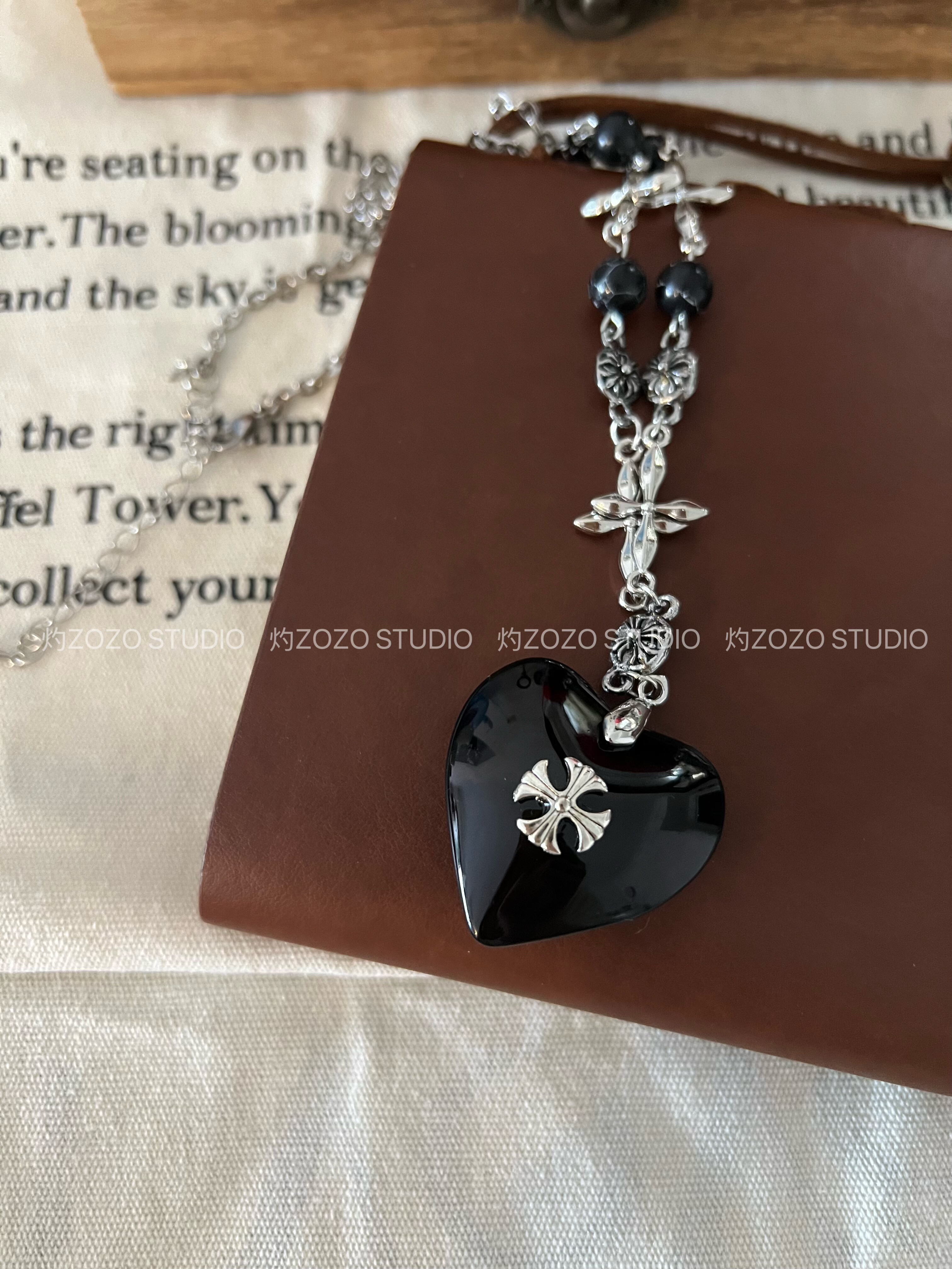 复古小众暗黑哥特黑色爱心十字架项链甜酷风高级感夸张配饰卫衣链