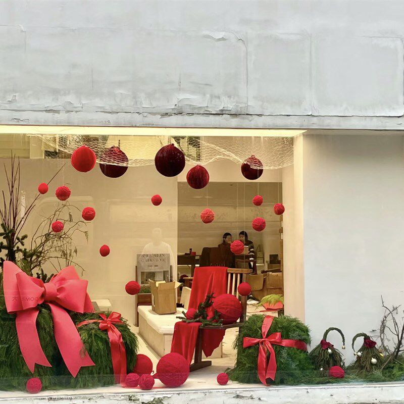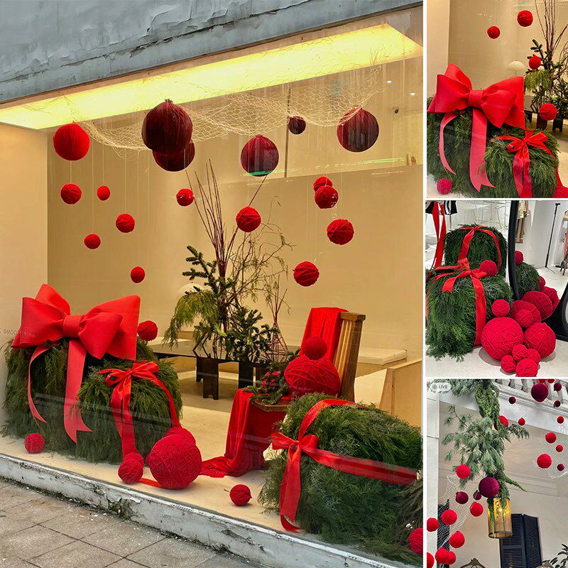 新品新年松柏礼盒橱窗p置景美陈列服装店铺商场绿植红色网红装饰