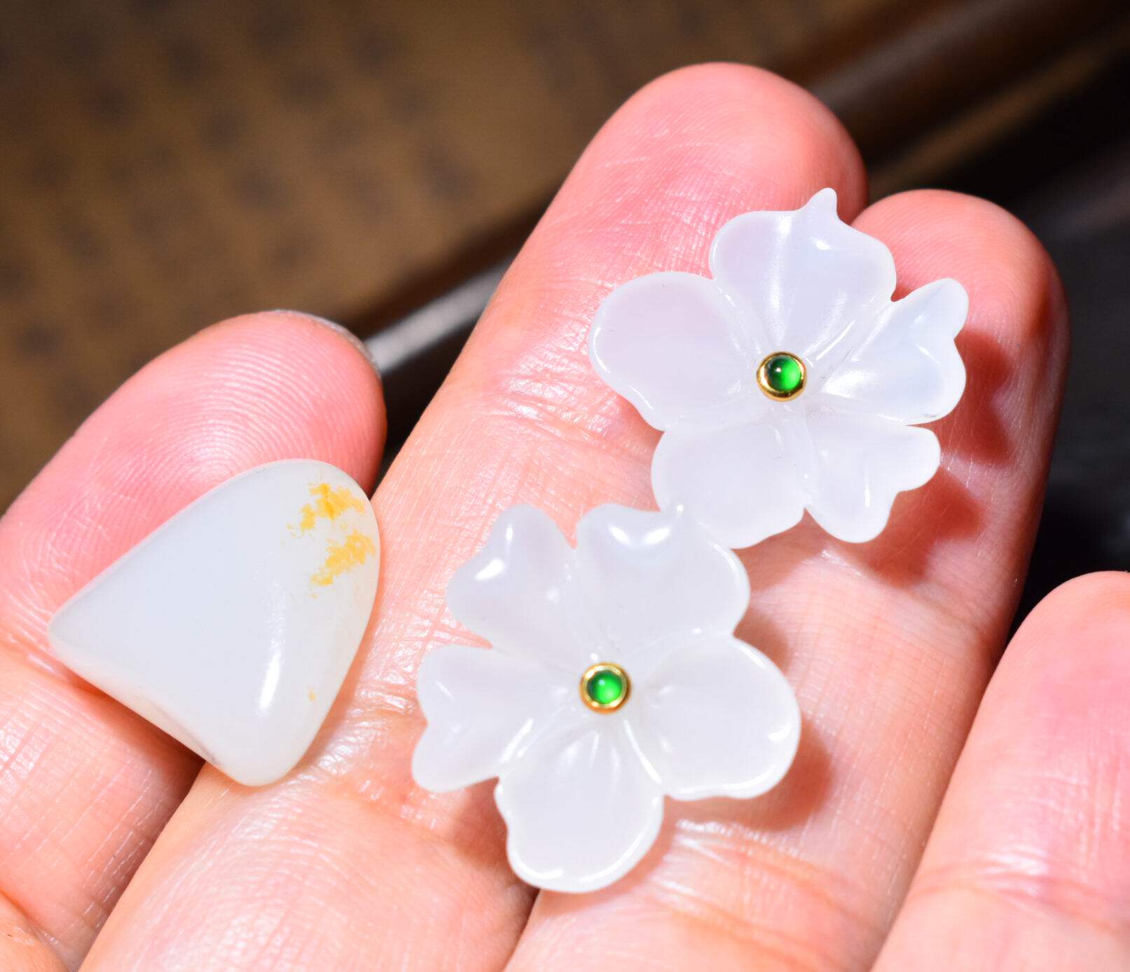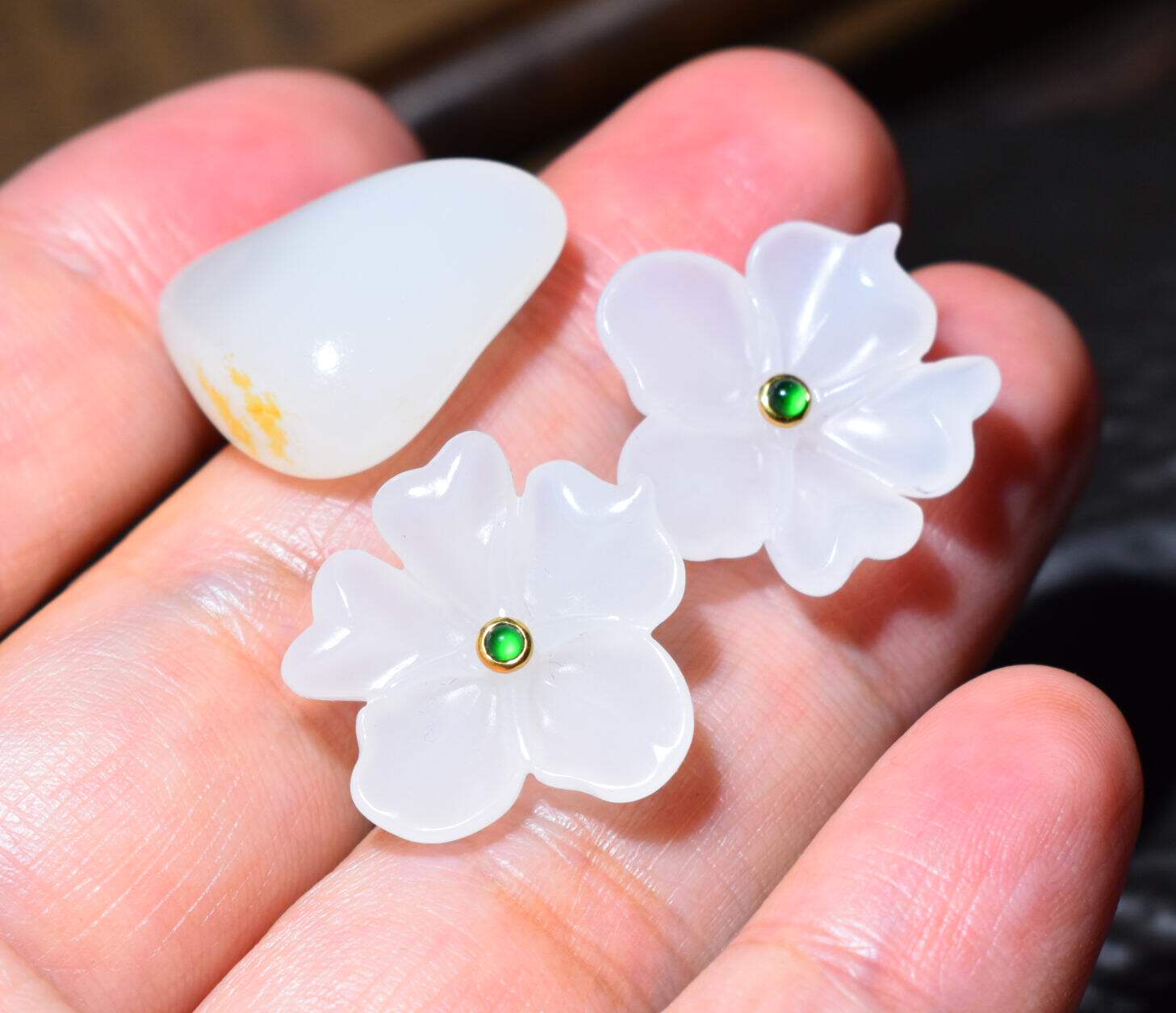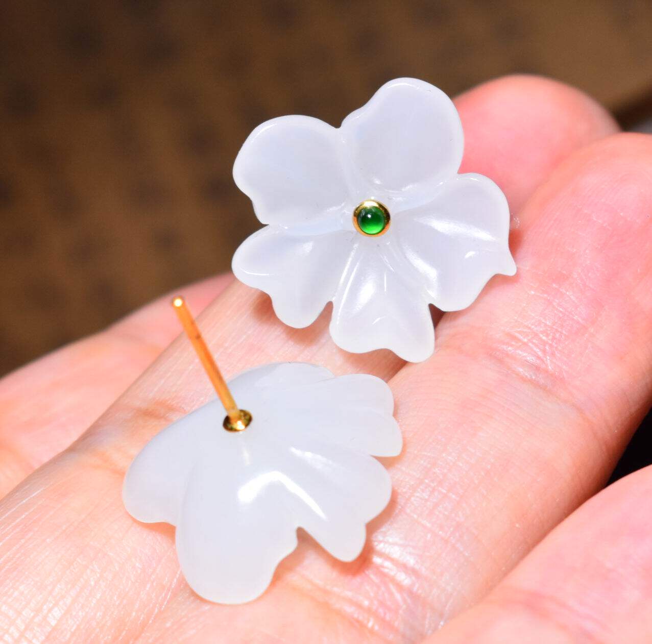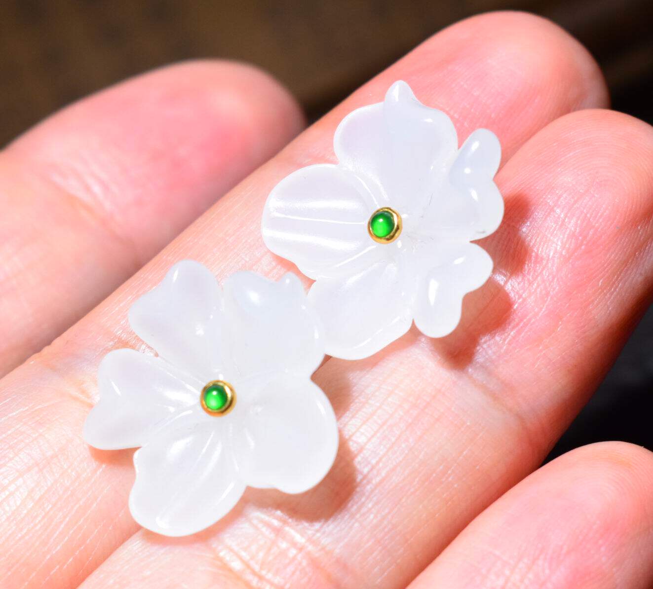 JJ031801新疆的猫4.3克精美的18k金镶嵌和田玉羊脂白冰花瓣耳钉