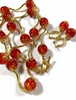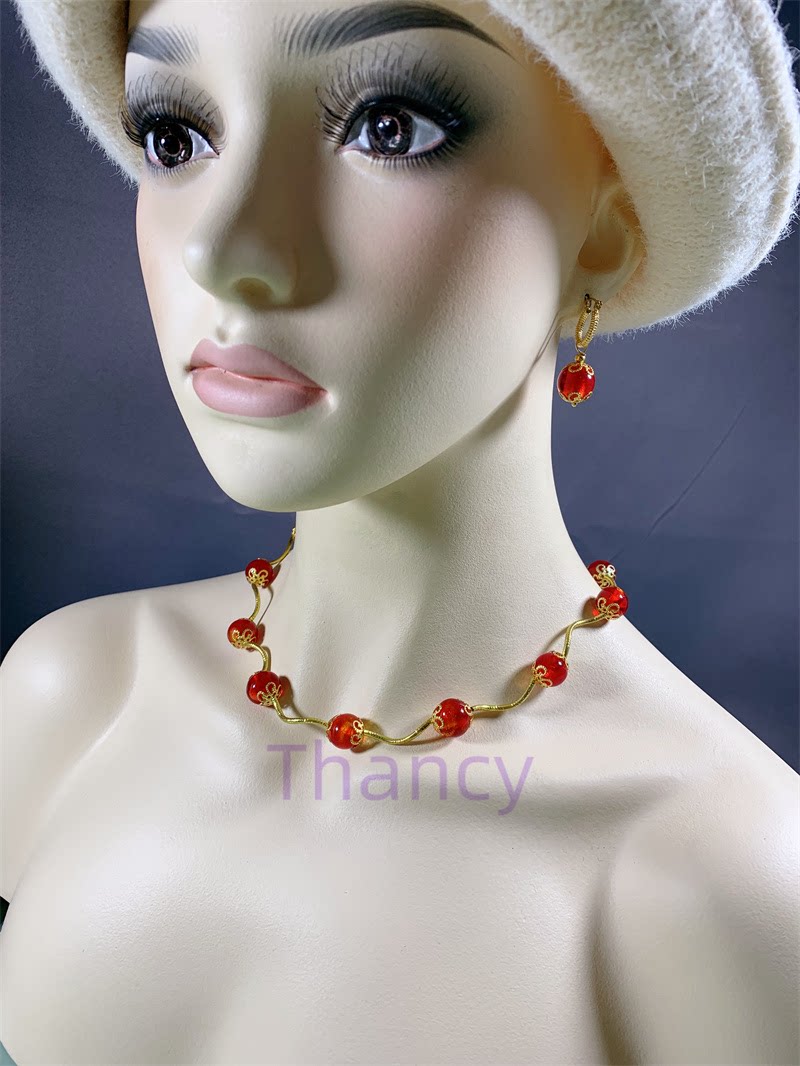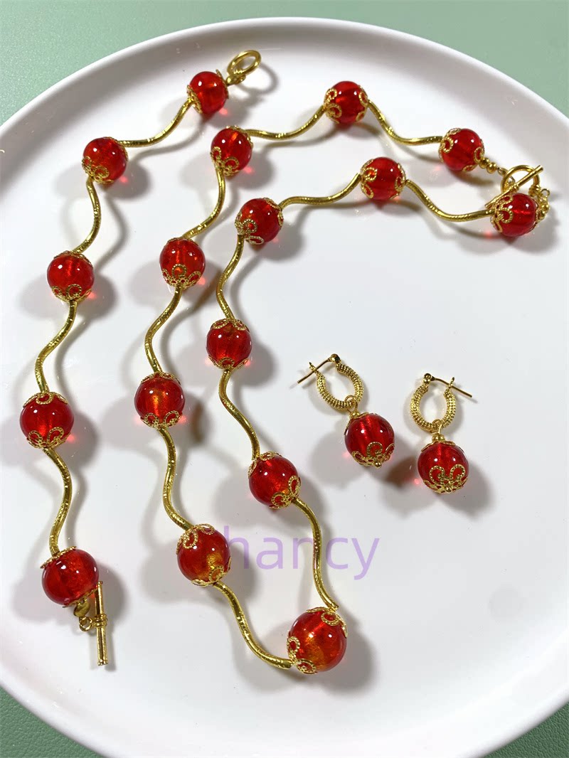 Vintage中古 显气色樱桃红色琉璃珠曲线形耳环项链手链三件套装