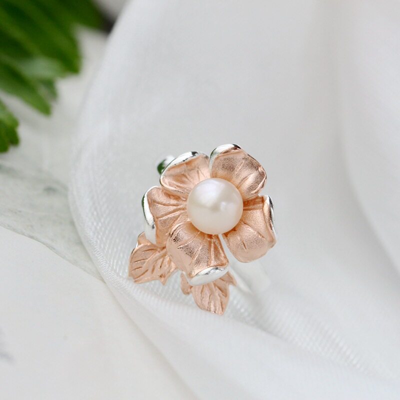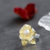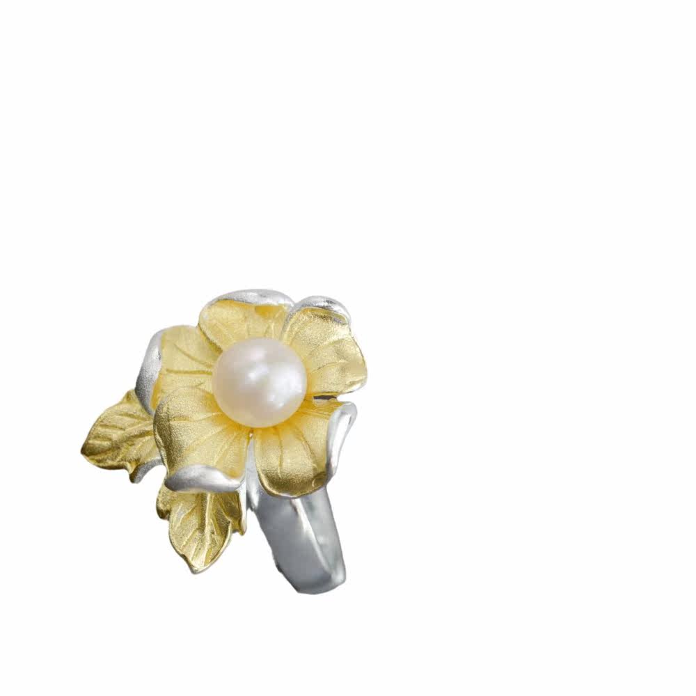 银宸首饰 镶天然淡水珍珠银戒子法式时尚镀金花瓣女士925纯银戒指