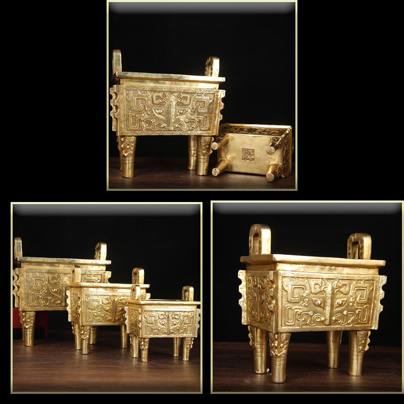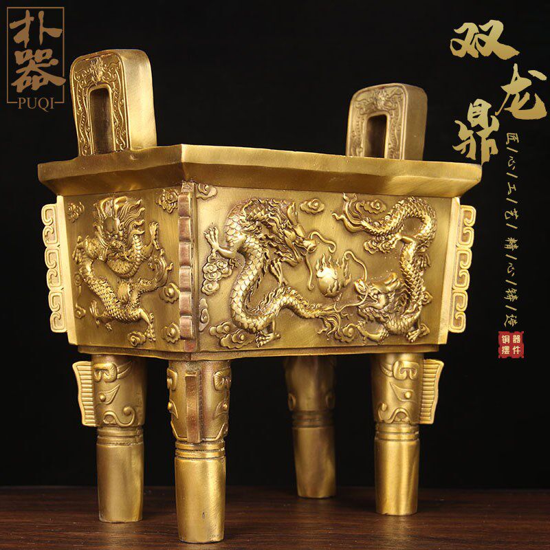 黄色铜兽鼎摆件 铜鼎摆件 铜四方鼎摆件 铜双龙鼎摆件