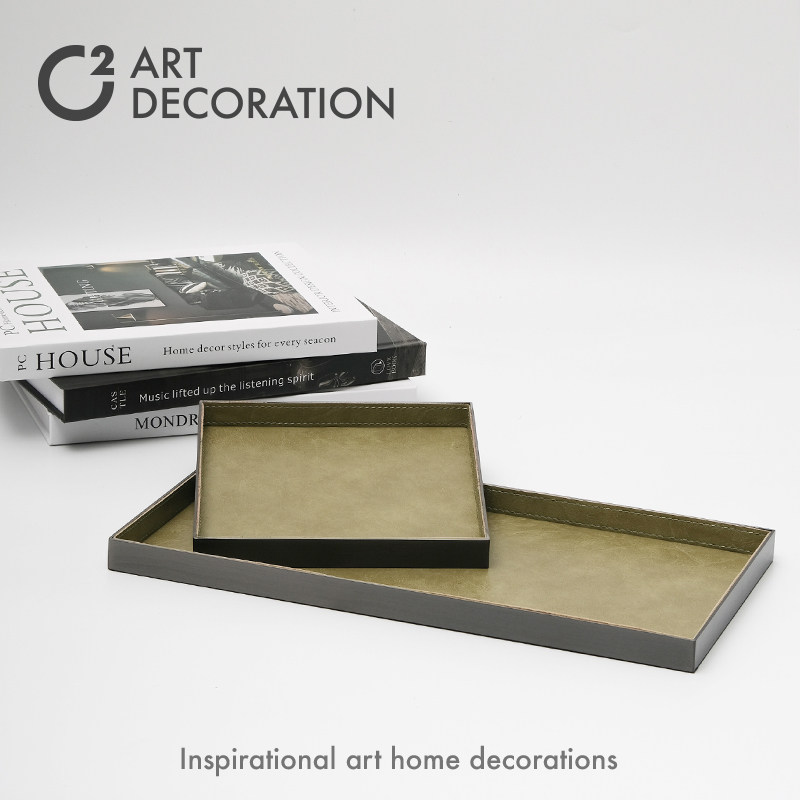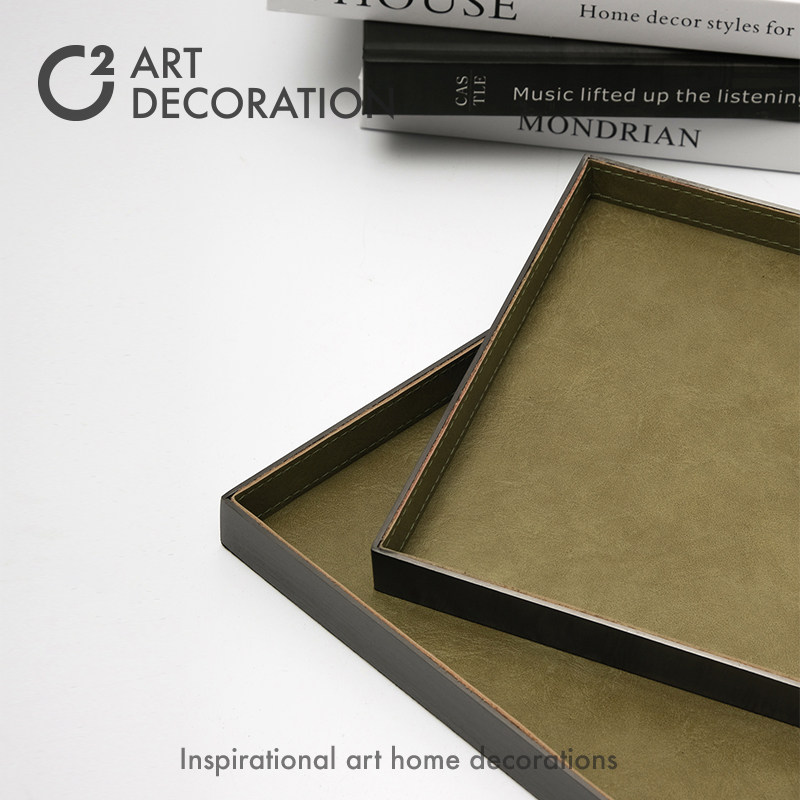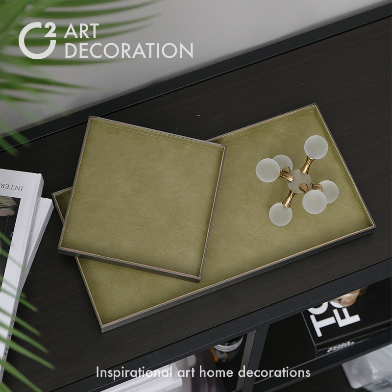 现代意式轻奢高端绿色皮质金属托盘样板间会所售楼处软装饰品摆件