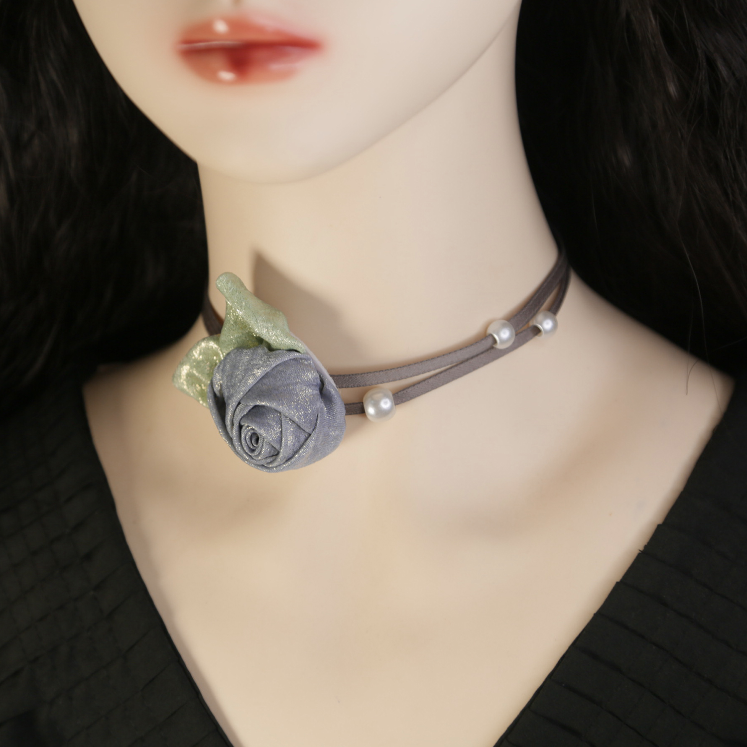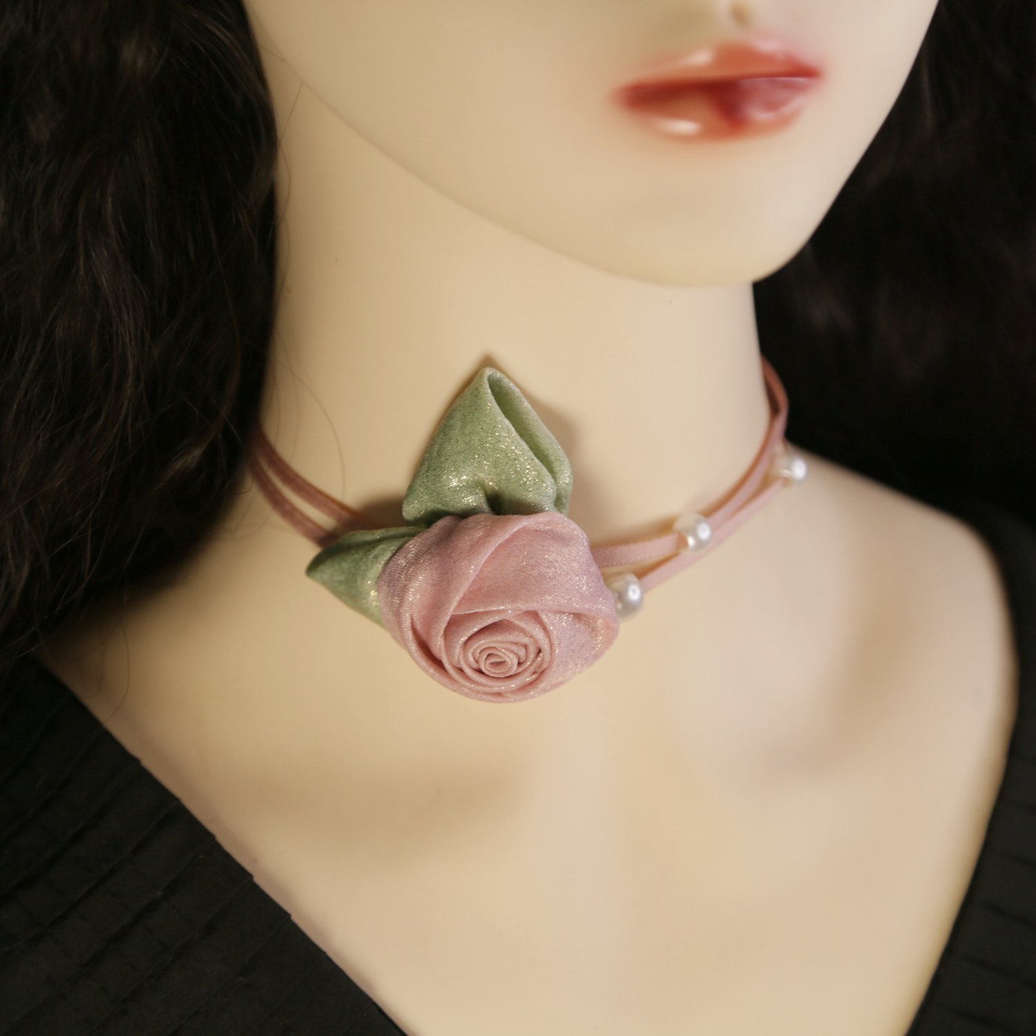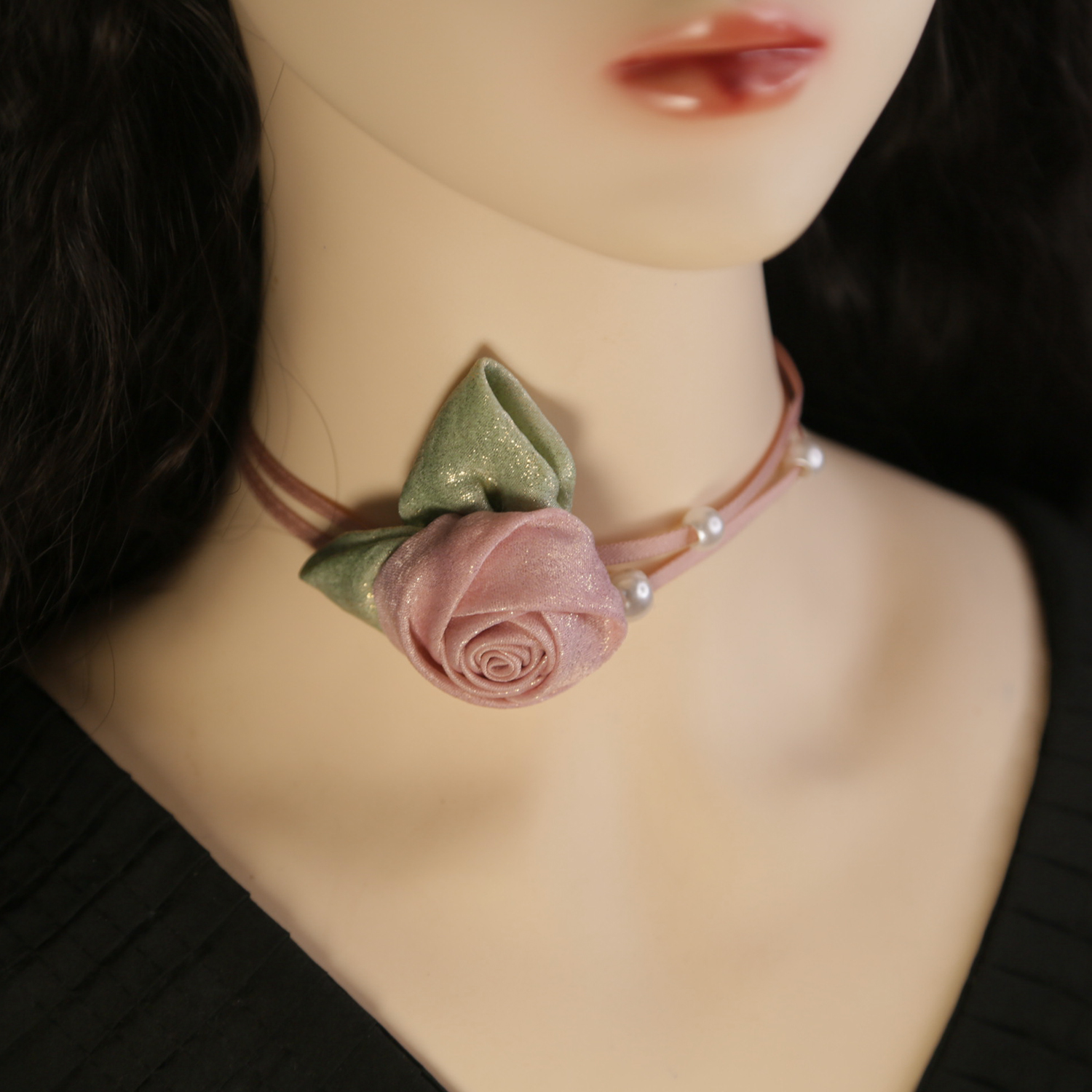 可爱高颜值新款小众玫瑰花choker项链花朵花苞珍珠锁骨短款颈链