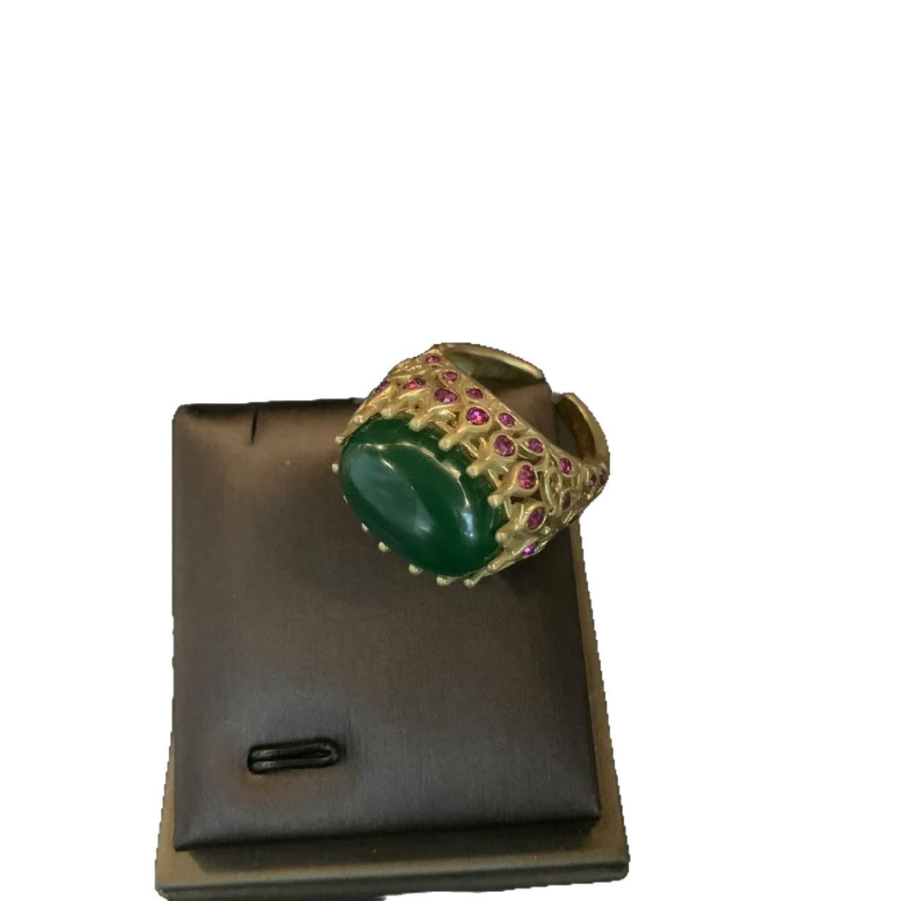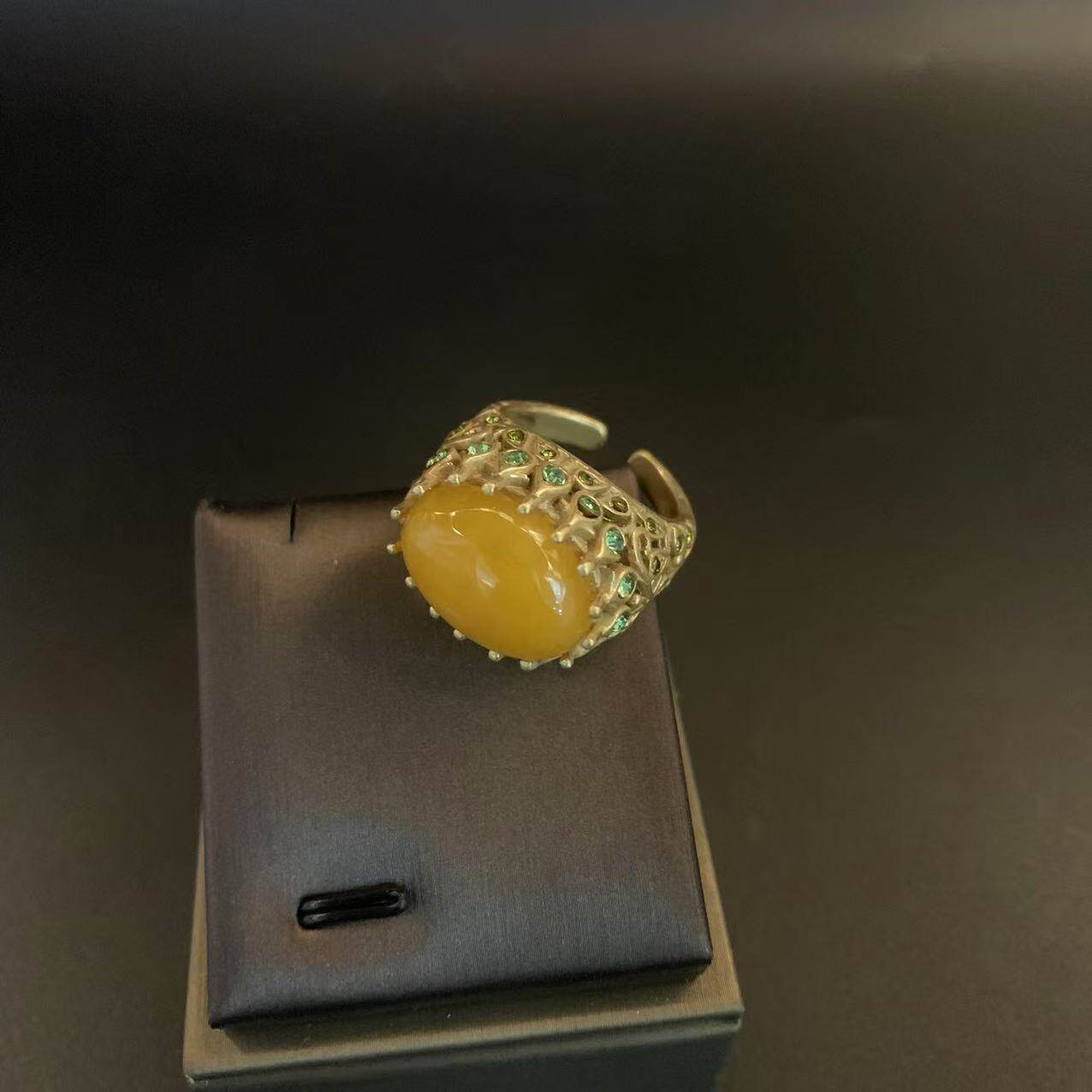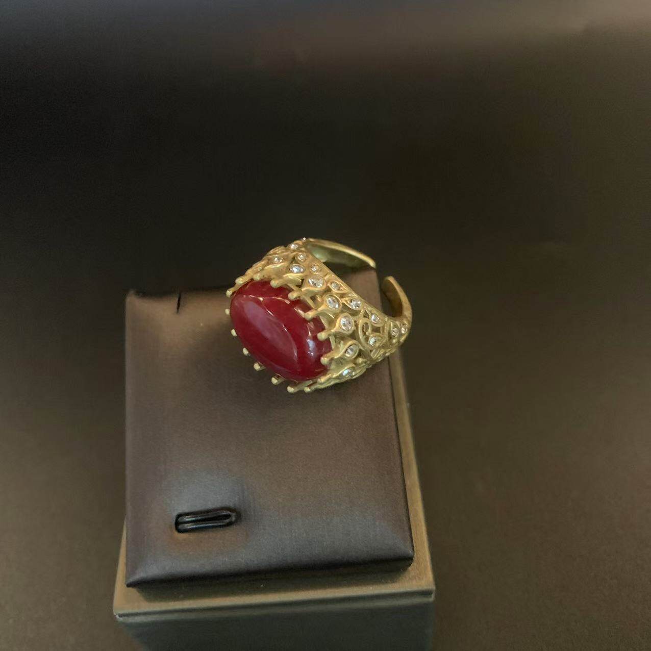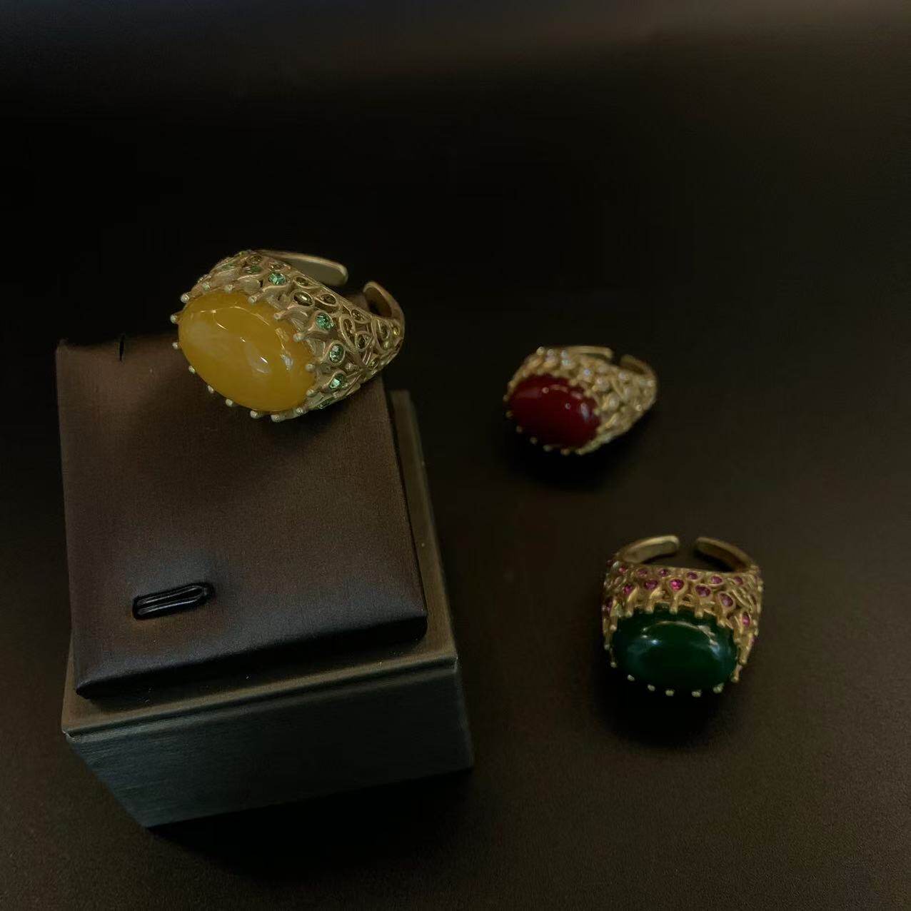 新新款上市优质中古复古祖母绿红色黄色天然石开口可调节戒指女感
