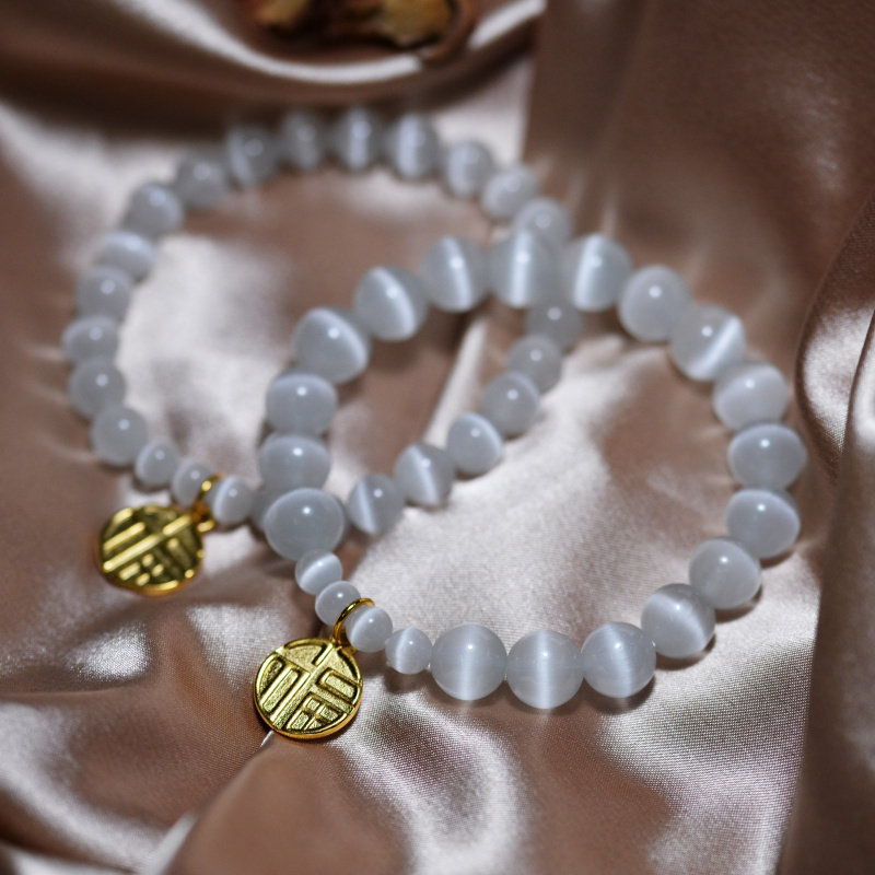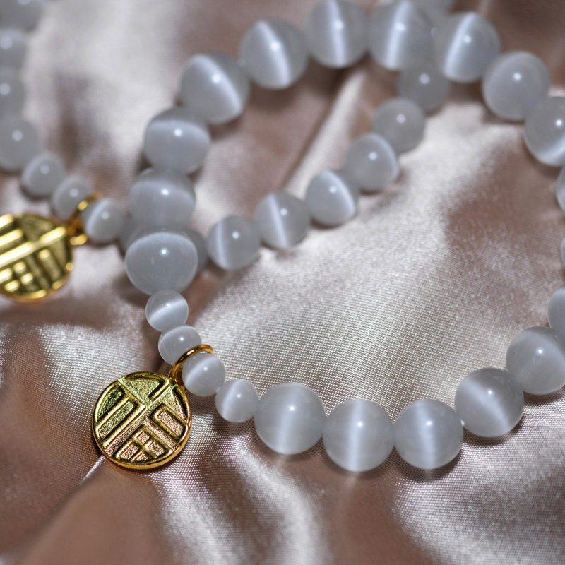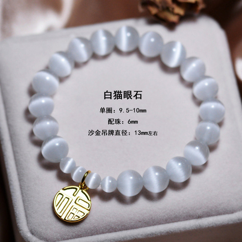 白色猫眼石手链女生ins小众设计手串水晶手饰金色福牌吊坠闺蜜款