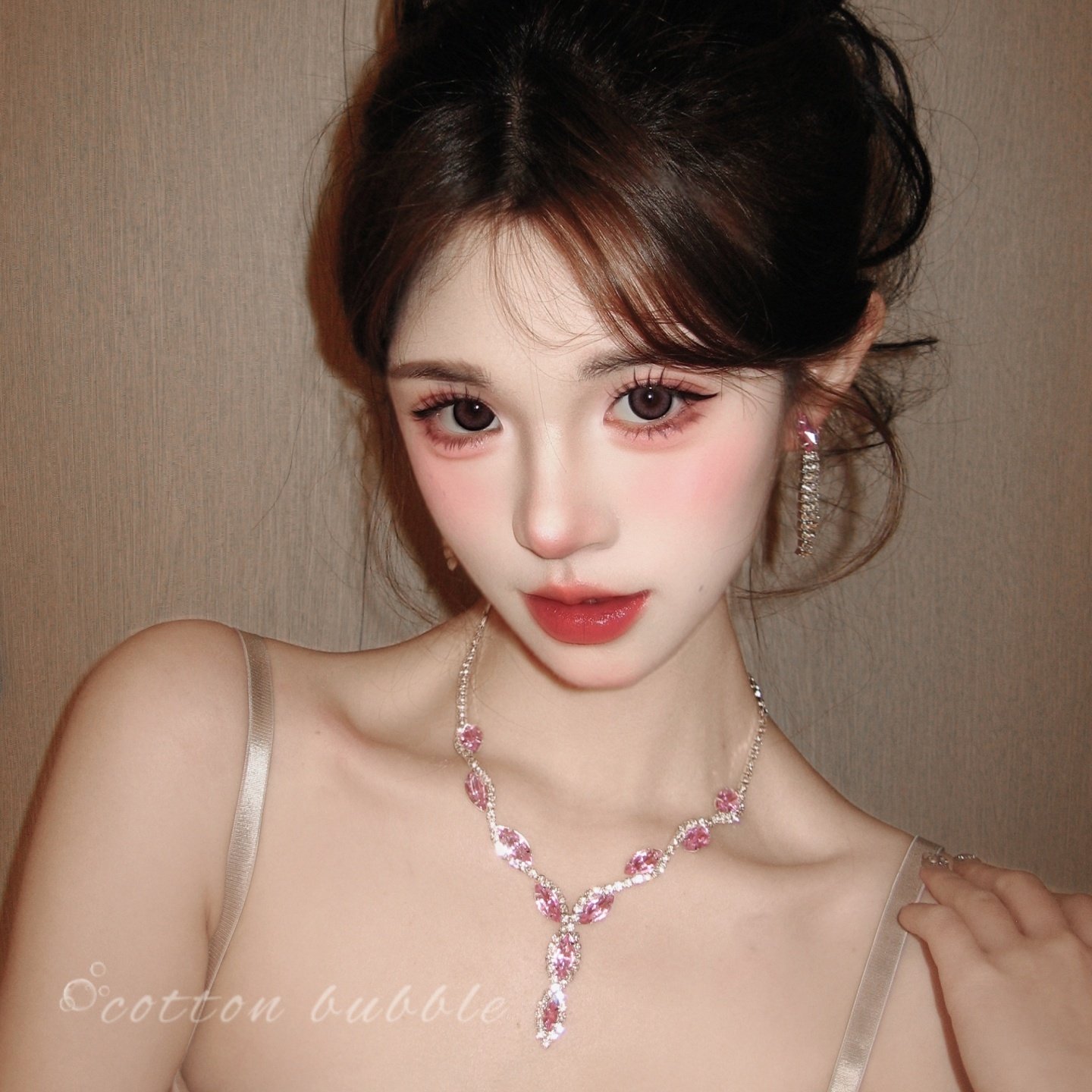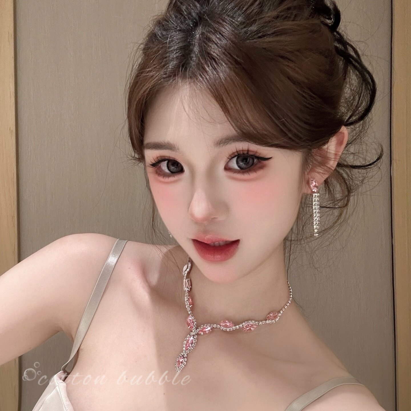 轻奢粉色水滴镶钻项链耳环套装女锆石夸张流苏新娘颈链晚礼服配饰