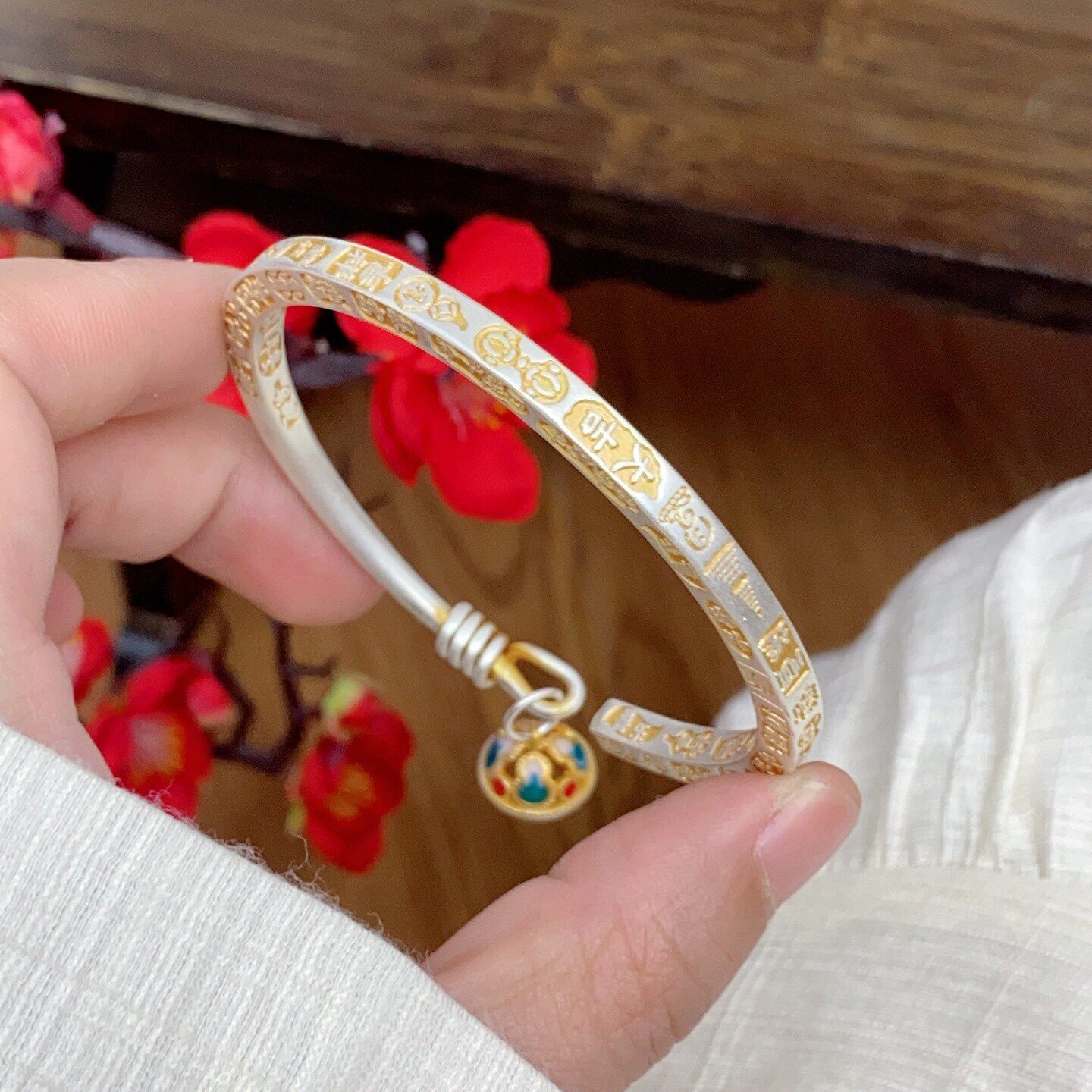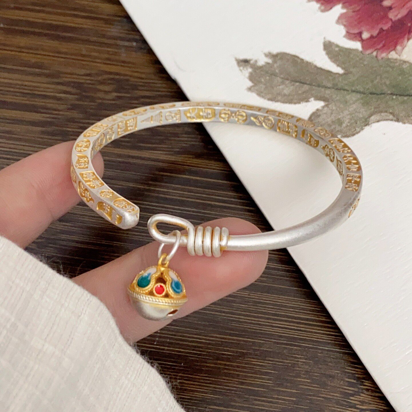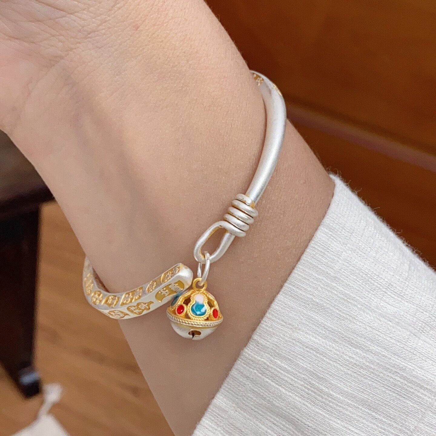 新中式国风珐琅彩宫铃足银9999手镯纯银描金吉言镯子情人节礼物