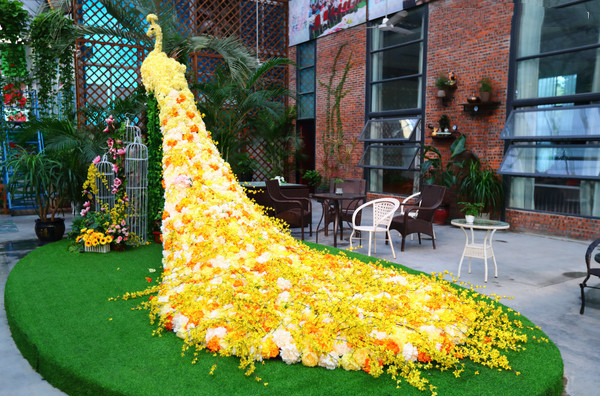 婚庆绢花喜庆道具仿真鲜花孔雀造型 仿真绿雕动物插花售楼部商场