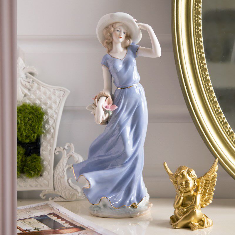 风吹裙摆采花女孩工艺品人物欧式公主法式浪漫陶瓷玩偶复古蓝摆件