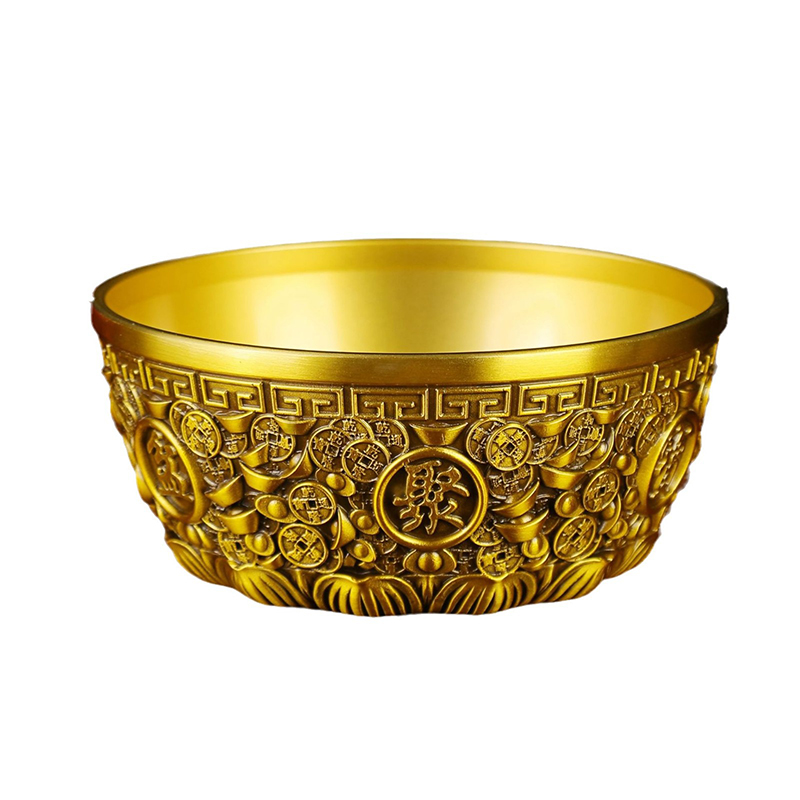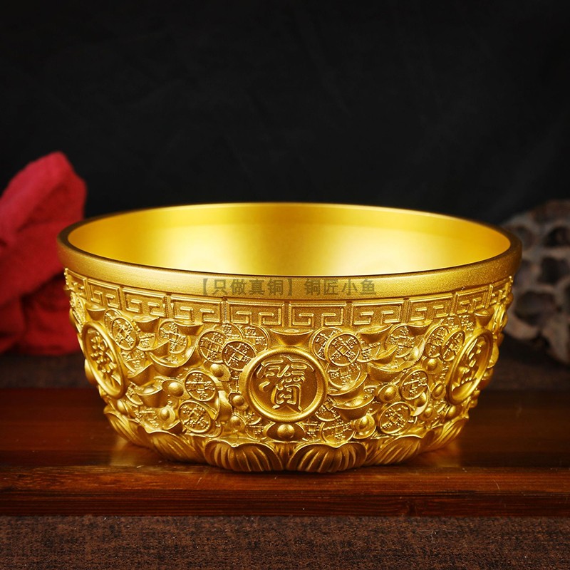 加厚实心黄铜聚宝盆摆件复古做旧浮雕金铜钱元宝纯铜米缸客厅聚财