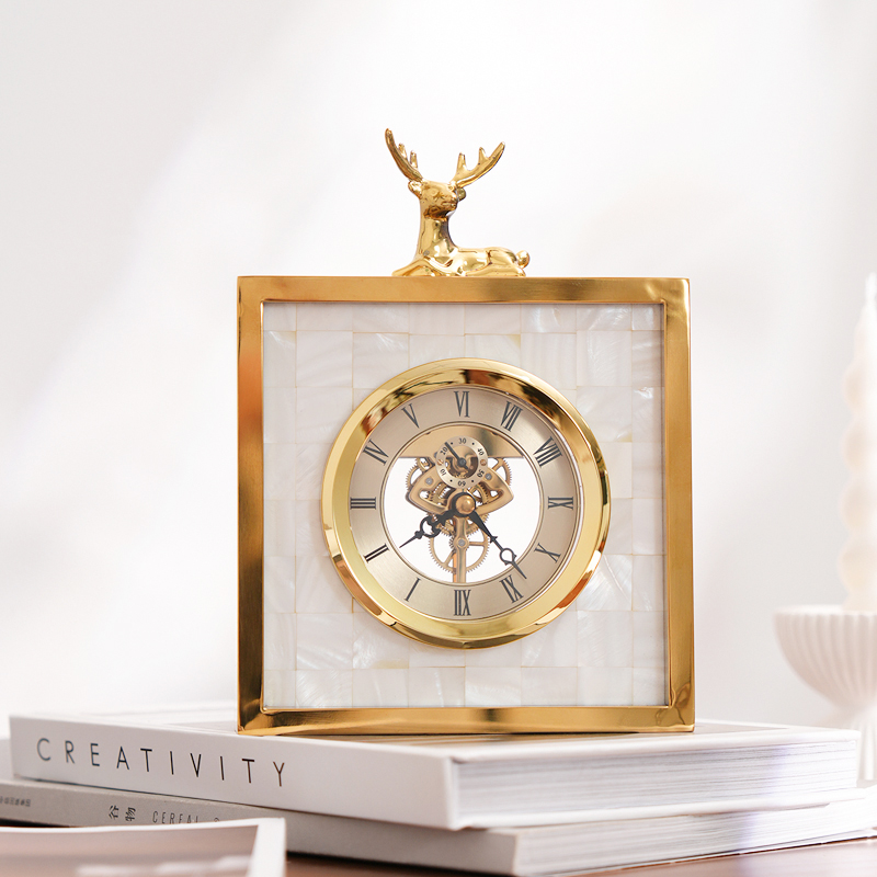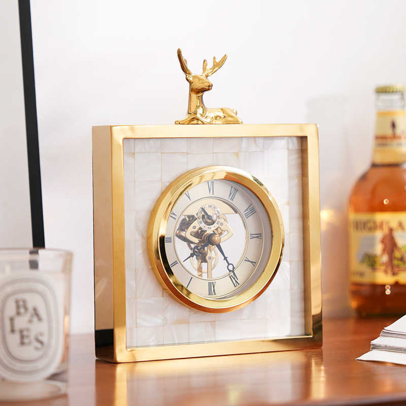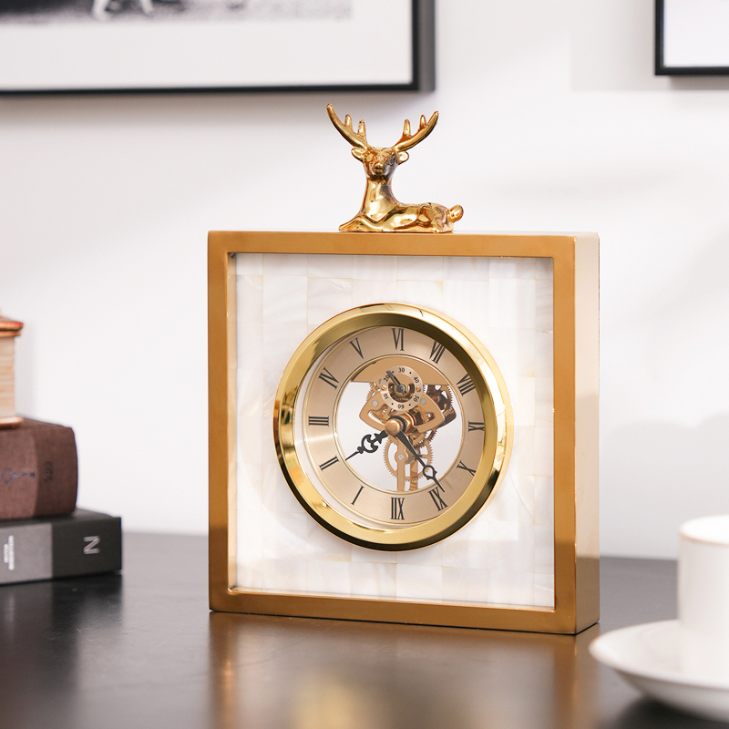 锦瑟家居简约现代鹿头白贝时钟欧式时钟钟表金属创意台钟座钟静音