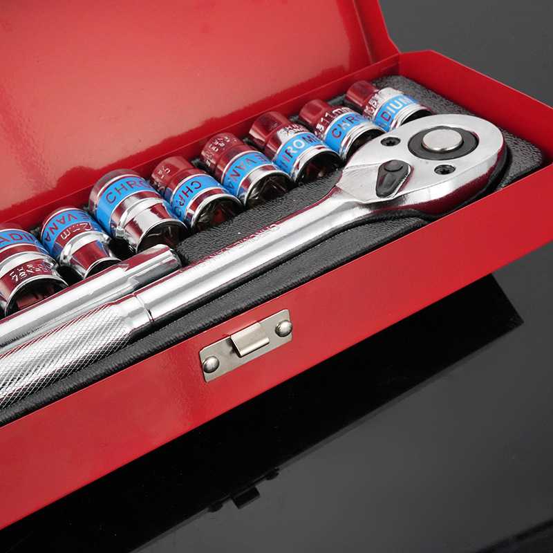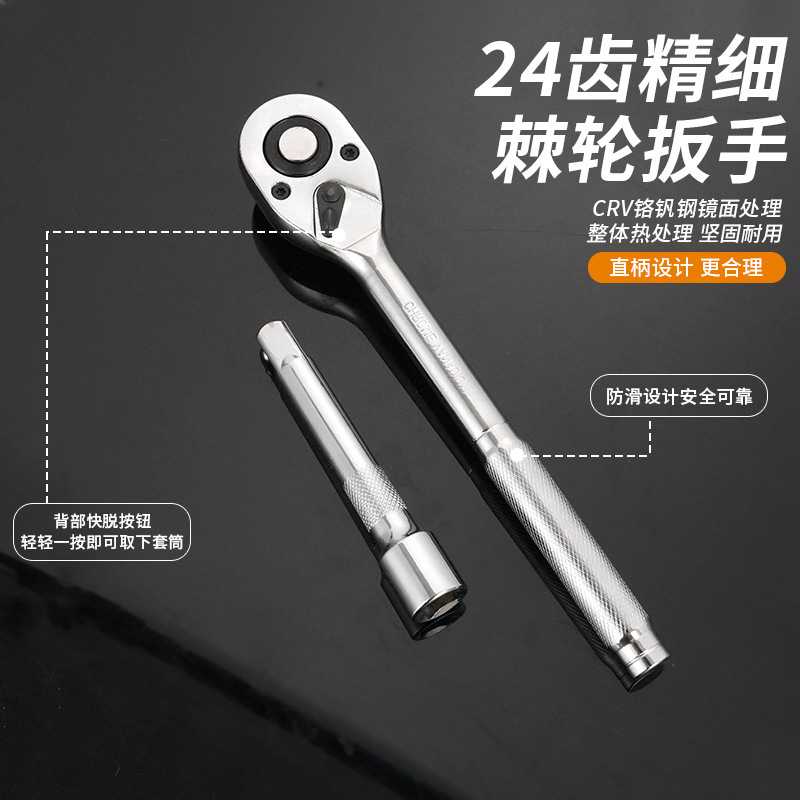 12件套铬钒钢汽修快速光柄棘轮扳手两用扳手接杆套筒铁盒工具套装