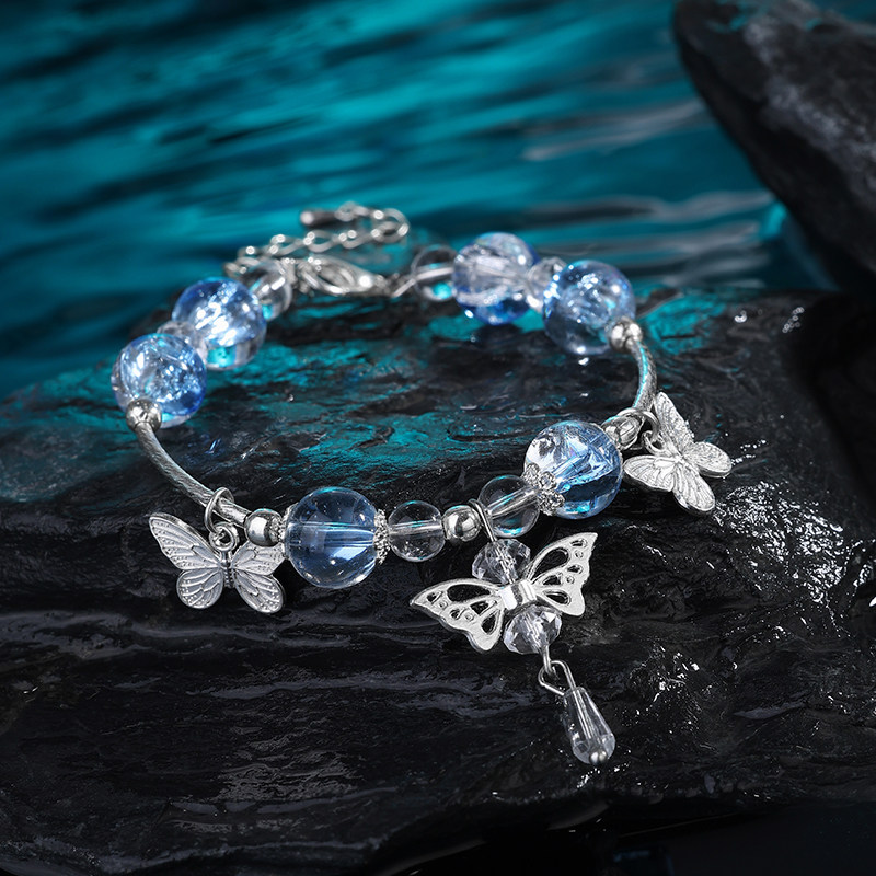 蓝色琉璃水晶串珠蝴蝶吊坠手链女精致小众设计感手串绝美仙气手镯