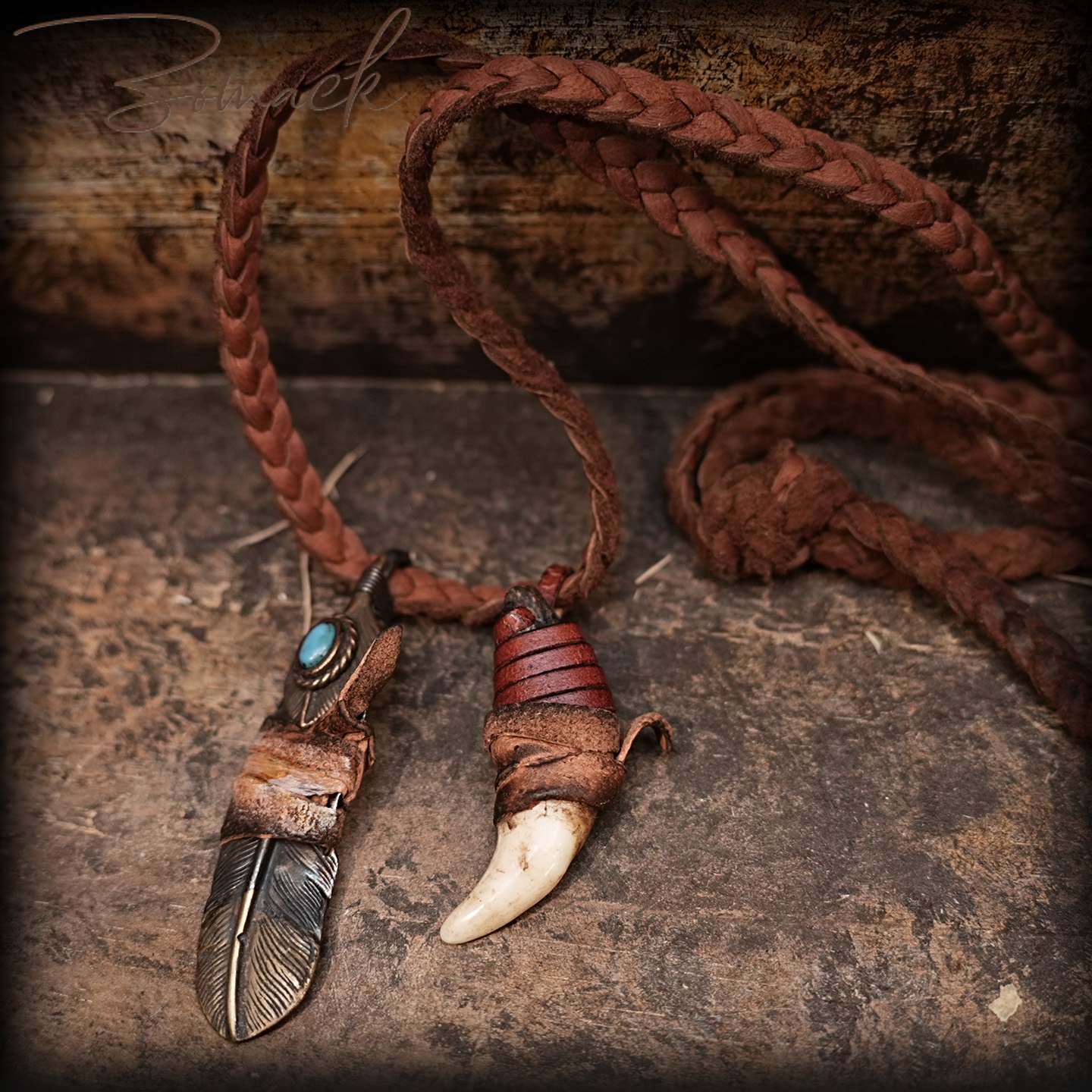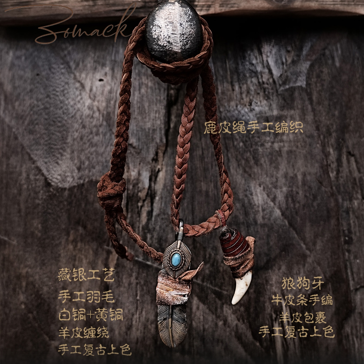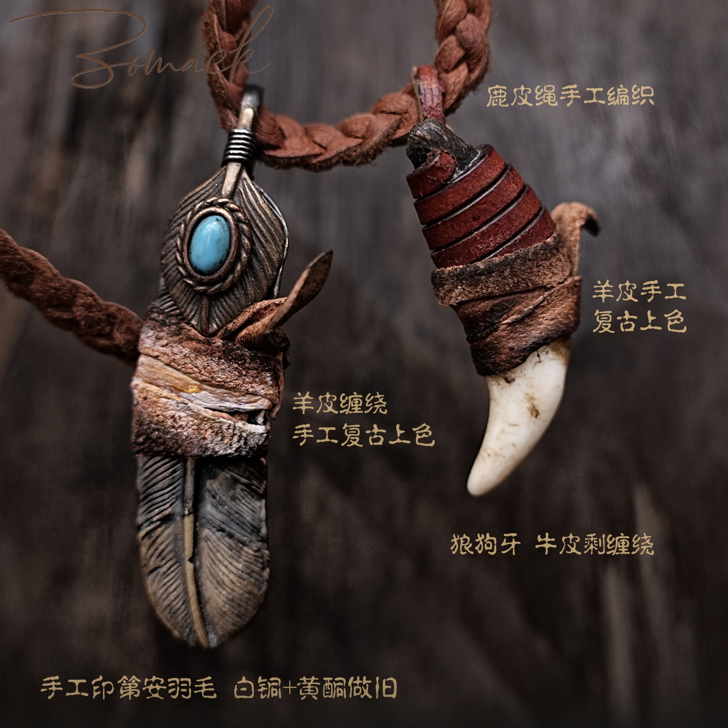 手工真鹿皮项链印第安纳瓦霍手工紫铜羽毛狗牙美国西部老钱风艺术