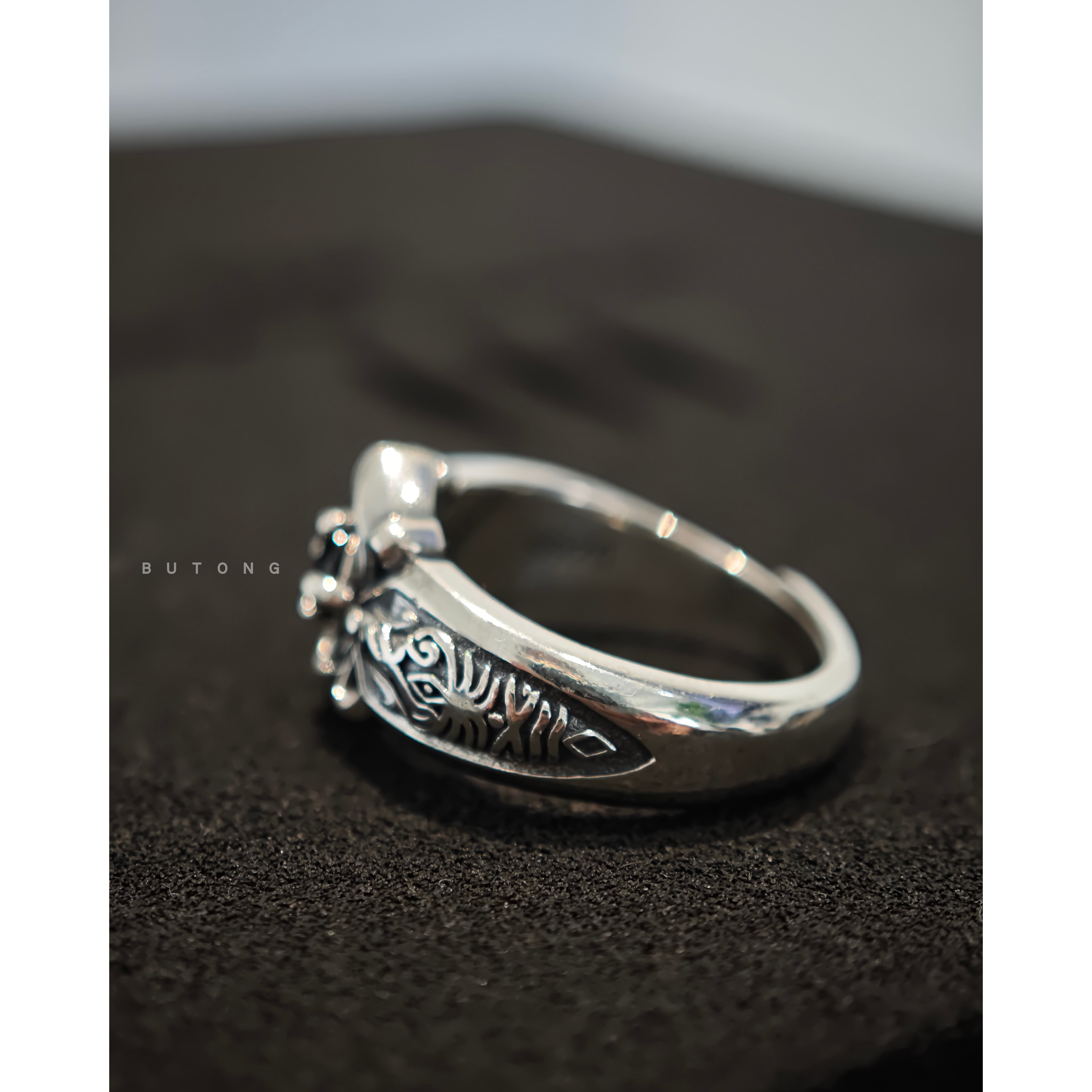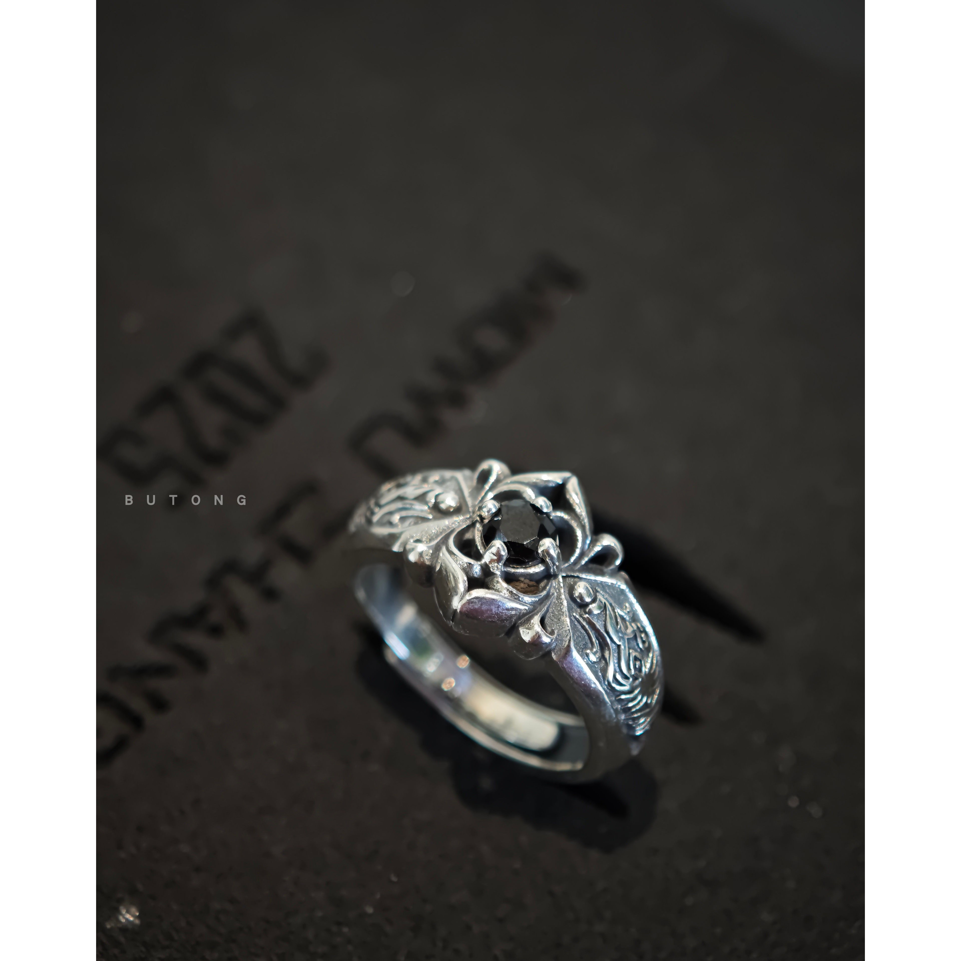 不同银匠 复古925纯银镂空宝莲花纹镶嵌黑色锆石钻开口戒指男指环