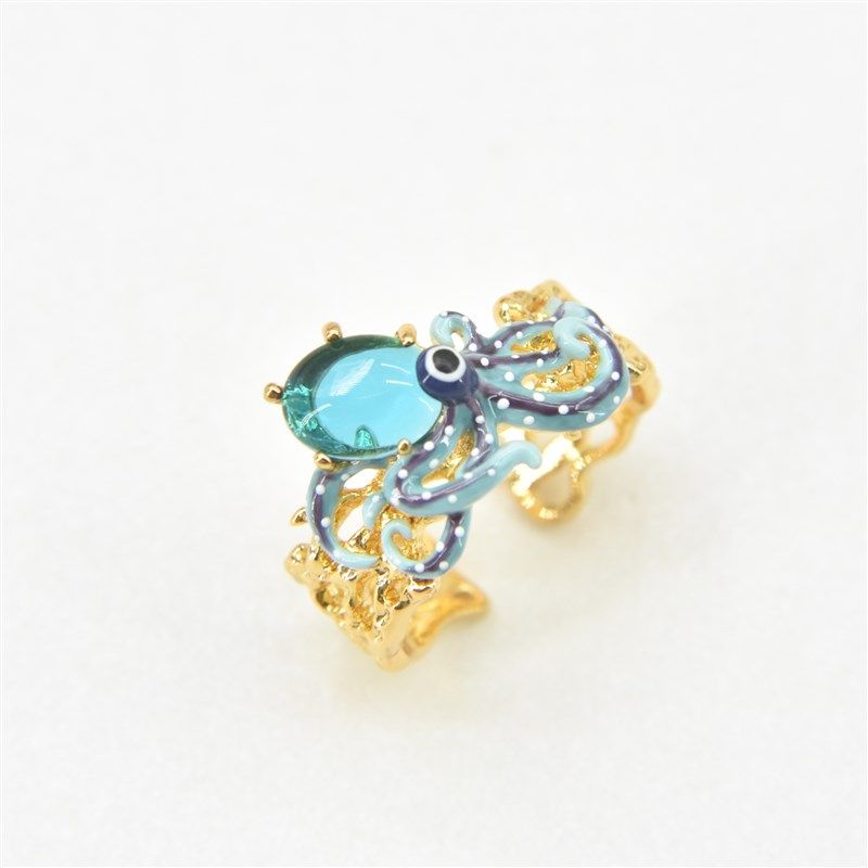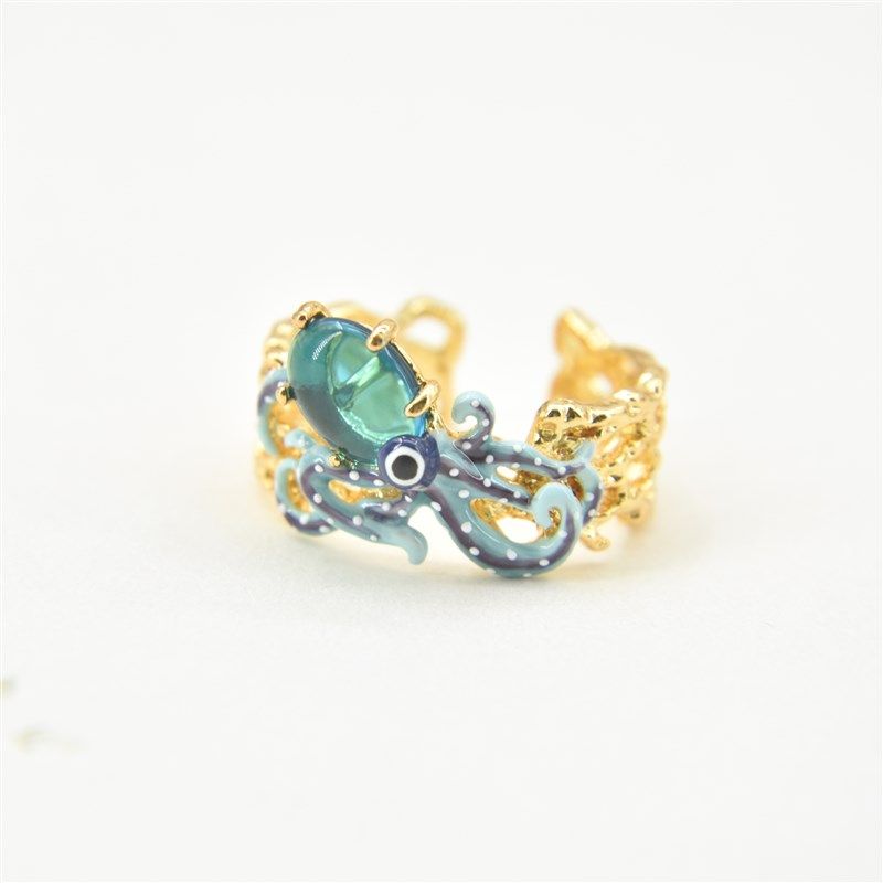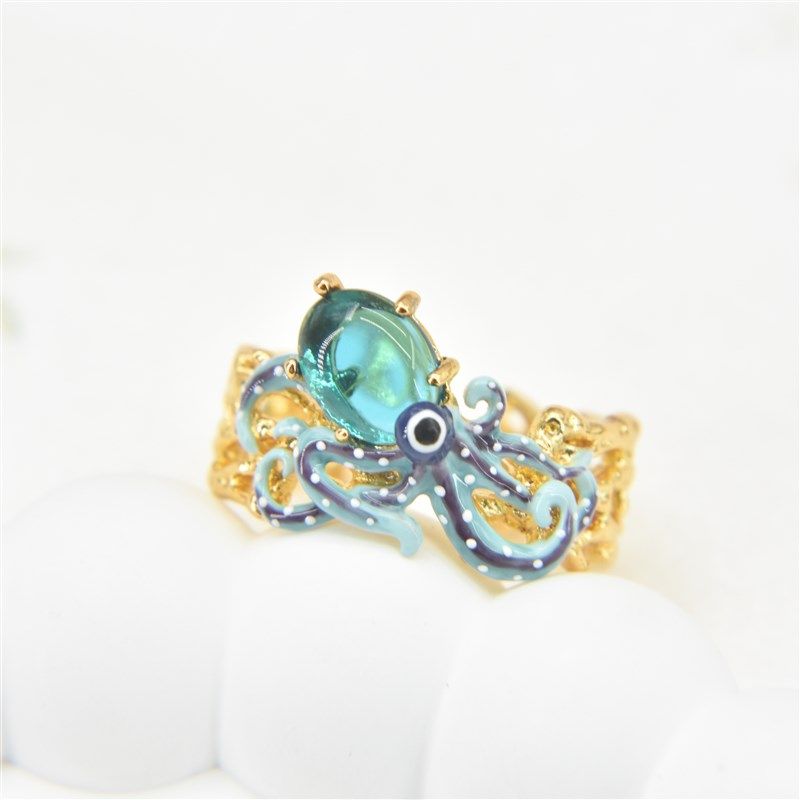 法国手工珐琅 海l底两万里 蓝色八爪鱼 宝石珍珠 章鱼戒指
