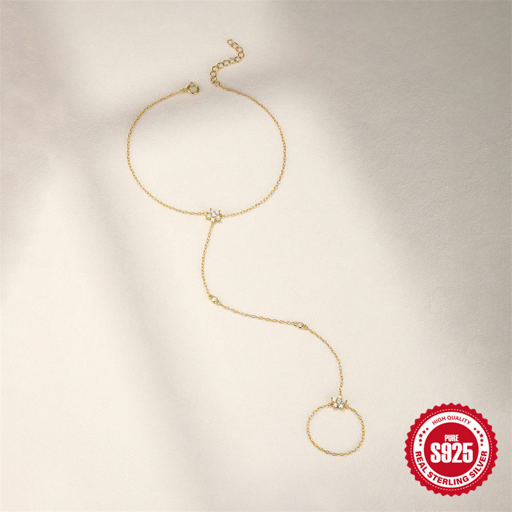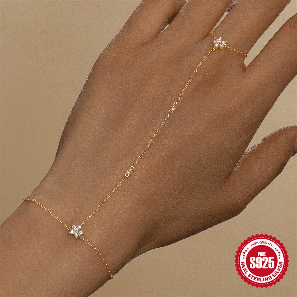 s925纯银三颗花瓣五瓣花镶钻手链戒指链式手指链个性欧美ins风
