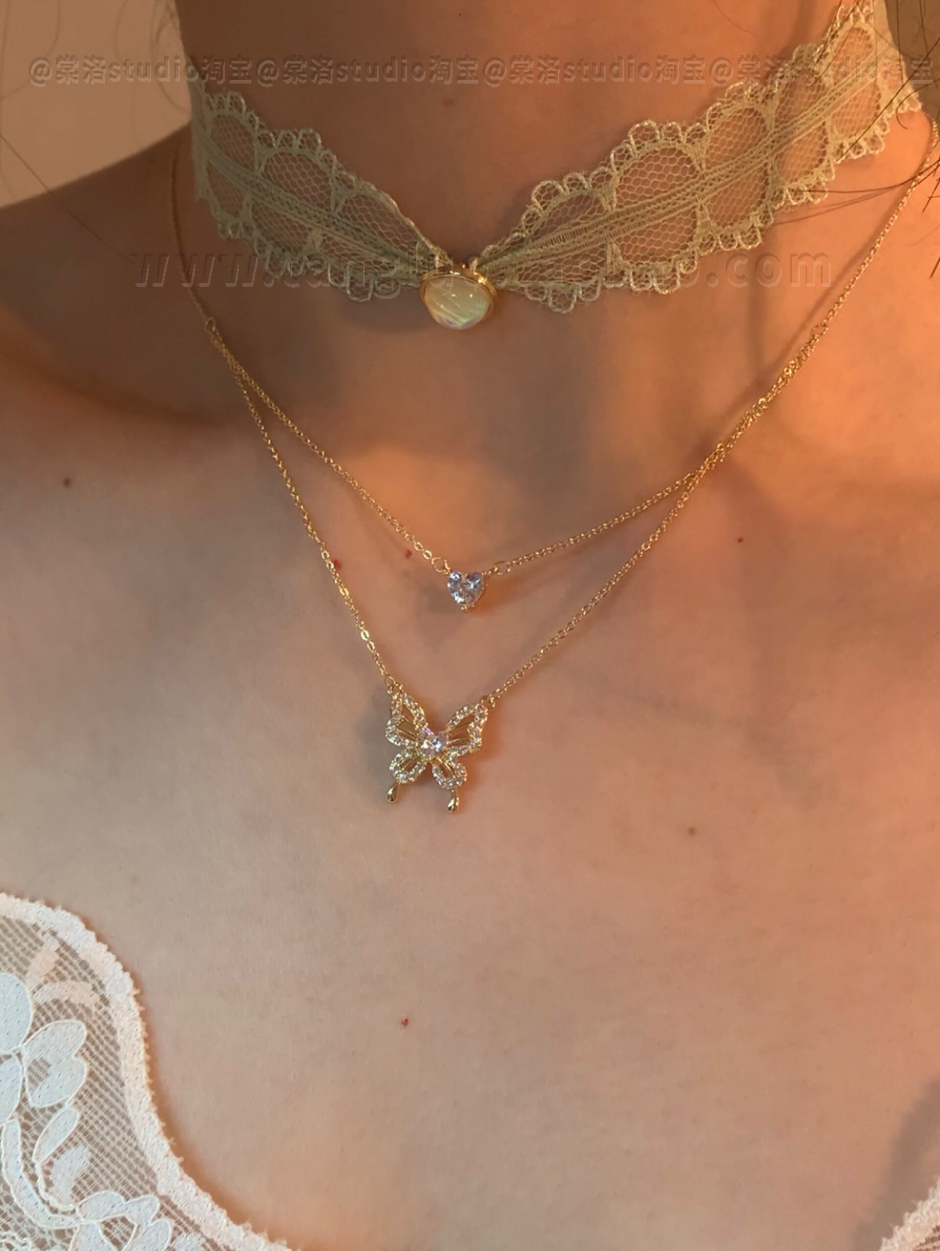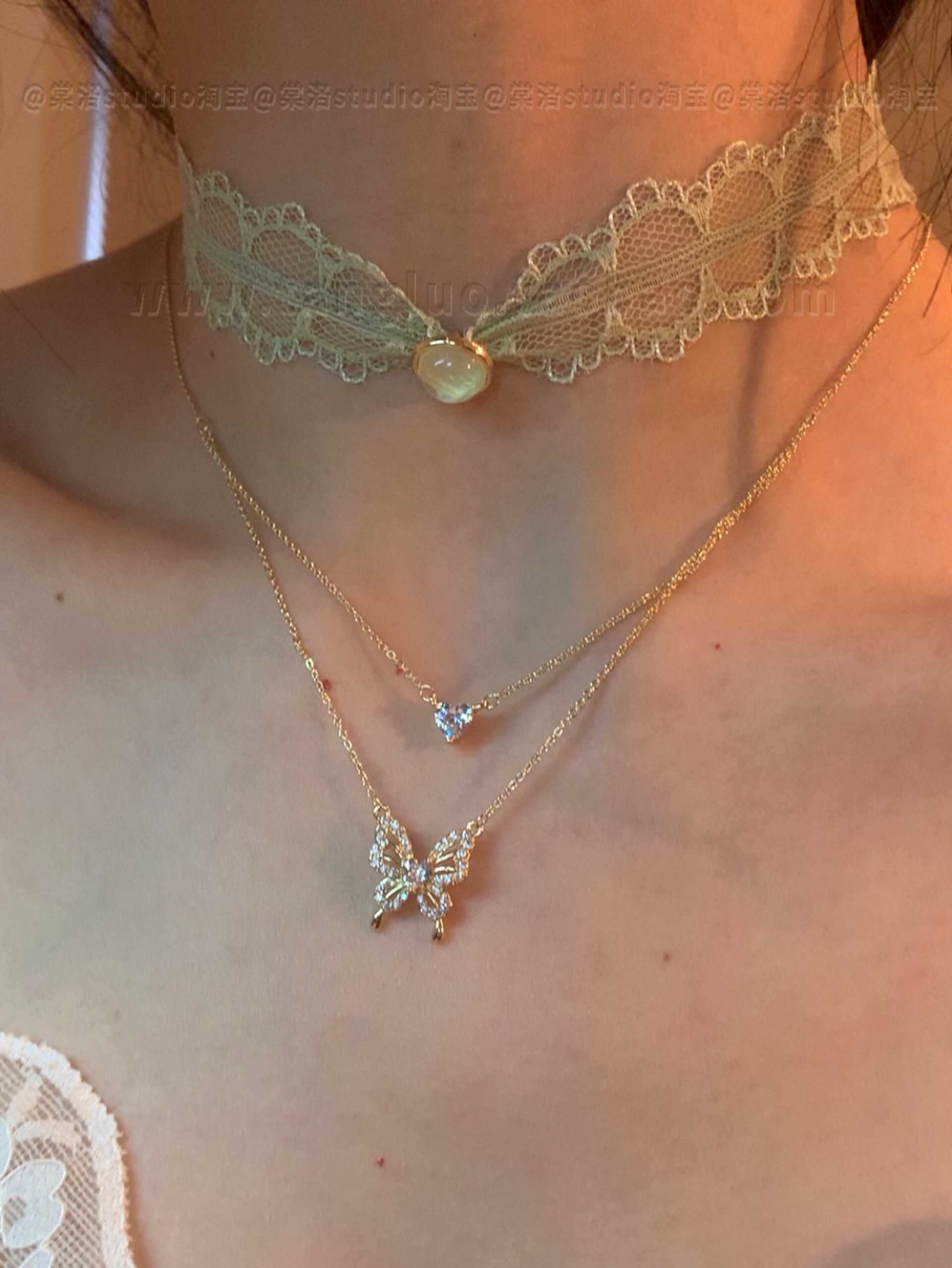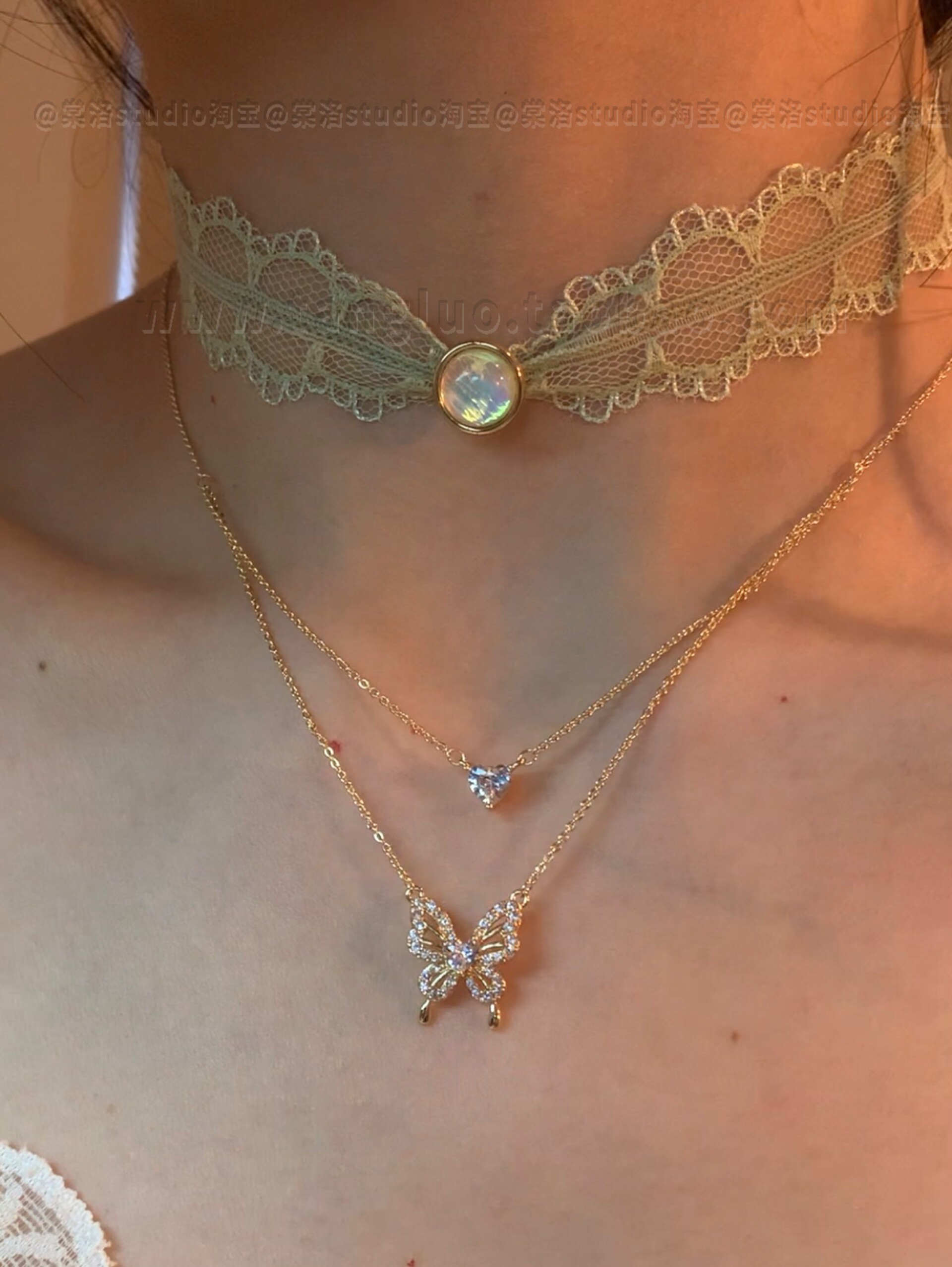 春日序曲 绿色蕾丝月光choker叠戴细闪蝴蝶锁骨链女小众颈链配饰