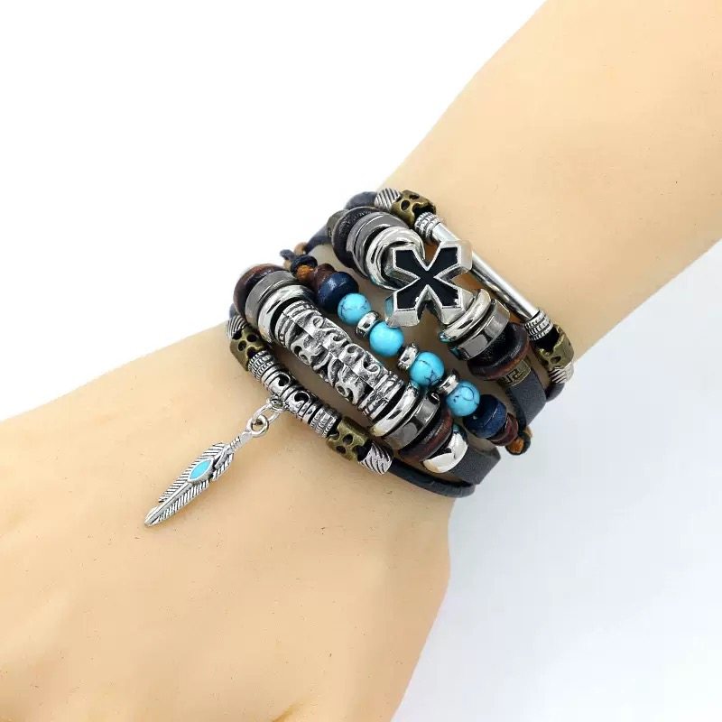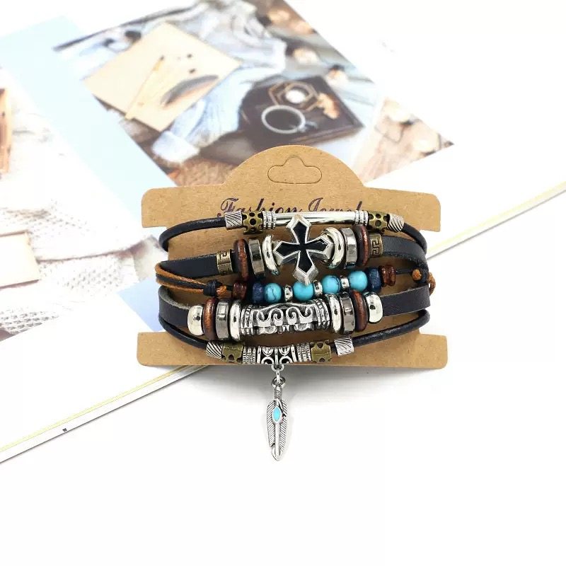 民族风复古饰品 男女通用多层串珠十字架手链 时尚个性仿松石手饰