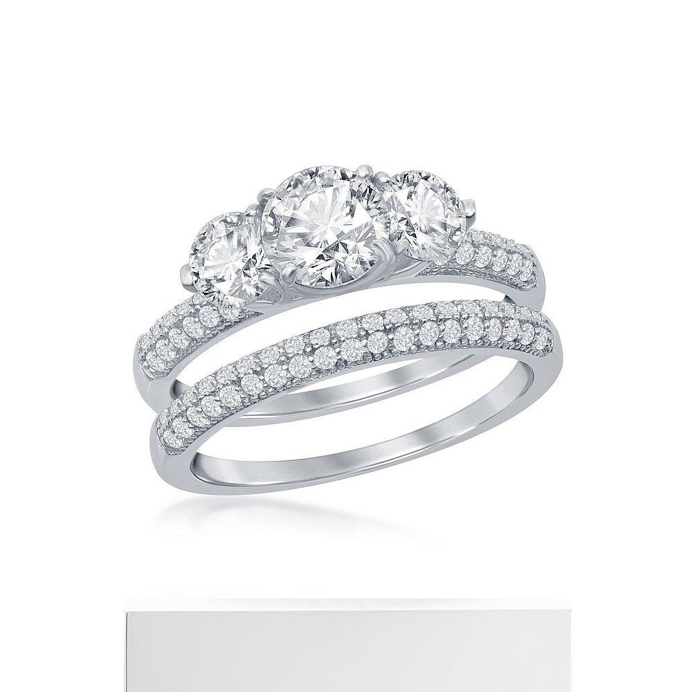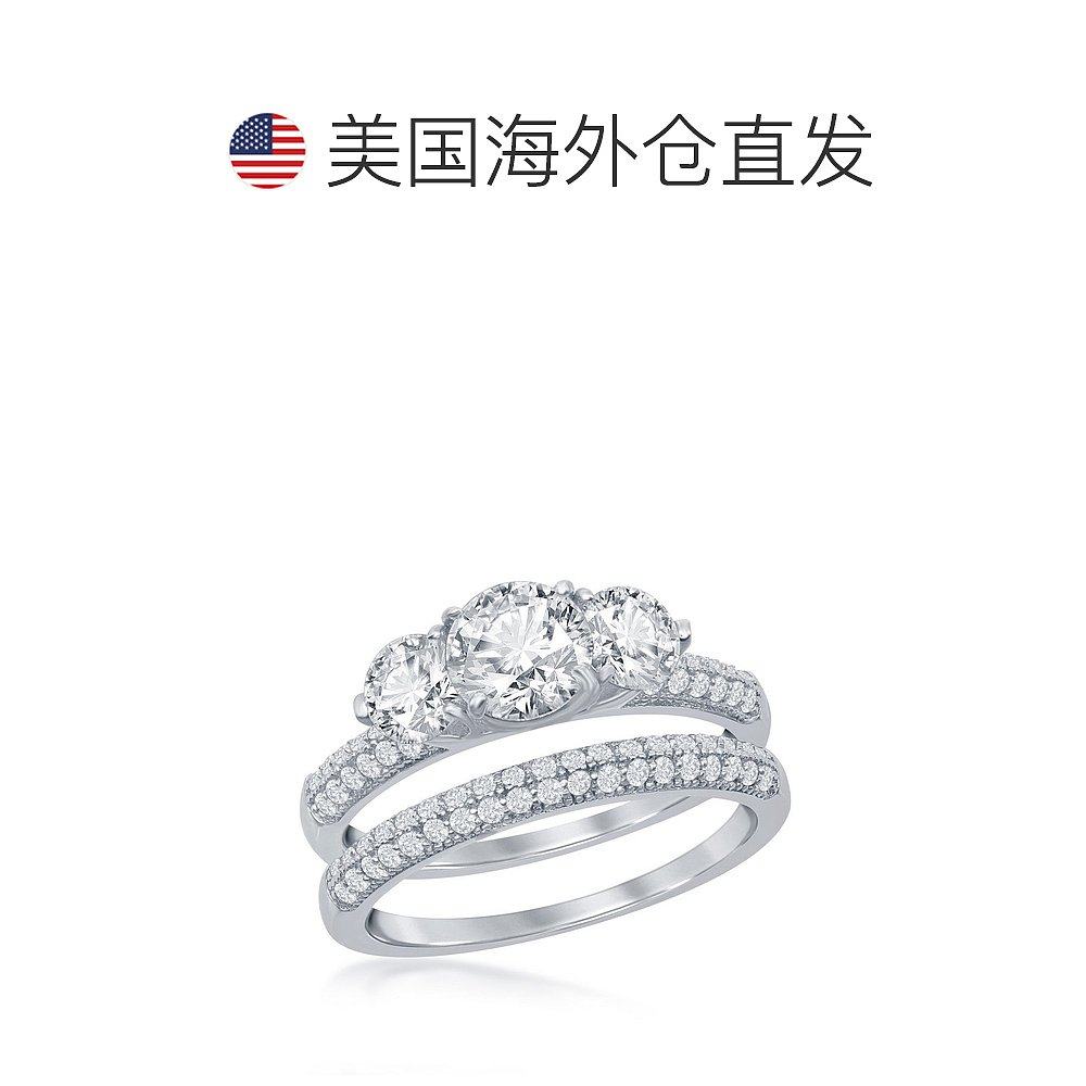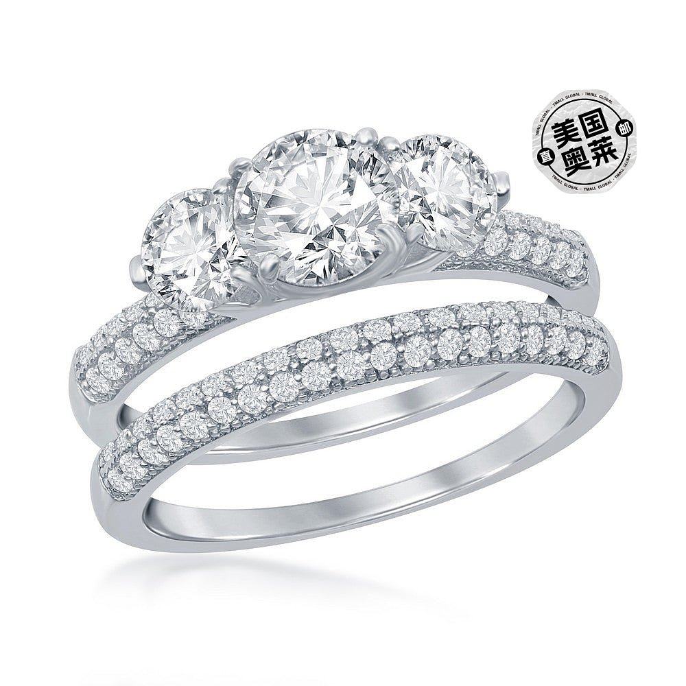 自营 simona 925 纯银三石半微型密钉带订婚戒指套装 - 银白色 美