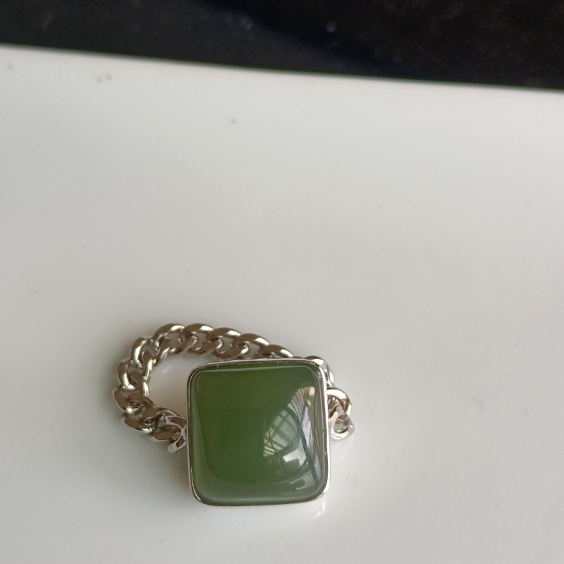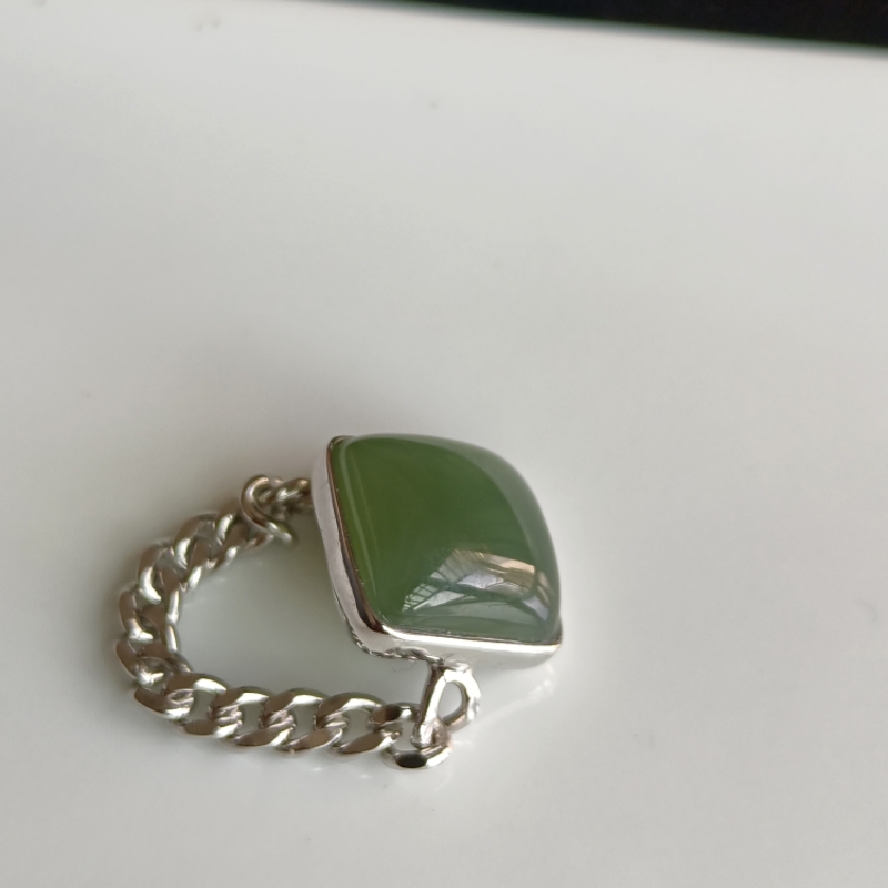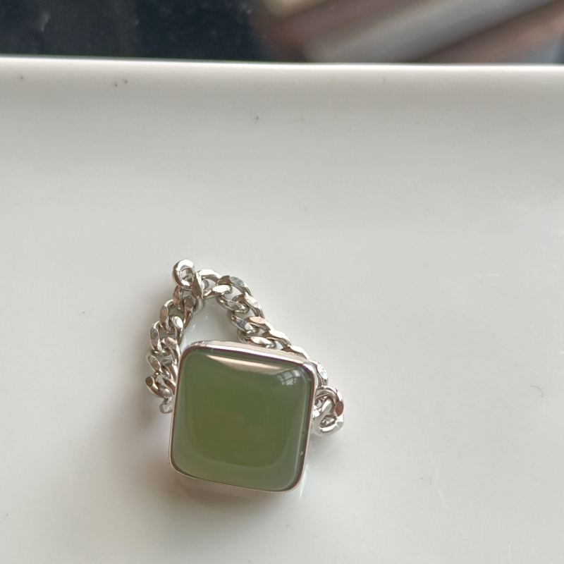 和田玉晴水绿方形戒S925银链条戒托冰透绿水润指环女款带证书