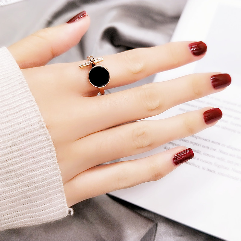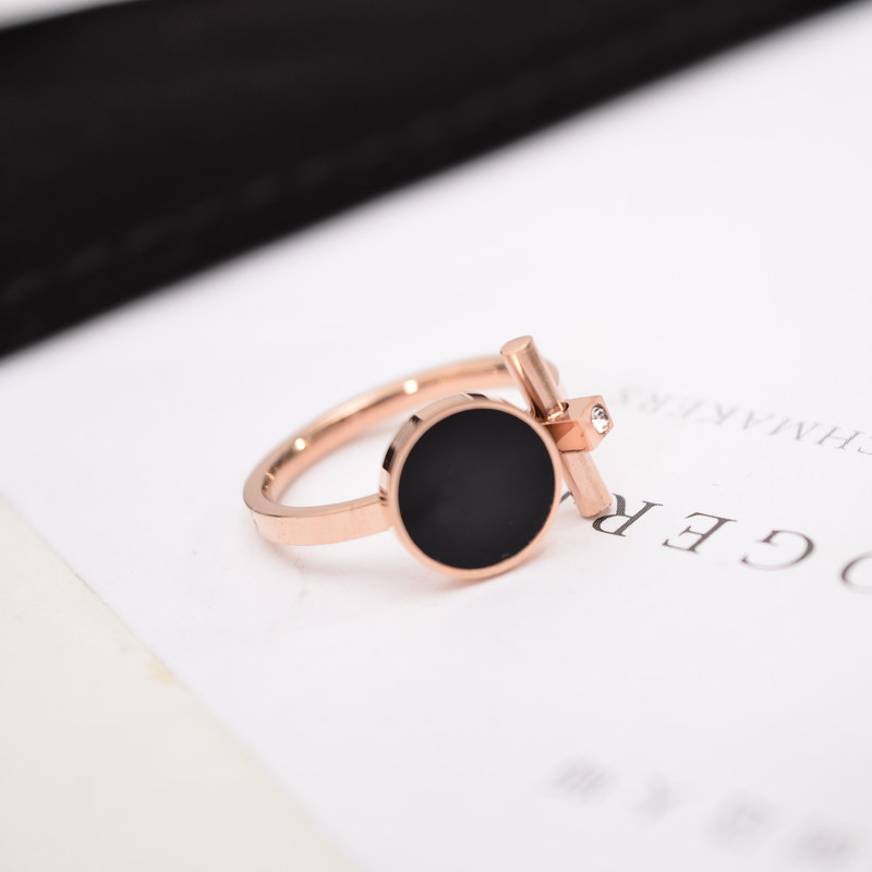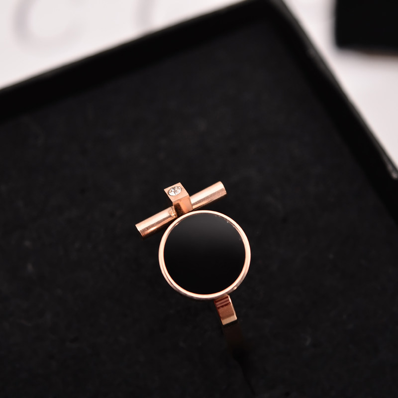 欧美时尚个性镀18k玫瑰金戒指女款黑色圆形食指环戒子钛钢潮饰品