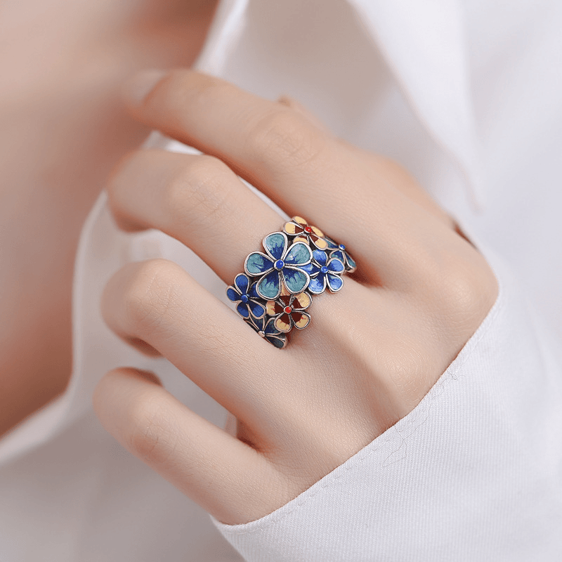 S925银景泰蓝珐琅繁花似锦戒指复古民族风创意食指指环开口可调节