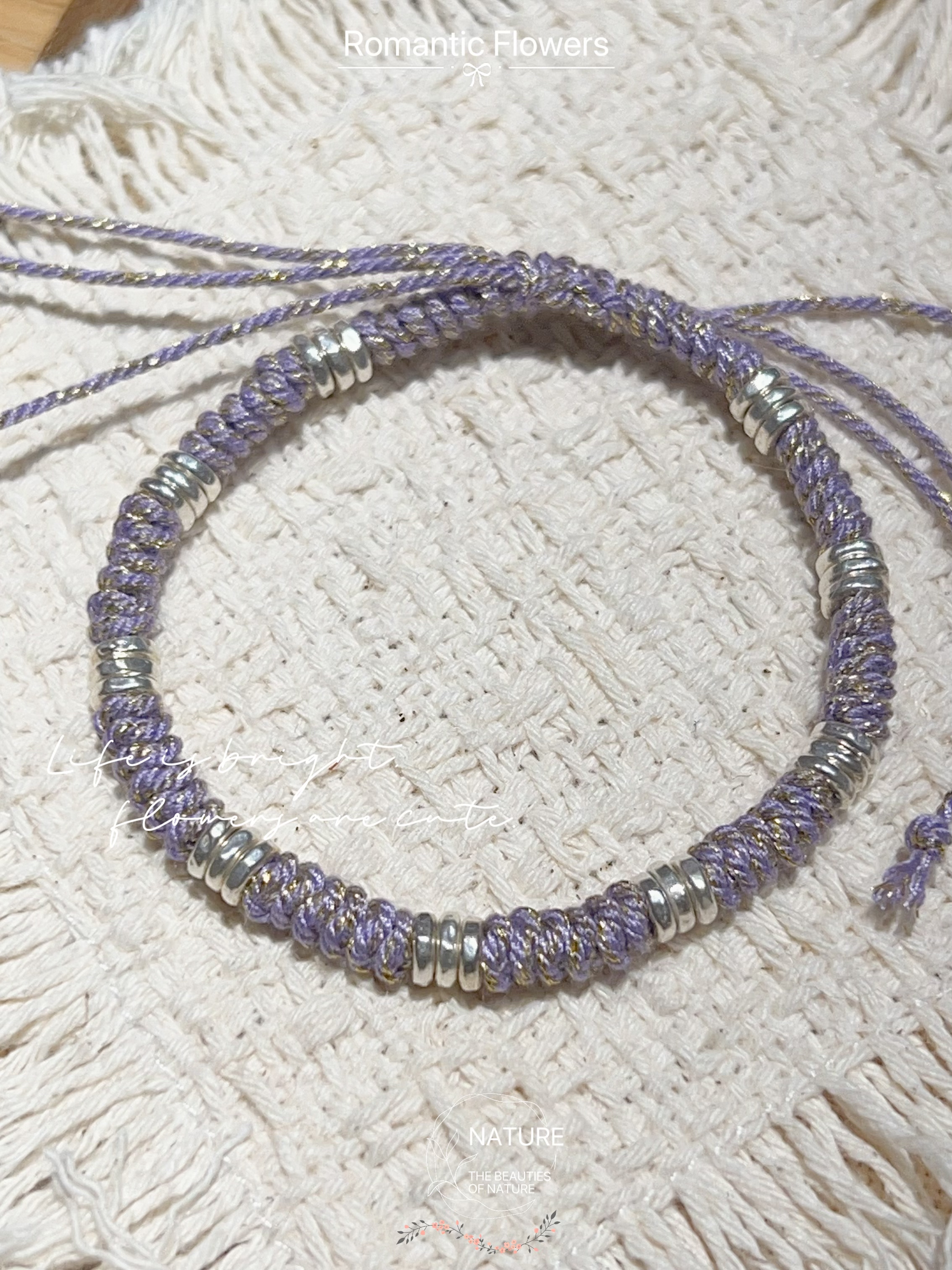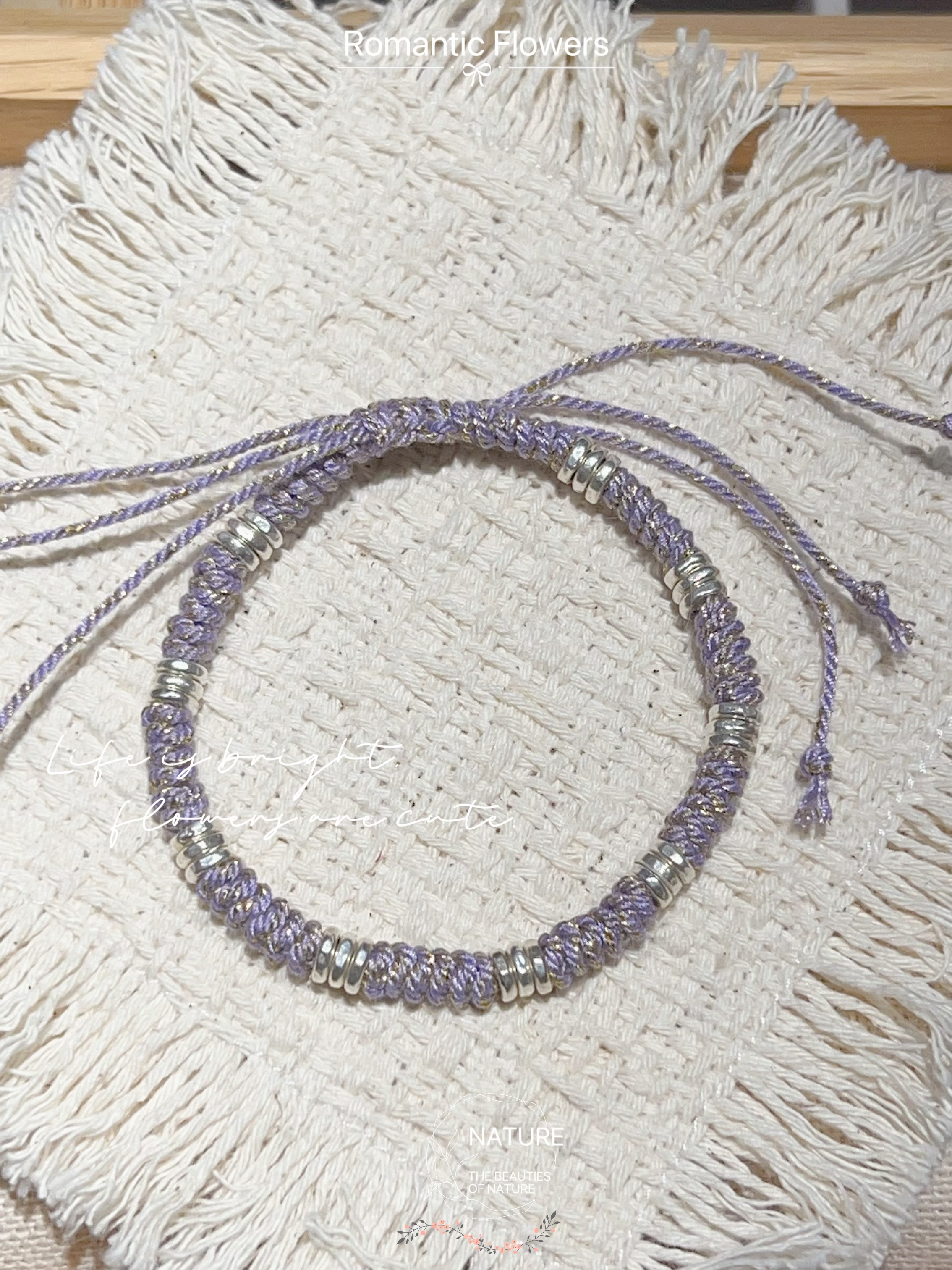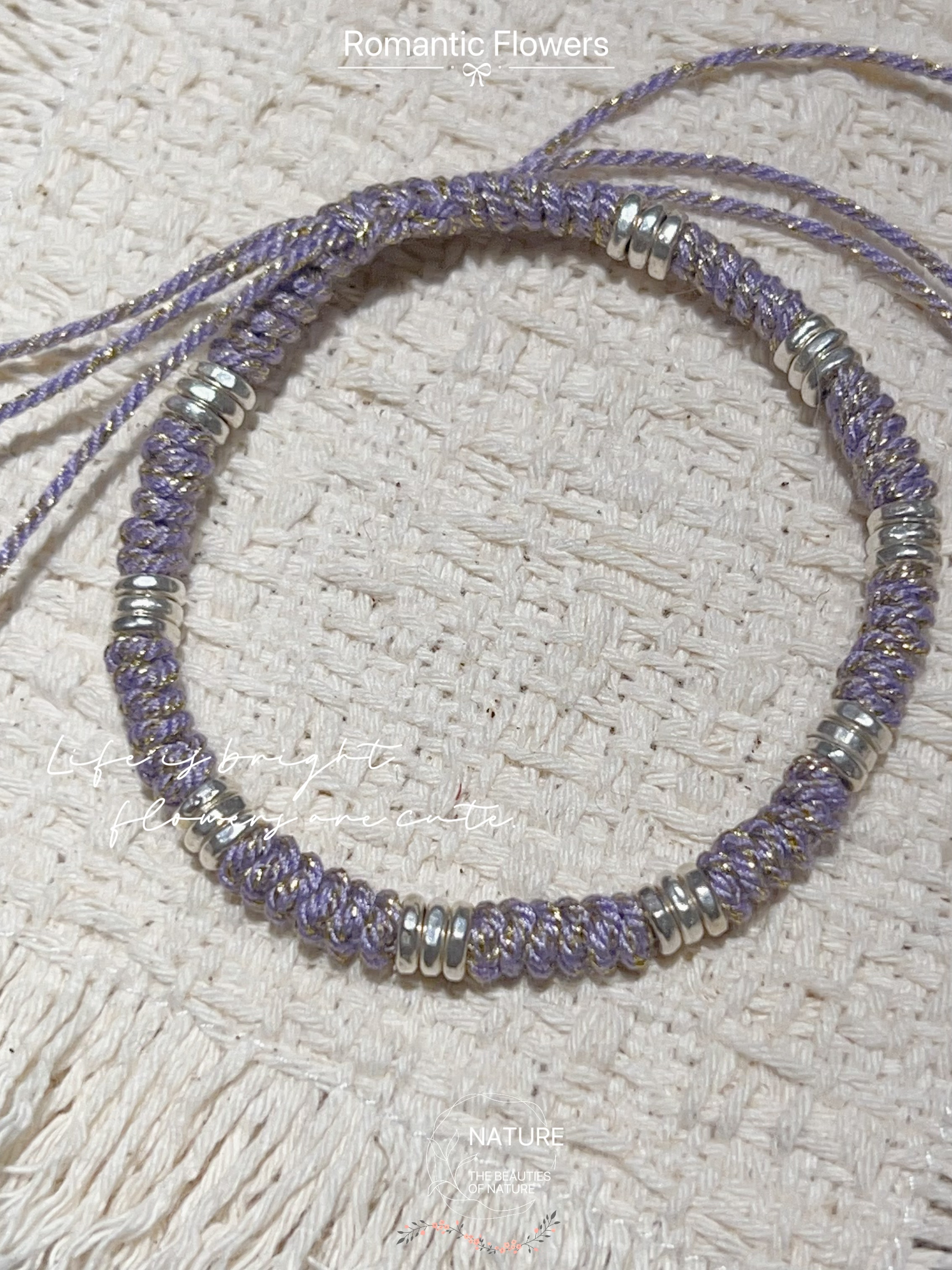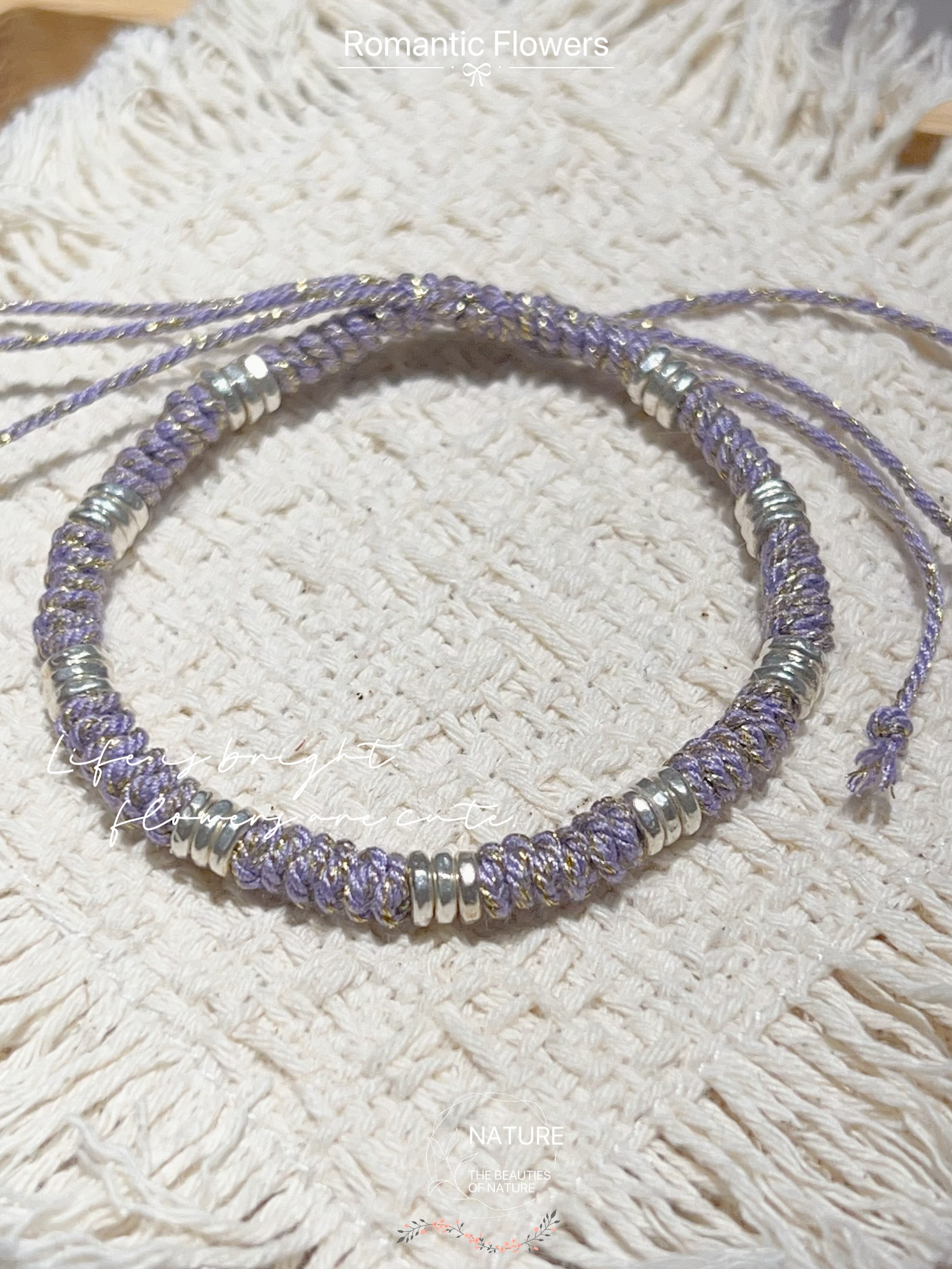紫色紫罗兰绳编手链999盘缠手串原创女款新中式美拉德抽拉绳足银