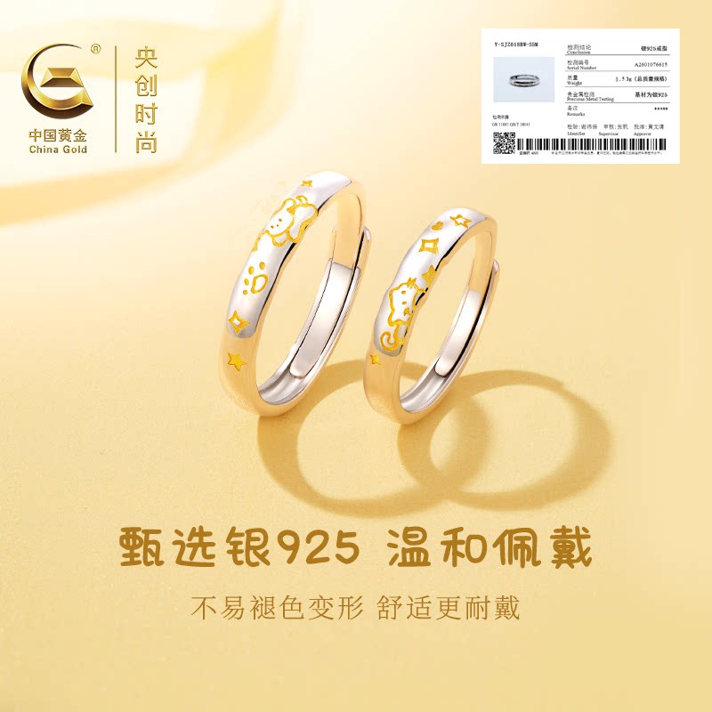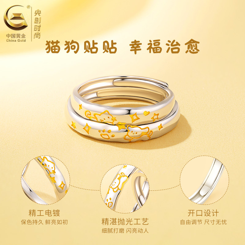 中国黄金央创情侣对戒指纯银可调节可爱生日礼物送女友男友s925