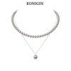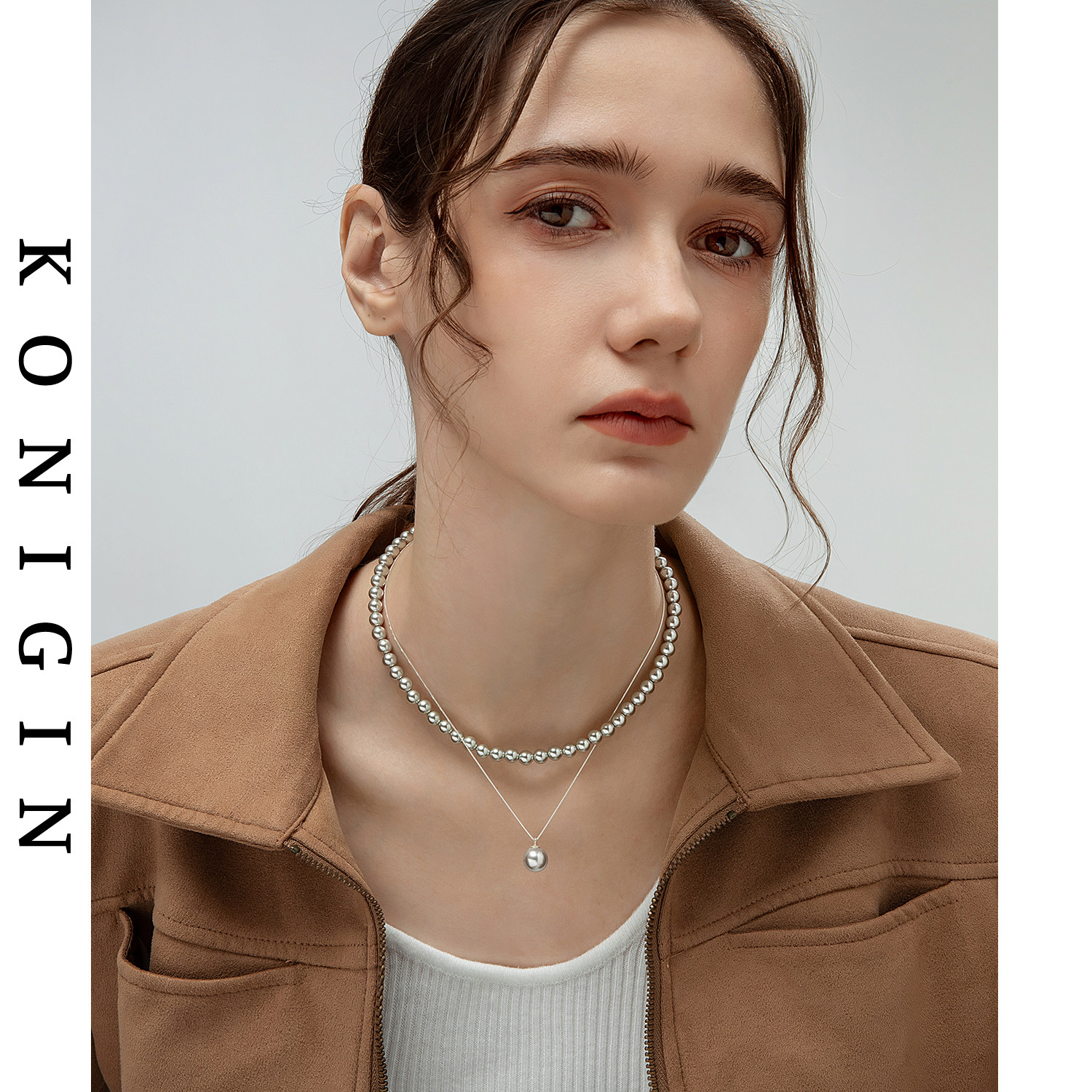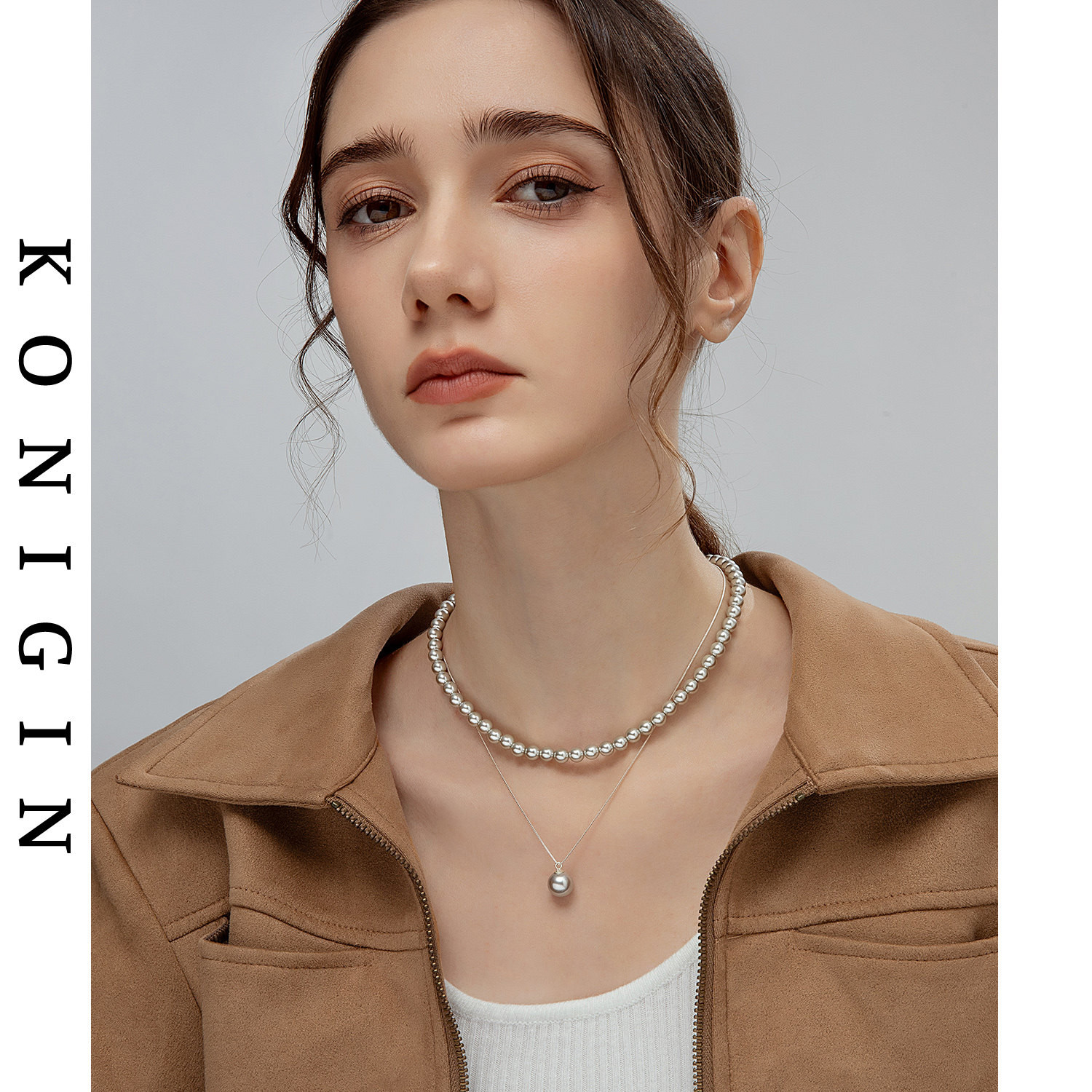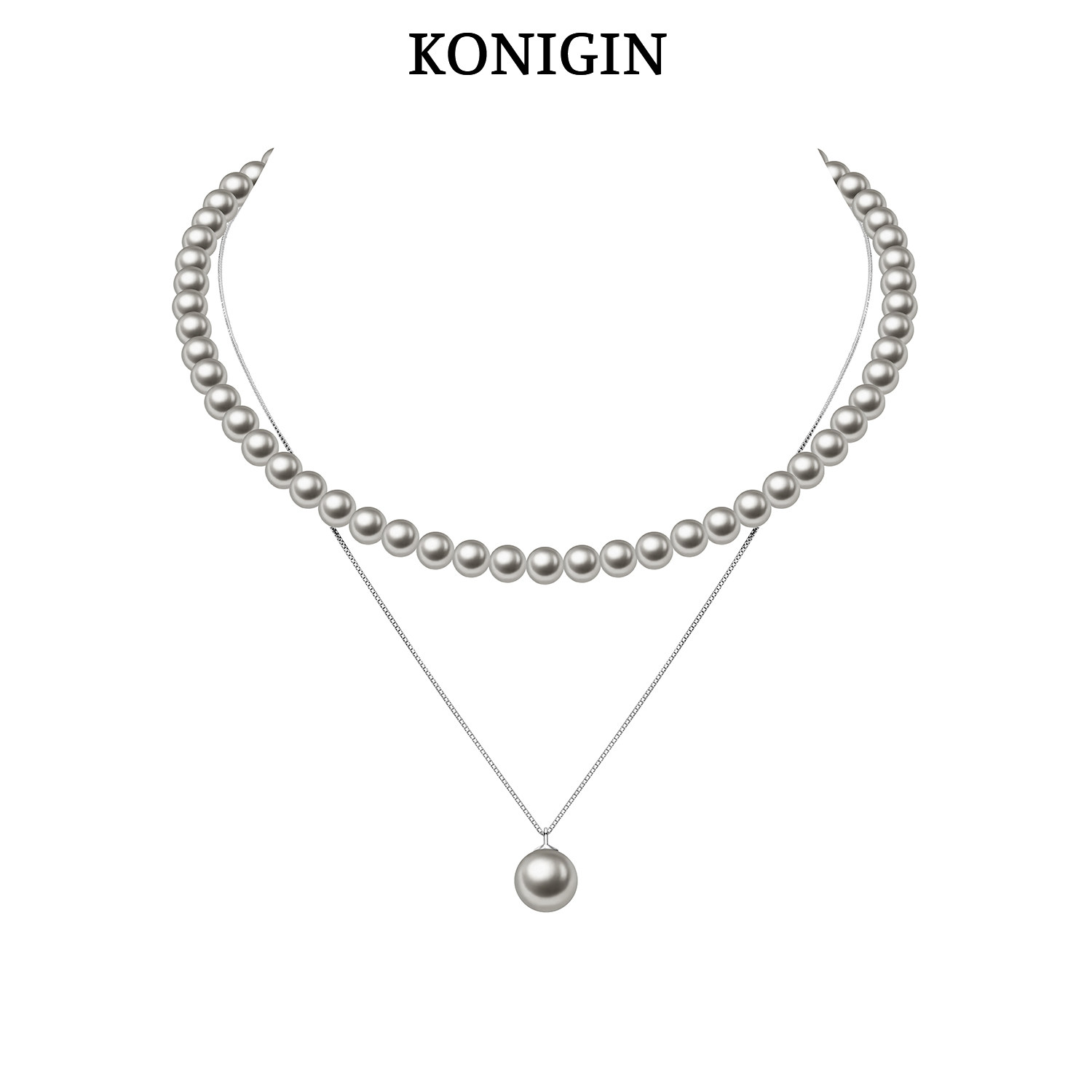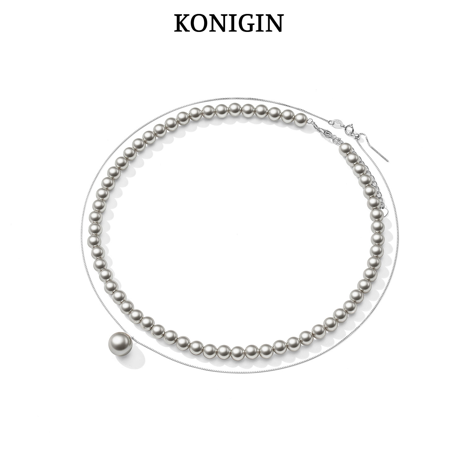 Konigin真多麻银灰色施家珍珠项链女双层叠戴925纯银锁骨链颈链