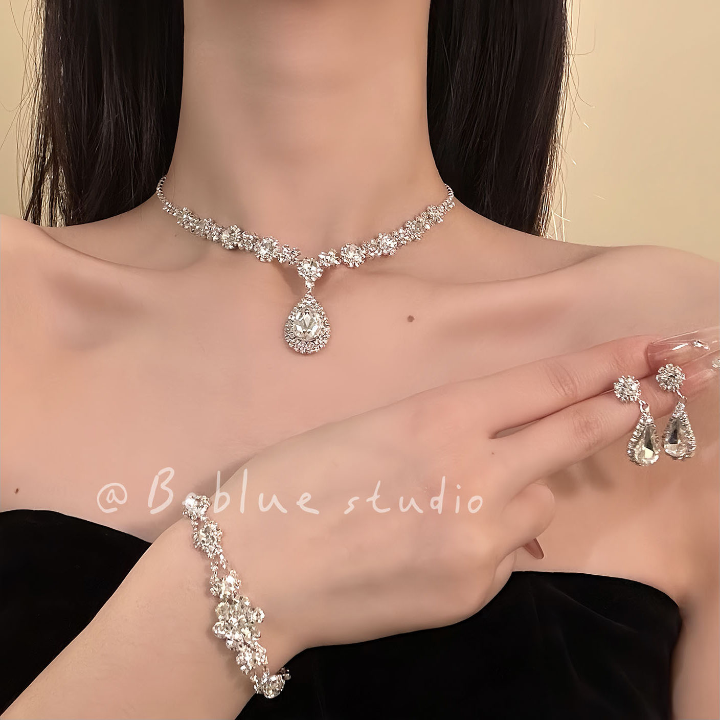锆白礼宴~满钻锆石水滴项链晚礼服颈链轻奢高级感锁骨链耳钉套装