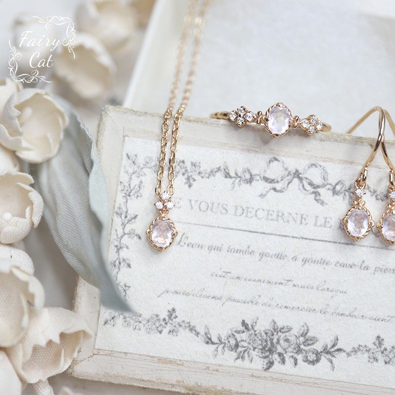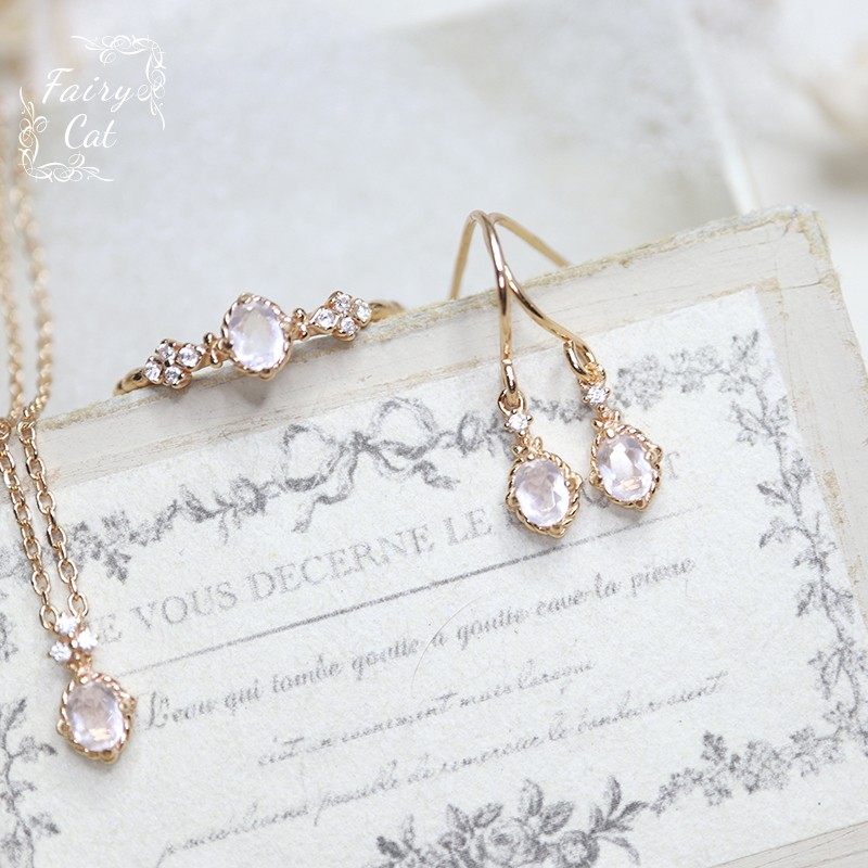 日系复古nojes*同款天然粉水晶迷你花朵耳环戒指项链S925银镀金