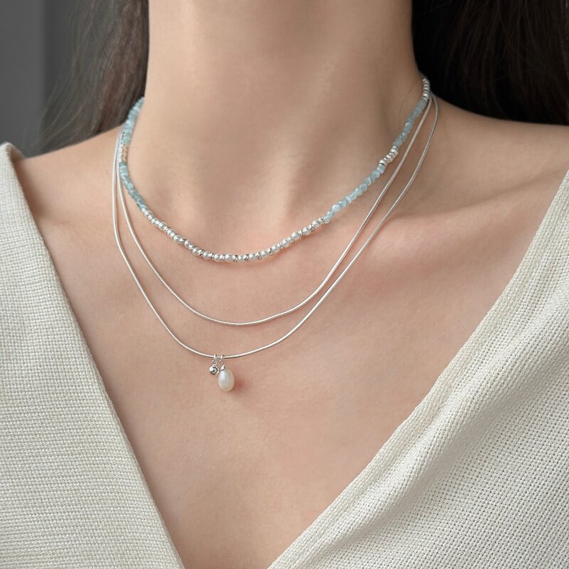 亮熙彩色度假系列碎银子蓝色串珠锁骨链小众独特高级感叠戴项链
