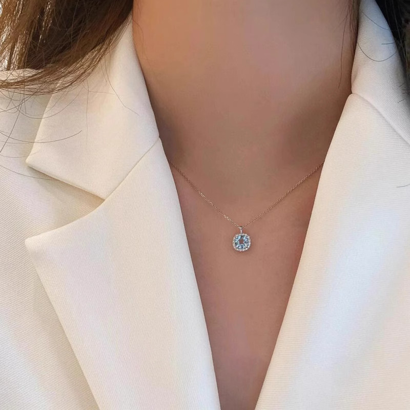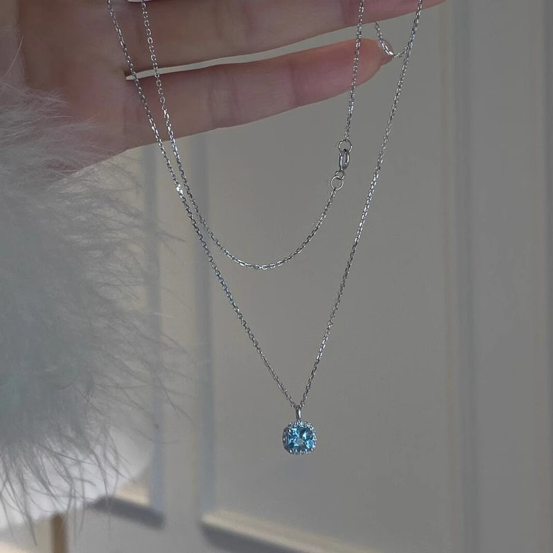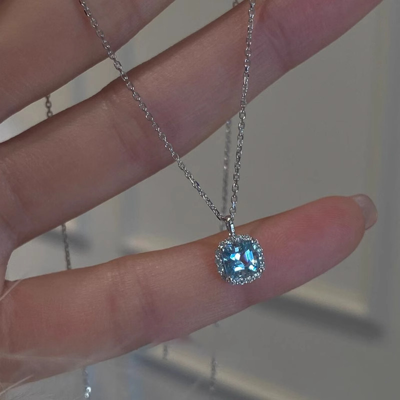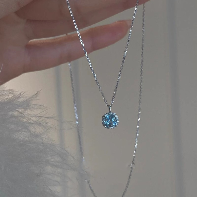 蓝色小方糖吊坠镶钻项链轻奢小众高级感锁骨链冷清感颈链锁骨链女