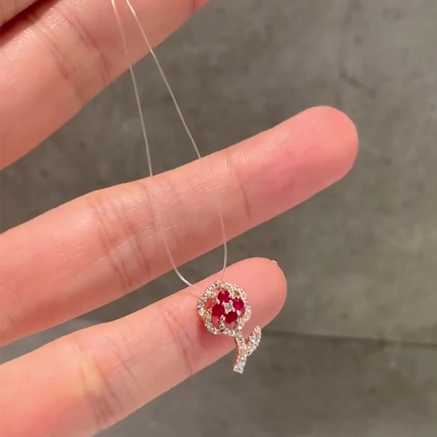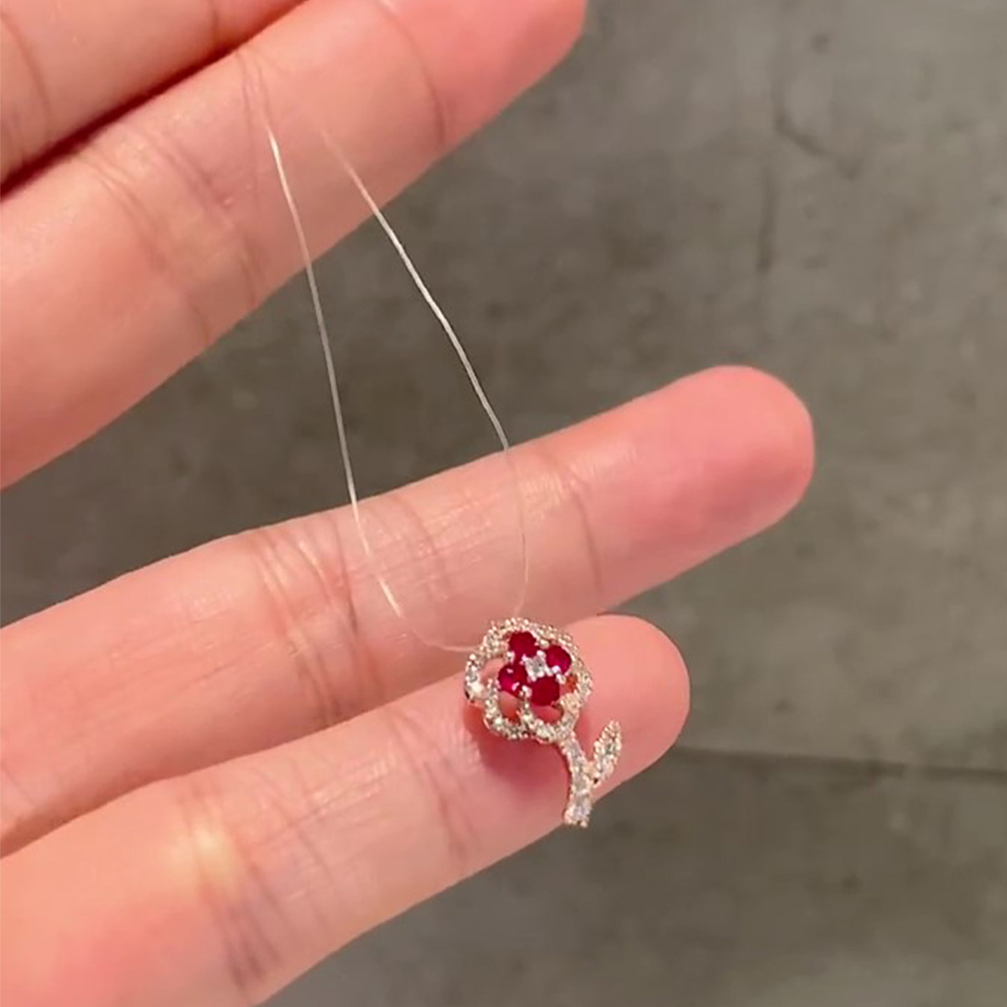 Vintage中古爆闪红色花朵仿锆石鱼线项链高级感极细毛衣链女配饰