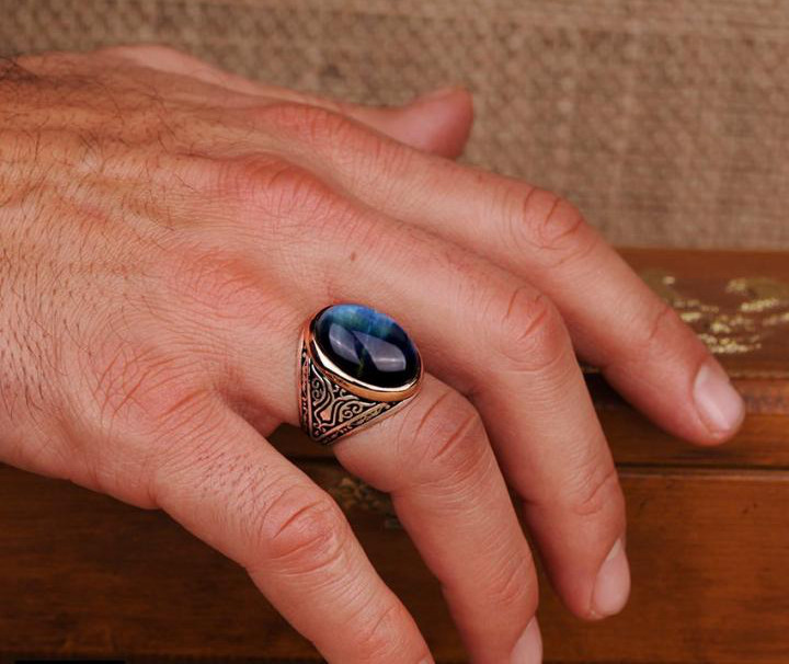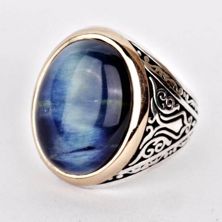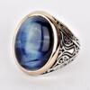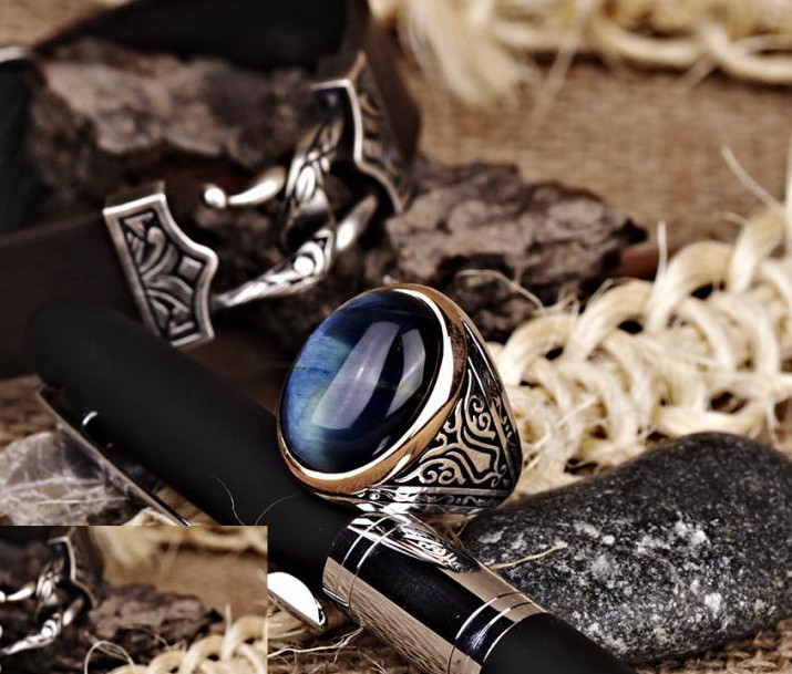 海外代购Engraved◇手作复古蓝色虎眼石宝石银雕刻花纹男士戒指