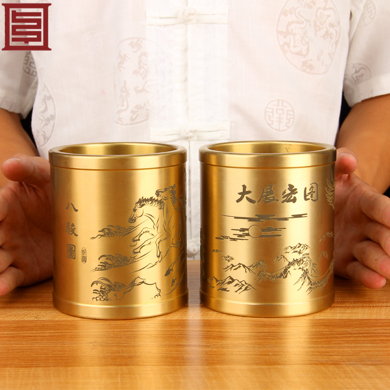 大号铜实心笔筒摆件配实木底座办公桌摆件