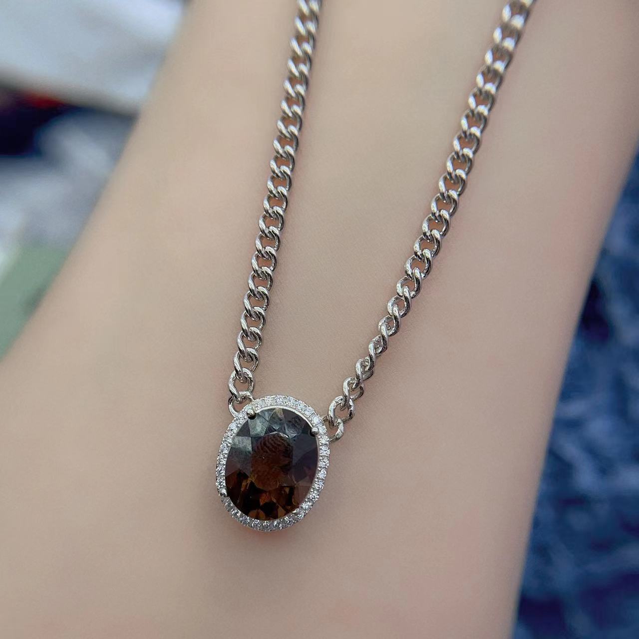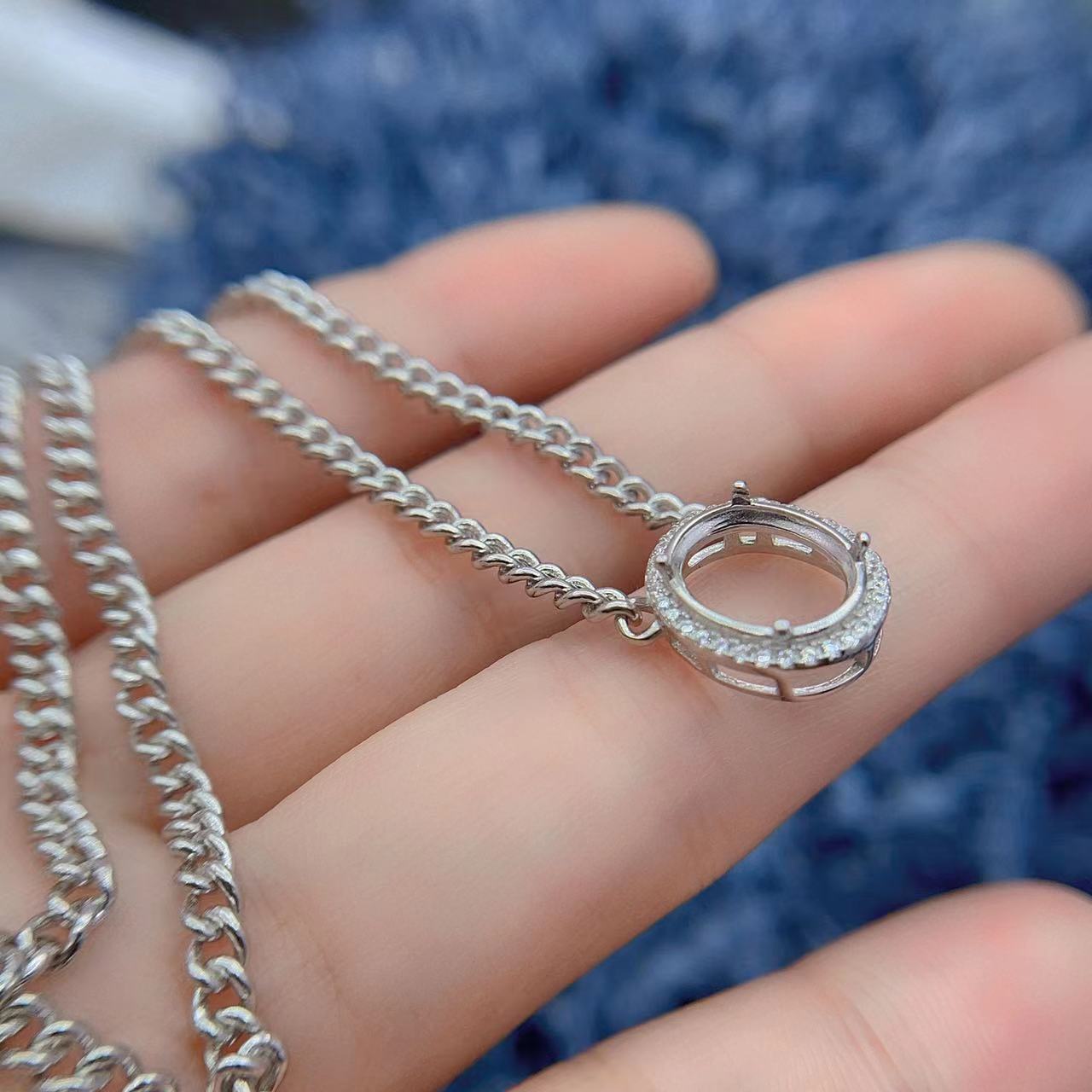 S925银项链椭圆形9*11mm大尺寸镶嵌蜜蜡和田玉锁骨链纯银空托