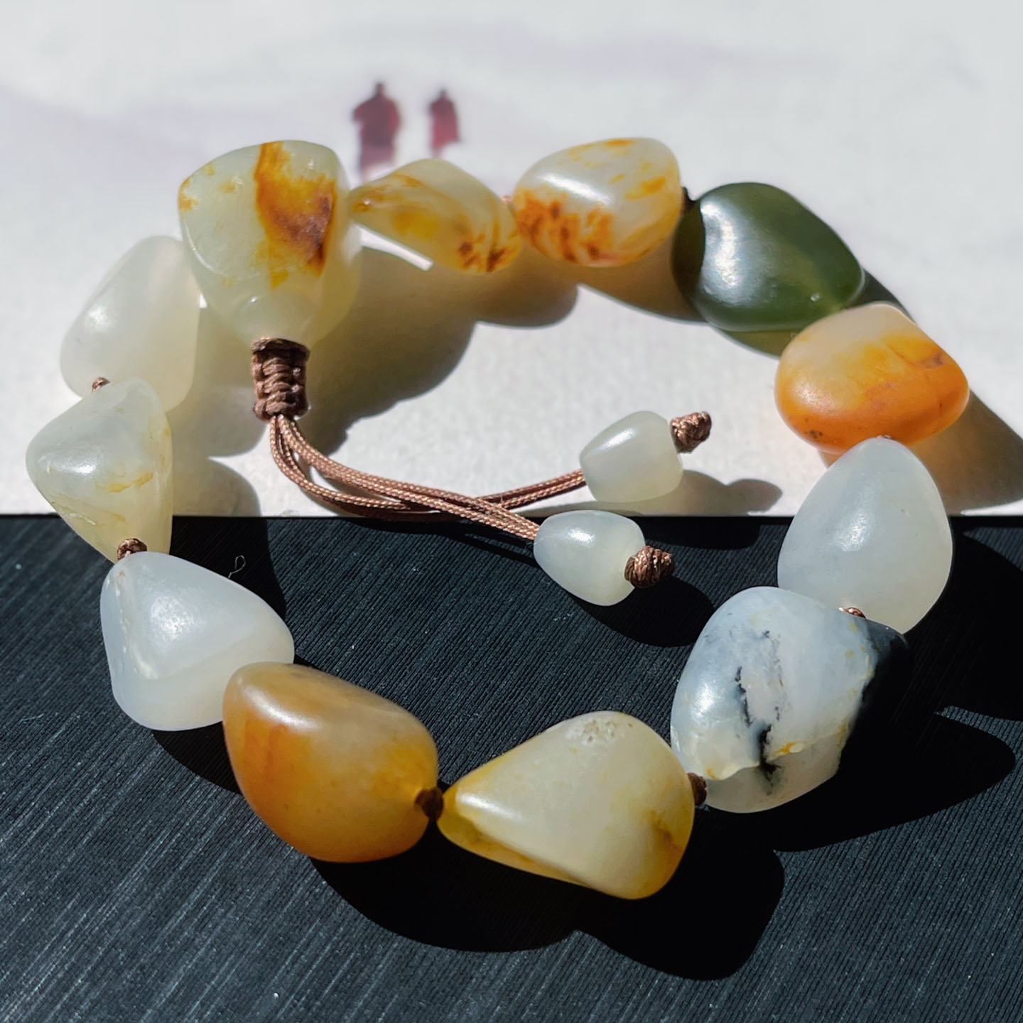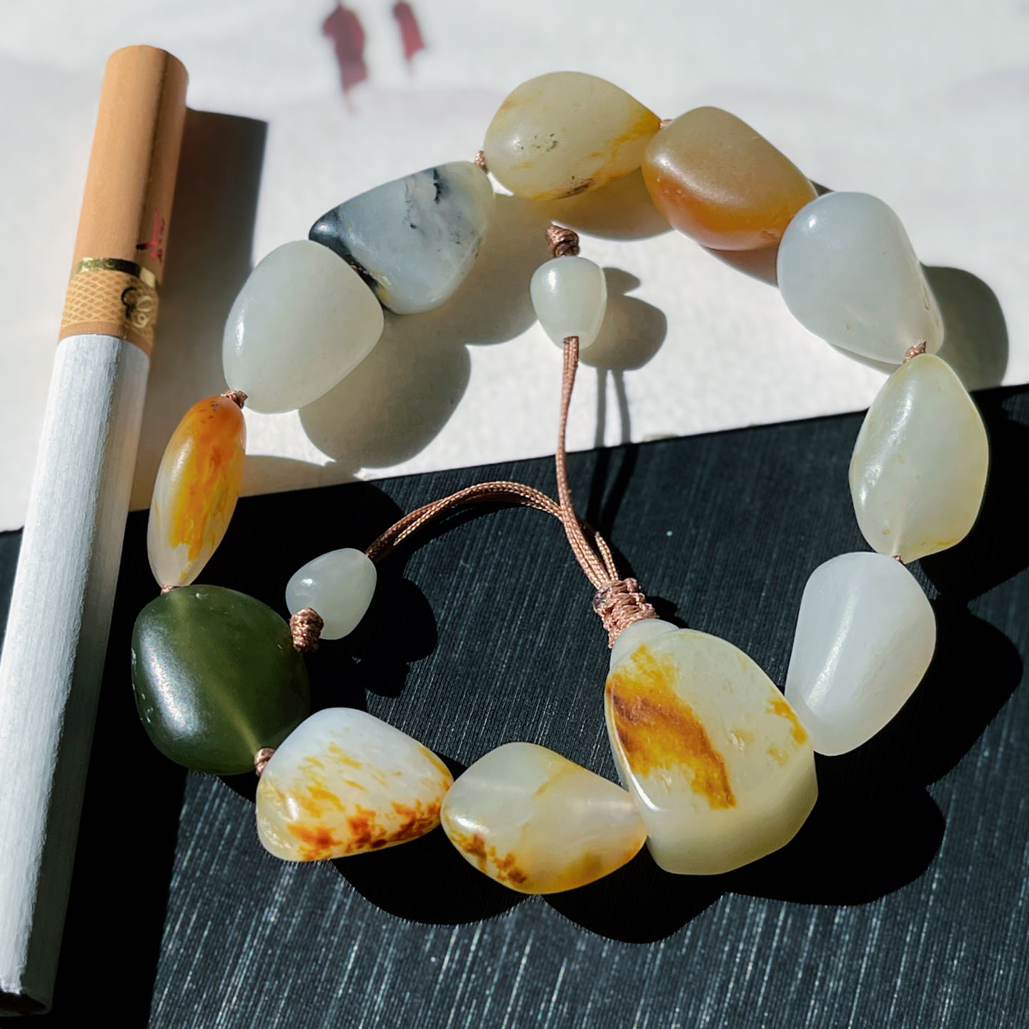 抢疯方言和田玉特色玉龙河老熟如酥挂金皮多宝白玉籽料原石手串w1