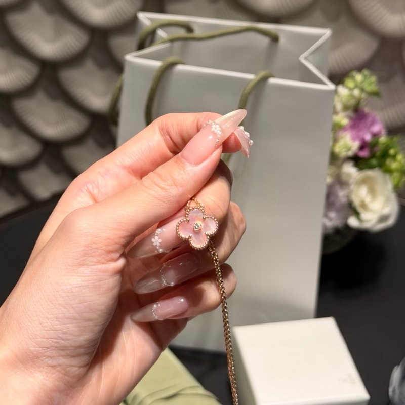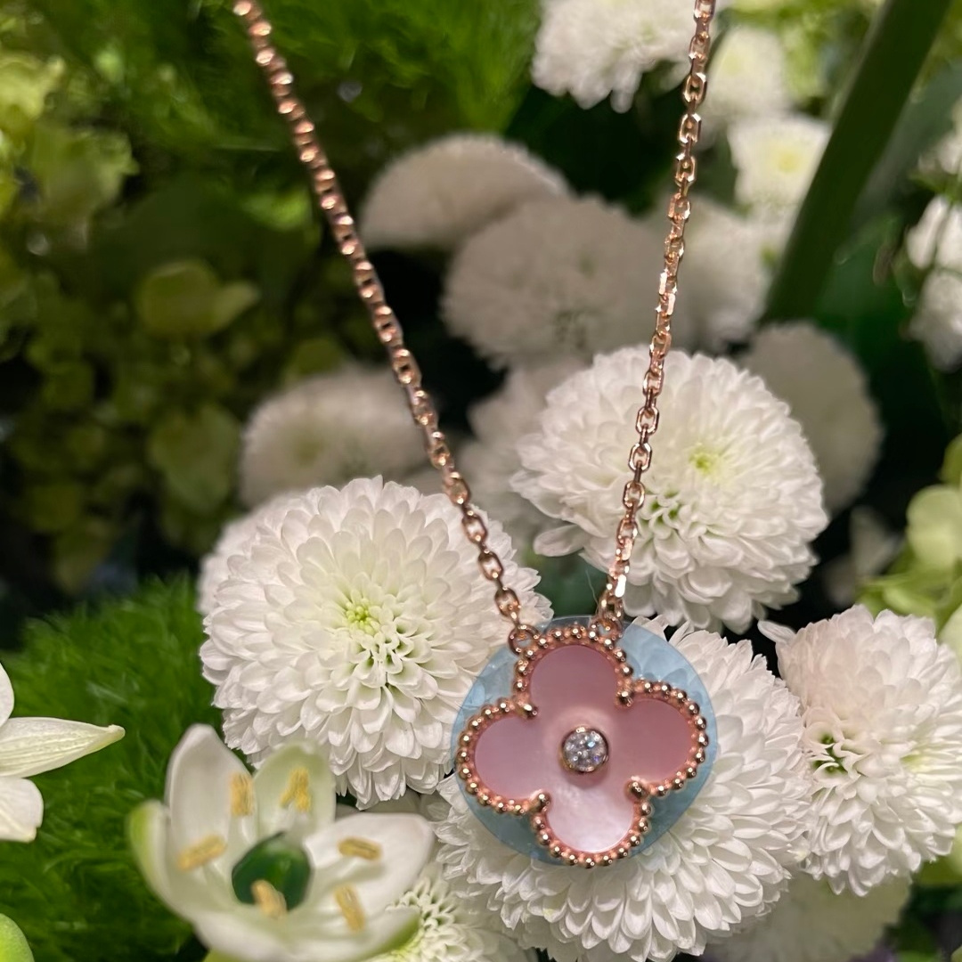 新款2025圣诞限定四叶草项链18k玫瑰金幻彩粉贝母钻石锁骨链女