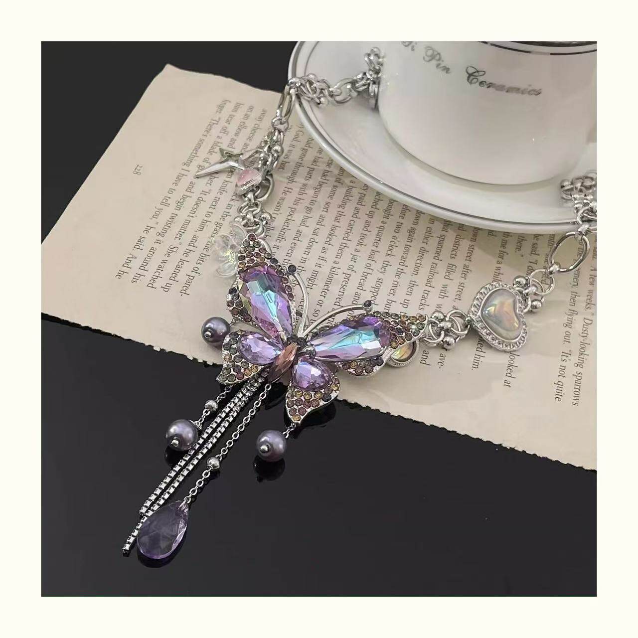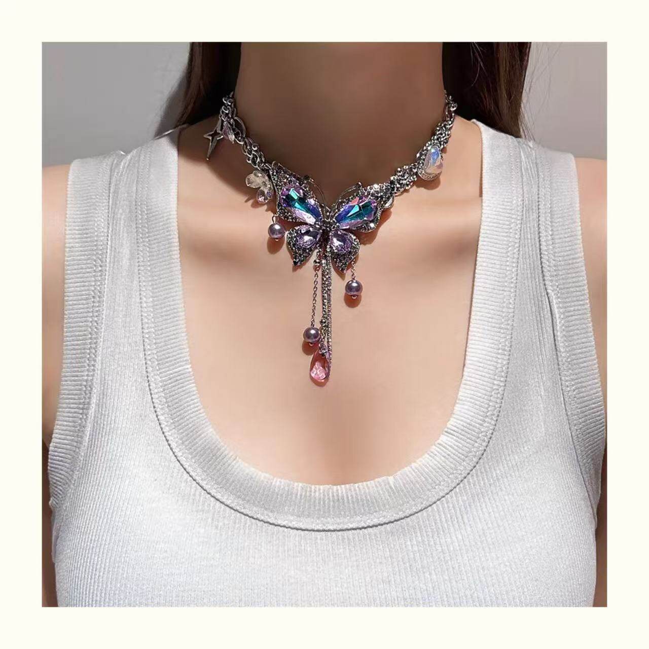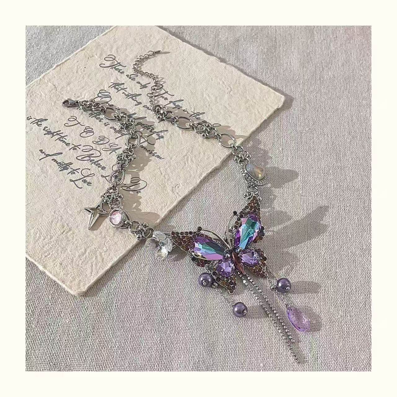 百搭紫色甜美时尚锁骨链女流苏多巴胺精致镶钻小众女蝴蝶