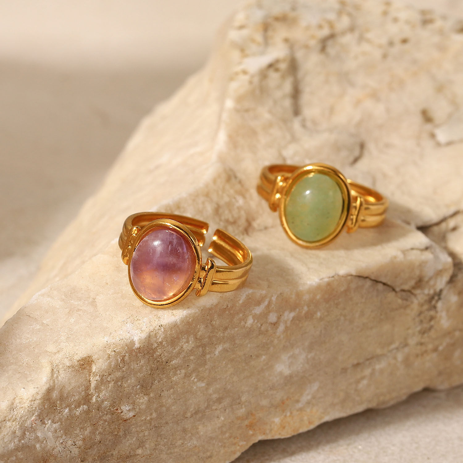 防水不锈钢18K金椭圆绿色/紫色半宝石开口戒指时尚首饰指环饰品女