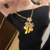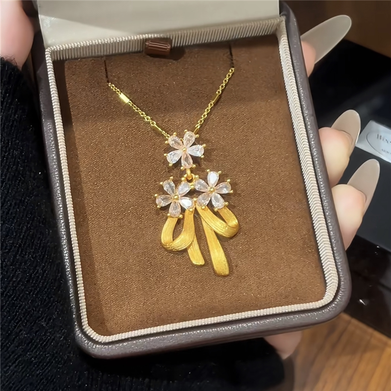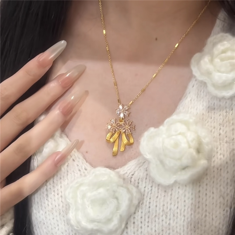 闪闪发光点钻拉丝蝴蝶结桃花吊坠项链女仿真黄金精致不掉色锁骨链